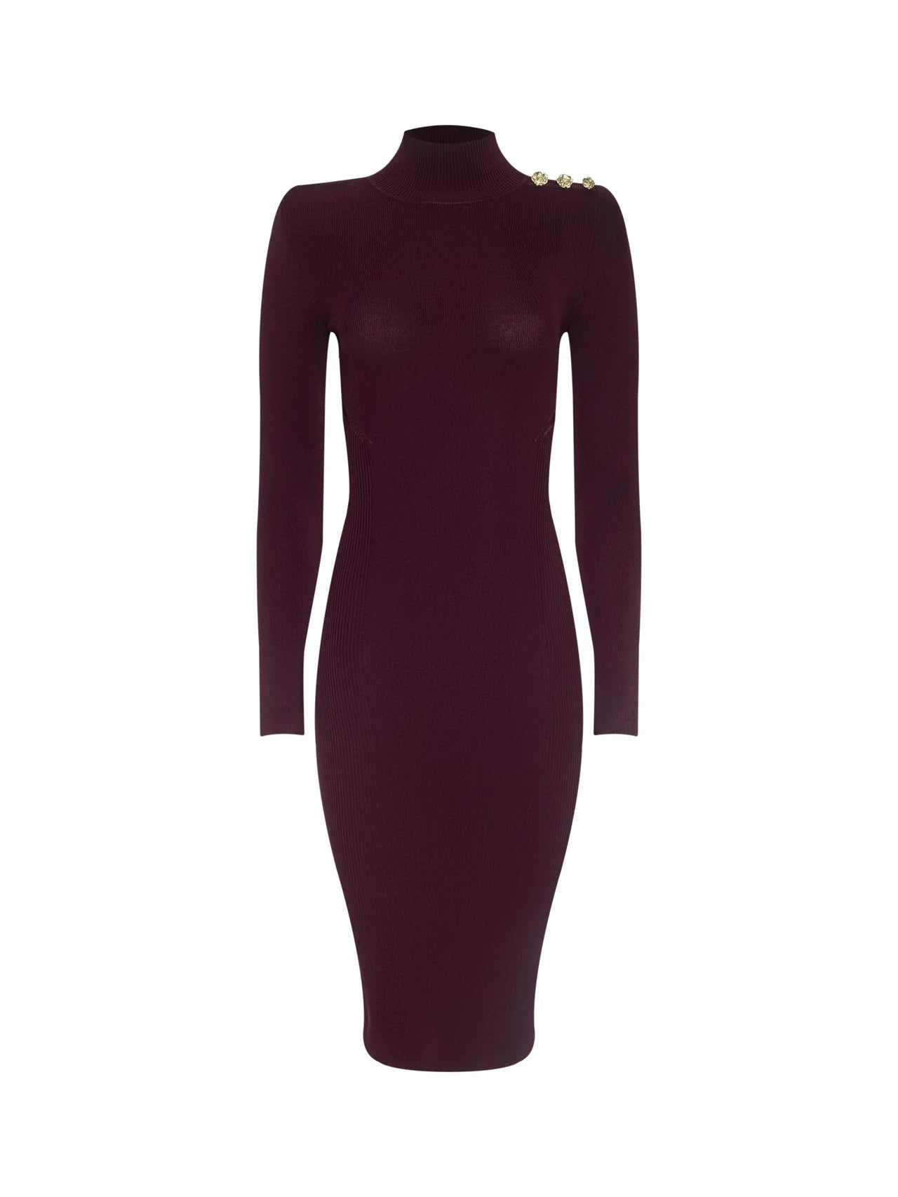 The Larelle mock neck dress embodies sleek sophistication with its body-contouring ribbed knit that flatters from every angle. Polished gold crest buttons at the shoulder add a hint of glamour, elevating the minimalist shape with statement detail. Perfect for day-to-night, it pairs well with everything from knee-high boots to strappy heels. Now in maroon.