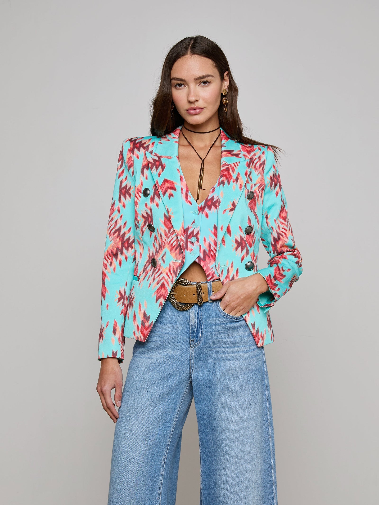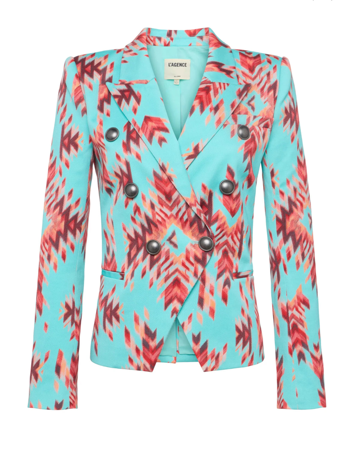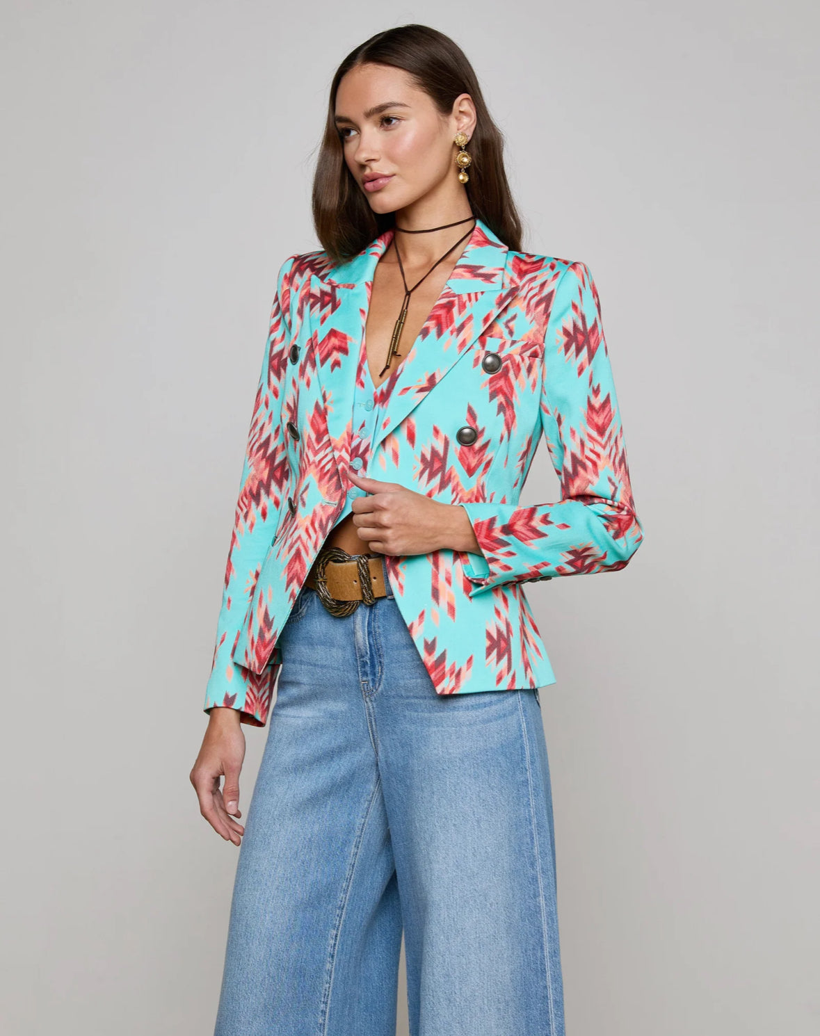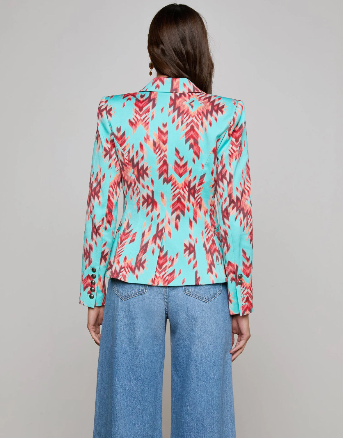 An ultra-flattering double-breasted blazer featuring a defined, cinched waist. Now in a vibrant geometric print.