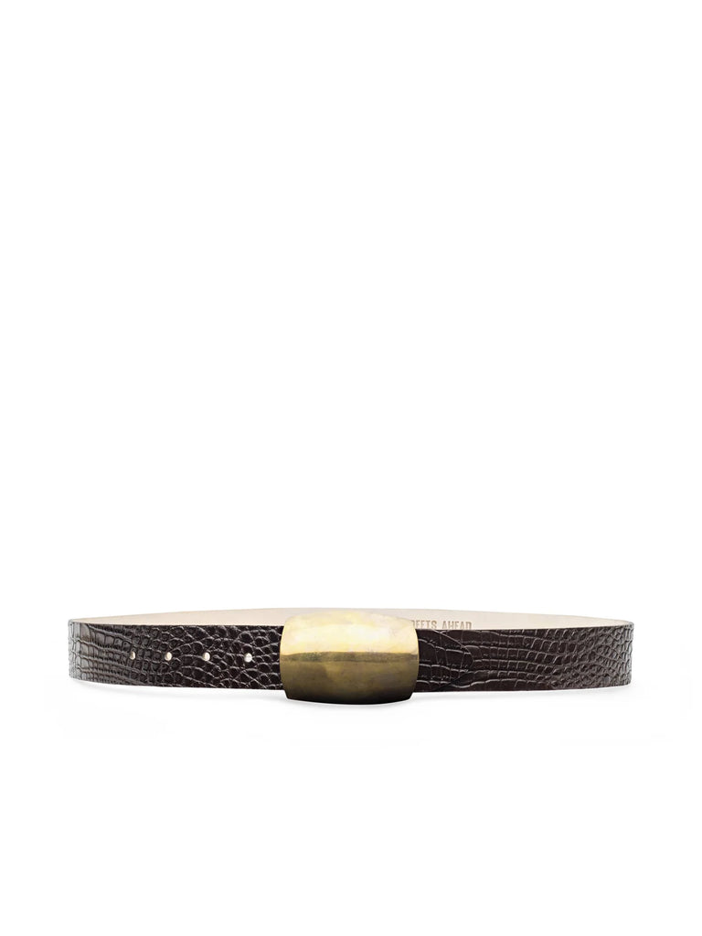 A domed brass buckle adds depth and dimension to this substantial croc-embossed belt. Now in chocolate brown.