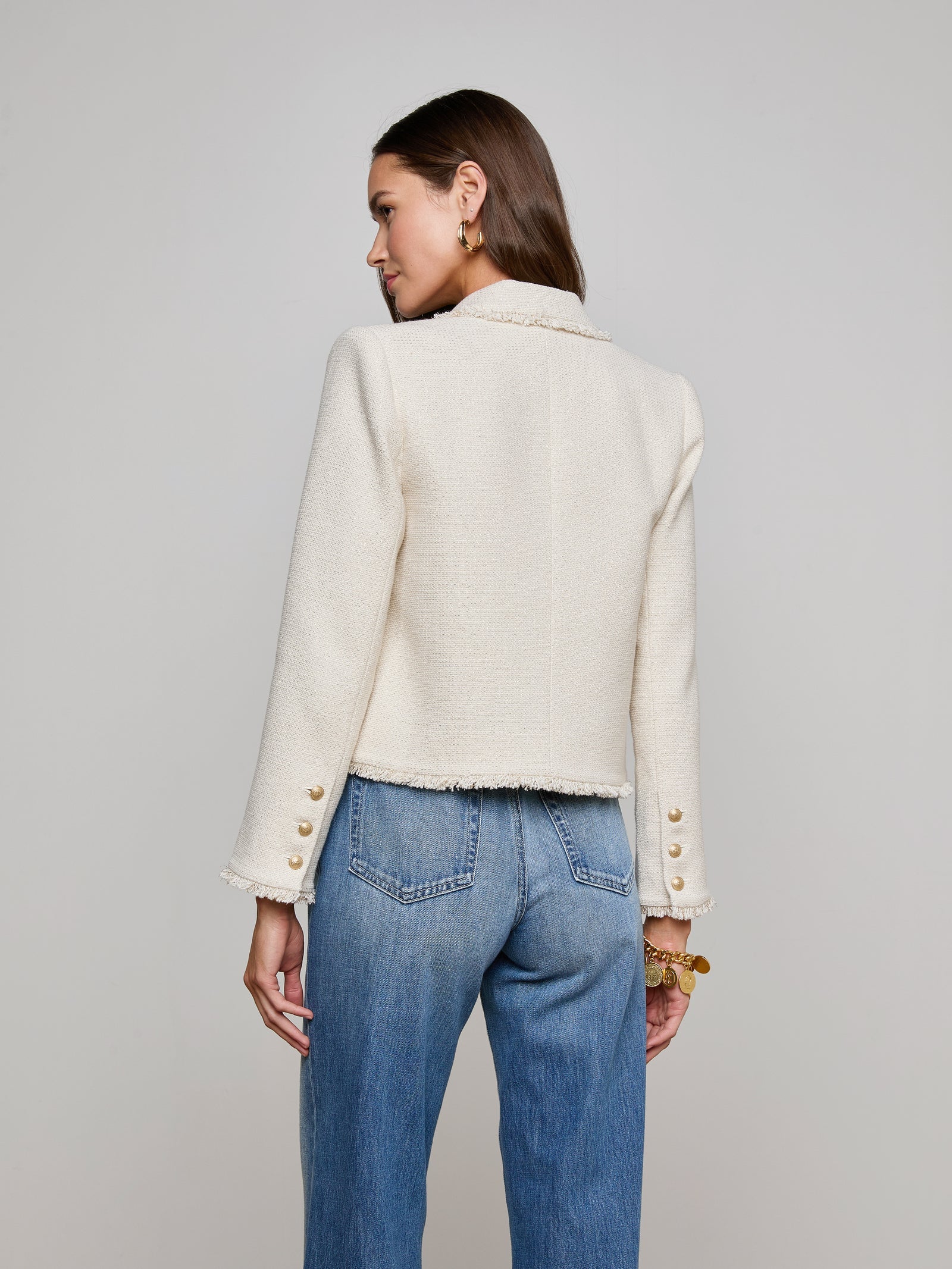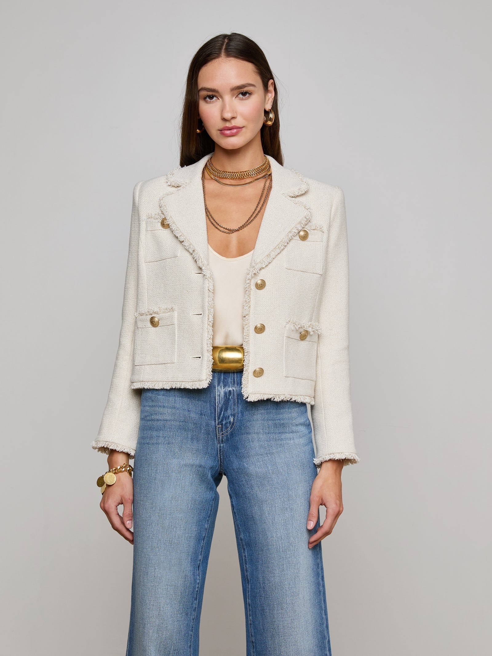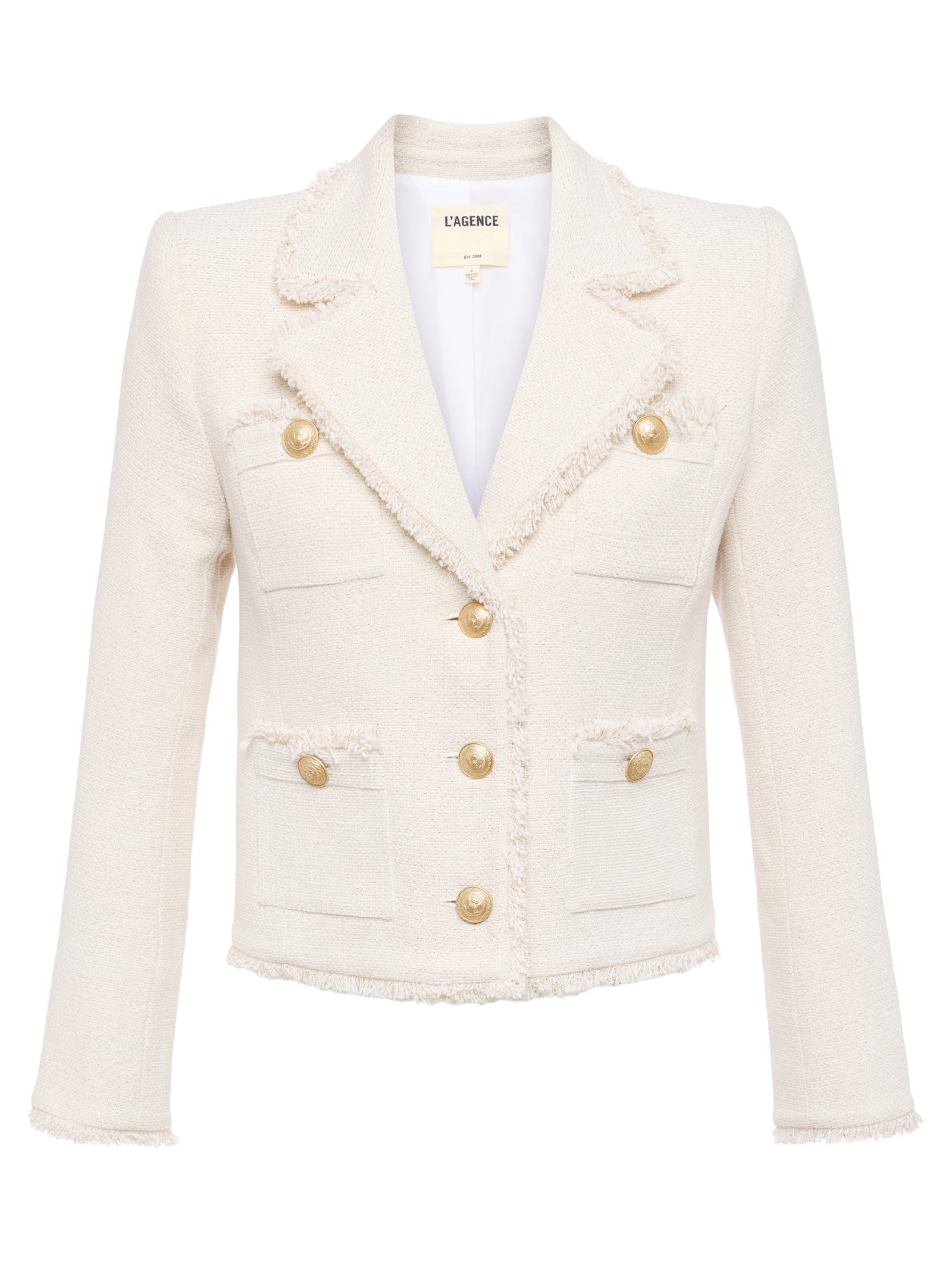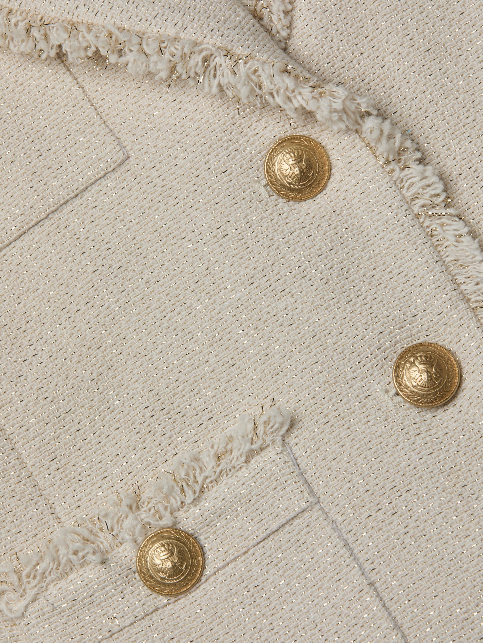 A luxe fabrication meets a classic cut in the Sylvia jacket. Fringed trims and embossed gold buttons complete its look.