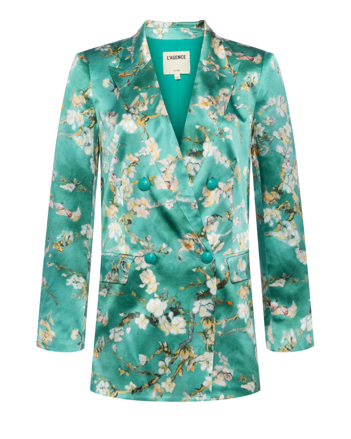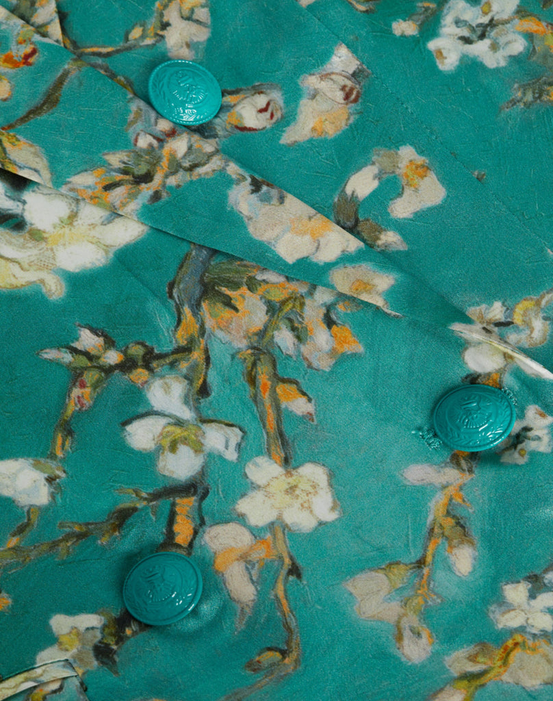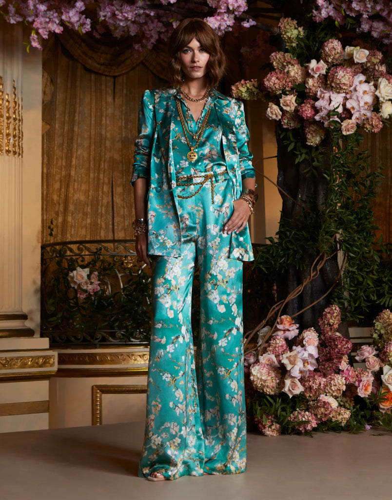 The Taryn debuted at our Spring ’25 NYFW presentation. This double-breasted blazer is crafted from lustrous silk charmeuse in a teal cherry blossom print.