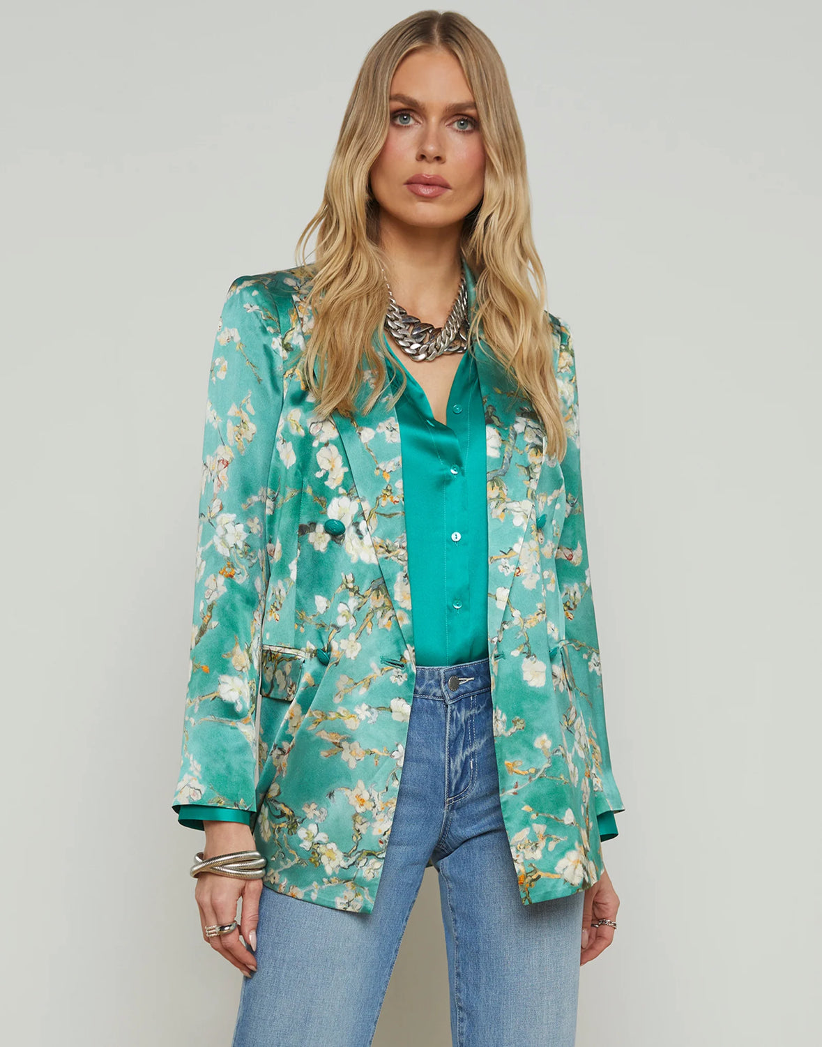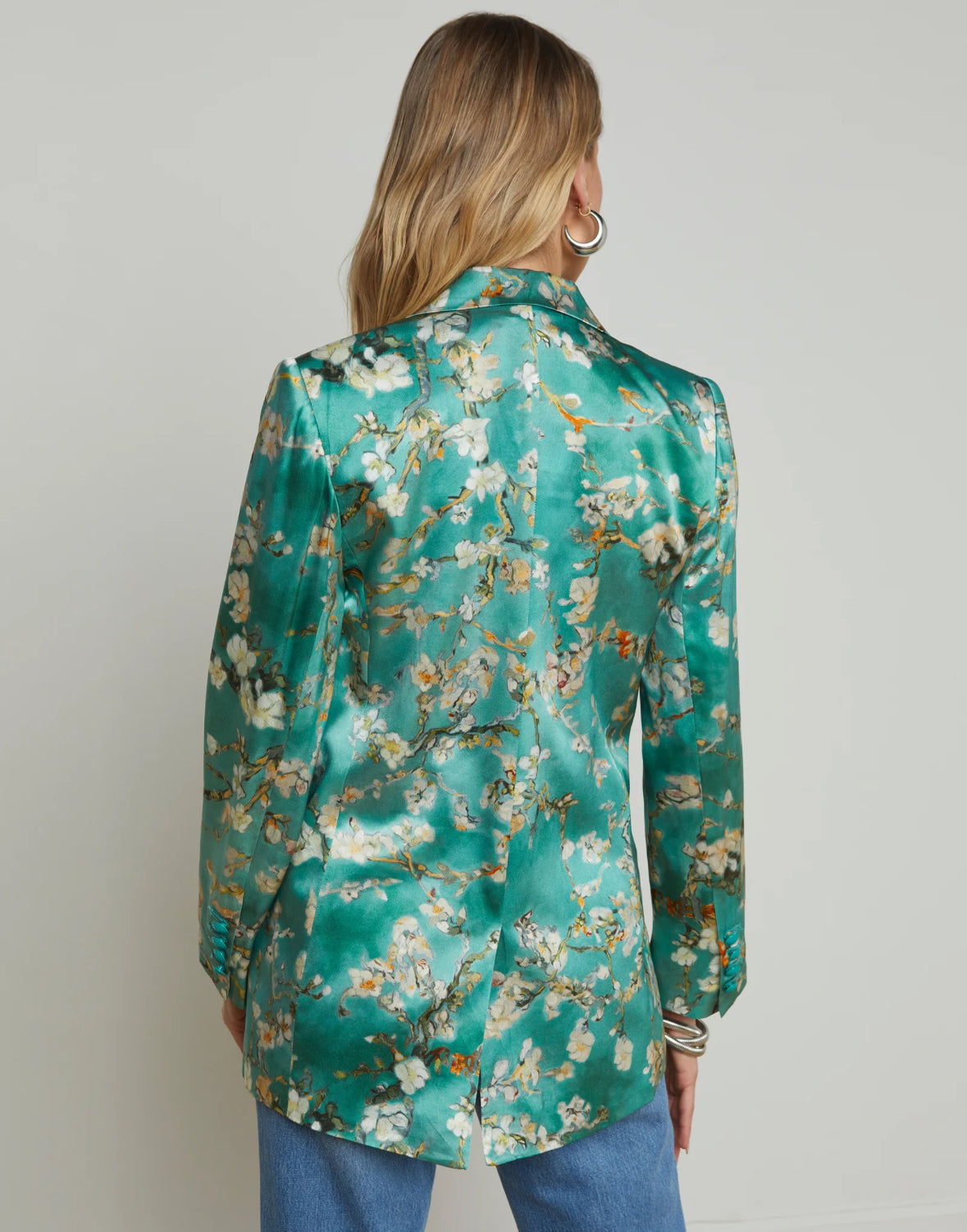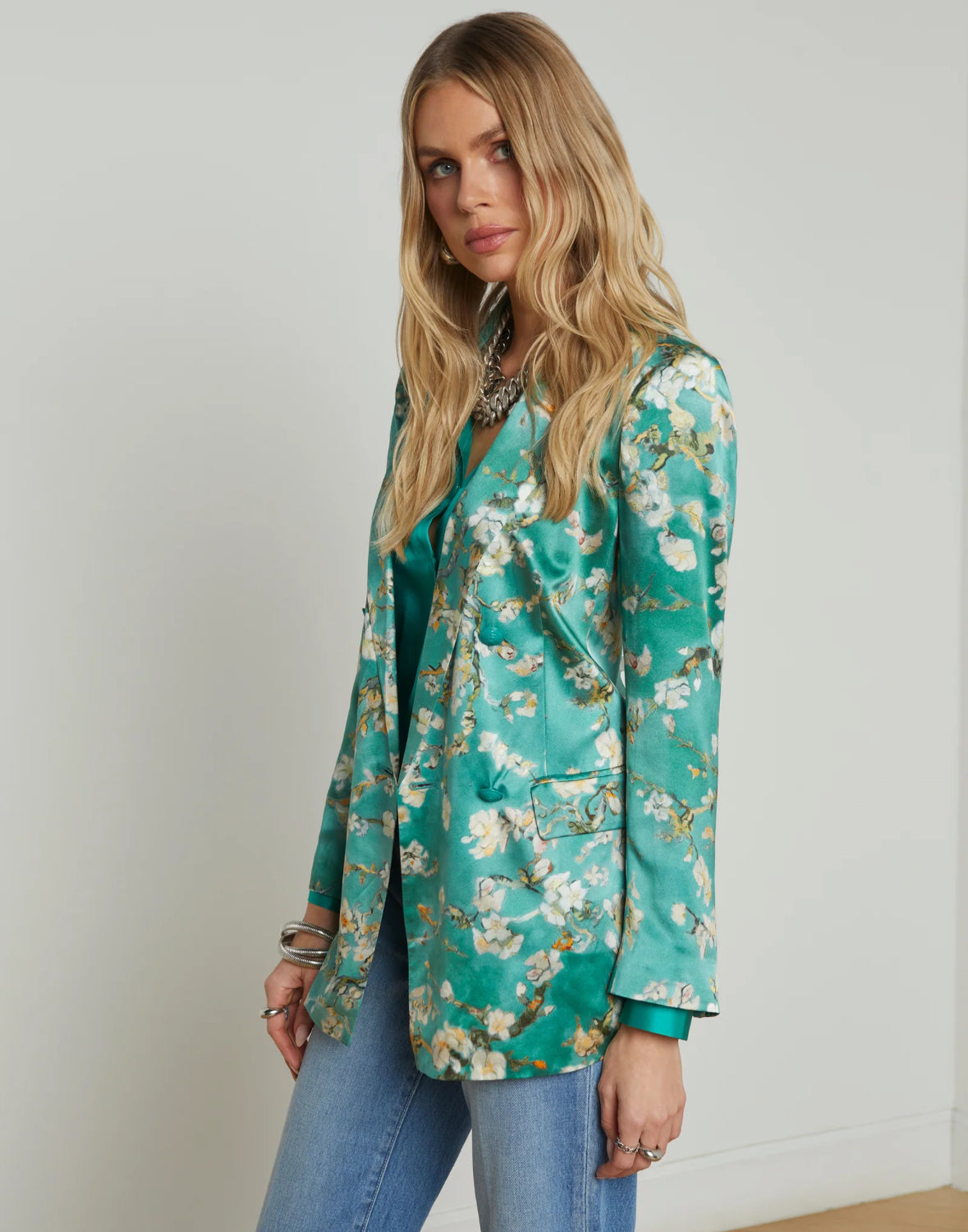 The Taryn debuted at our Spring ’25 NYFW presentation. This double-breasted blazer is crafted from lustrous silk charmeuse in a teal cherry blossom print.