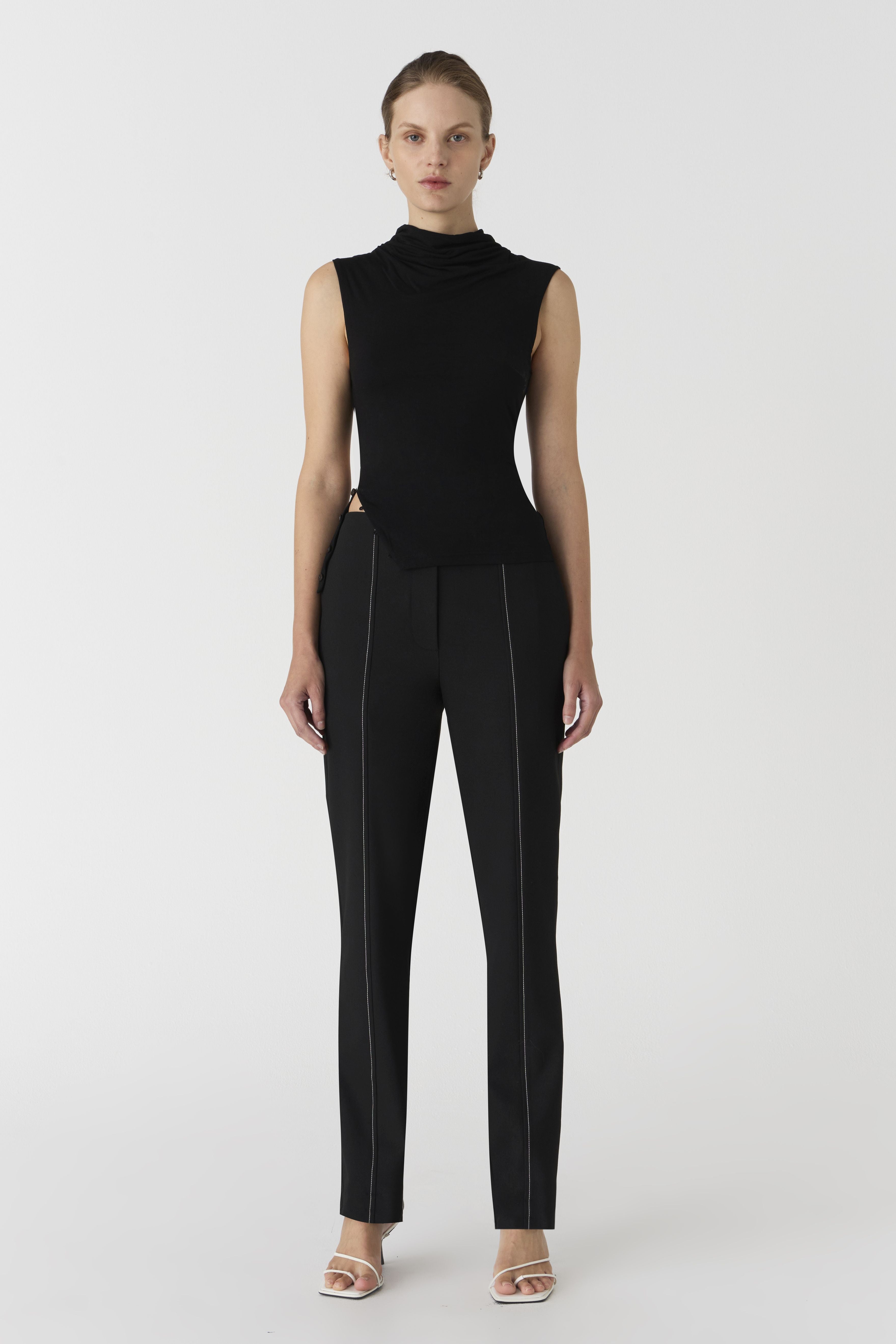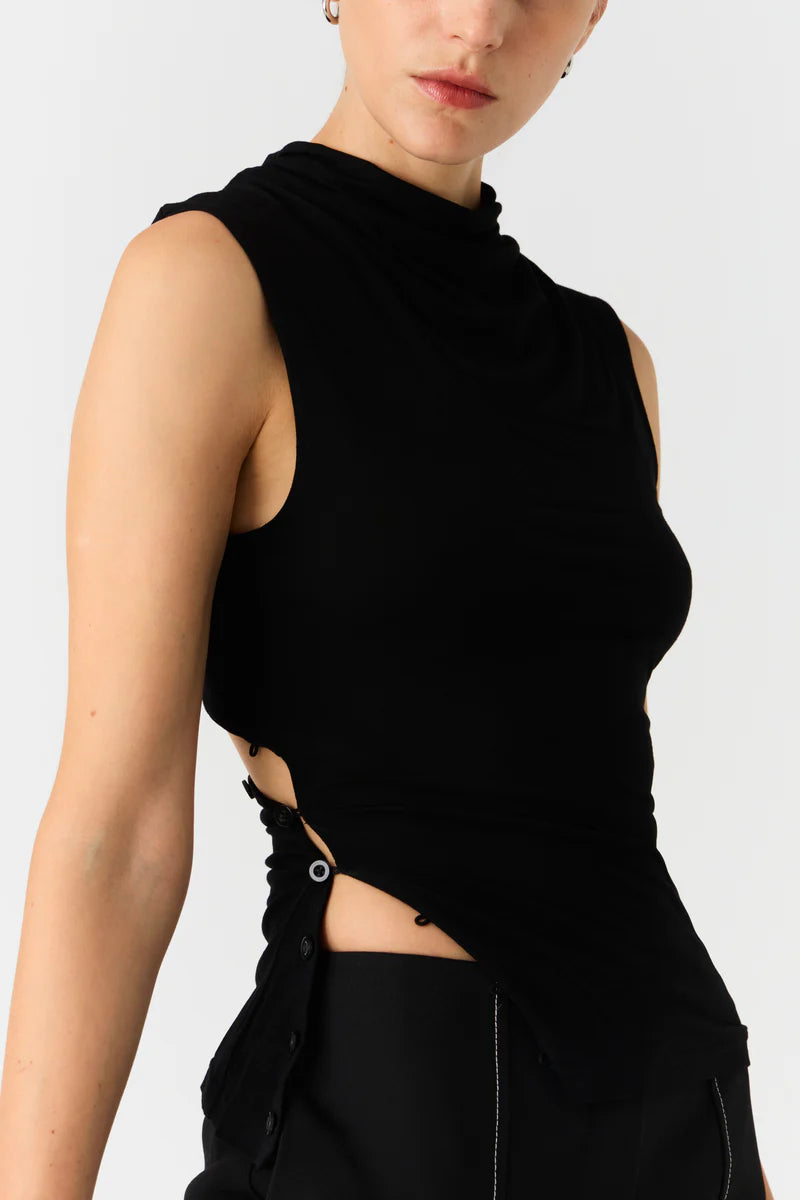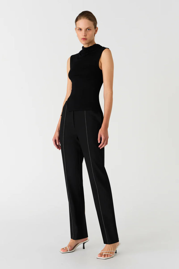 The Beatrice Top in Black, a sophisticated silhouette with her high cowl neckline.