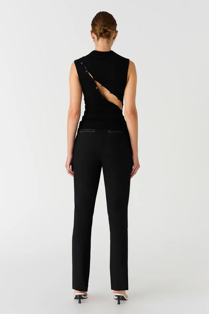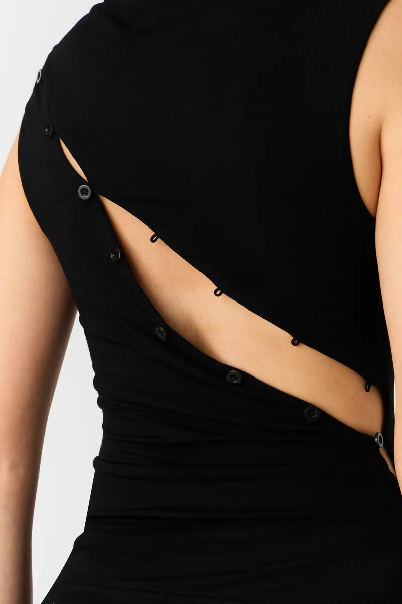 This elegant style brings an edge, with the open back detailing that can be exposed by unbuttoning to your desire. These buttons also extend to the front of the garment, which can be opened to create a small slit. Style Beatrice with a pair of high waisted trousers to complete the look.