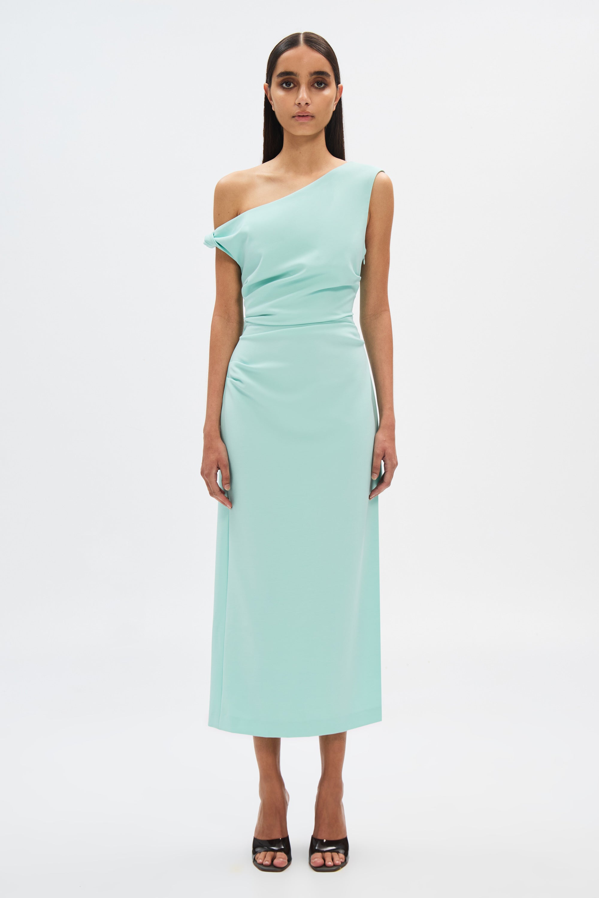 The Gaia Twill Midi Dress in Pale Aqua, an asymmetric design that gives minimalism a new look.