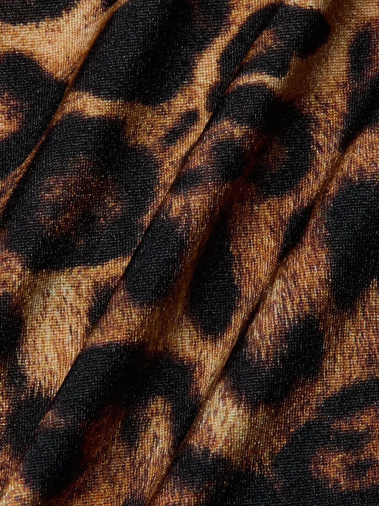 The Sirena halter bikini top redefines sexy sophistication with its bold leopard print, brass bead accents, and striking cut-out front. Designed with a double logo hook back and halter ties, it balances support and style for an unforgettable swim look.