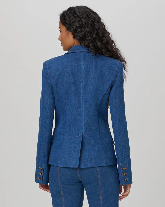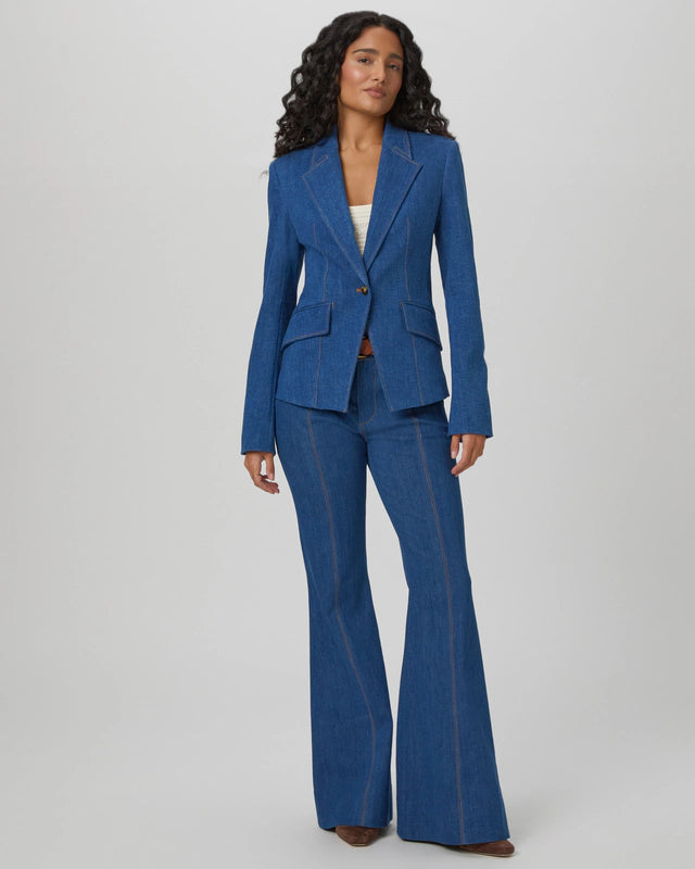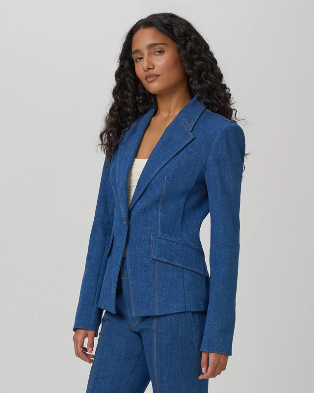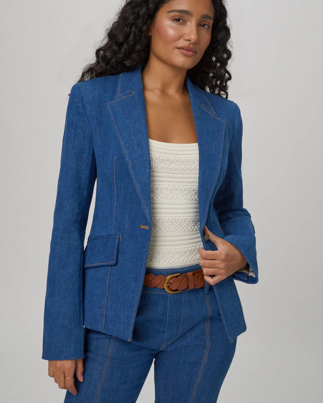 Elevate your denim-on-denim look with our Candace Blazer. This sophisticated style is cut from our bestselling PAIGE VINTAGE denim in a bright medium wash with contrast stitching, pintuck details, angled flap pockets, and structured shoulders. PAIGE VINTAGE takes all of the work out of breaking in your favorite vintage denim. We've combined the comfort of stretch with everything you love about authentic vintage denim to create super soft styles that feel perfectly lived-in from the very first wear. Pair Candace with the coordinating Raquel Mini Skirt or Marlow Trouser for a chic dressed up denim moment.