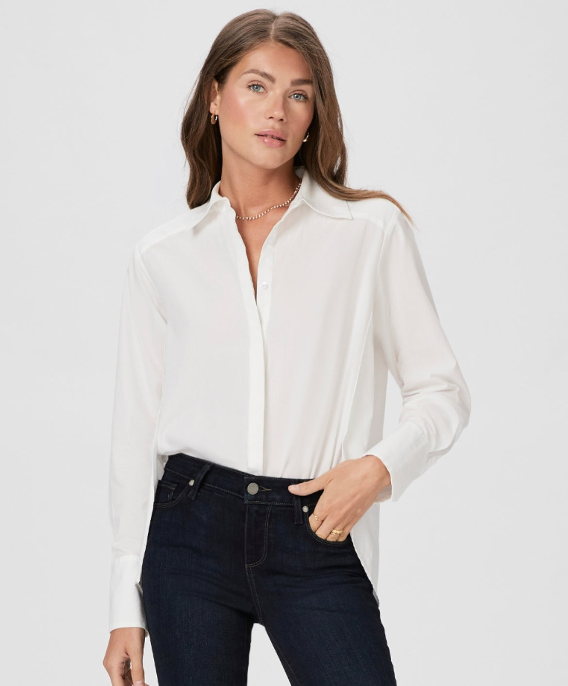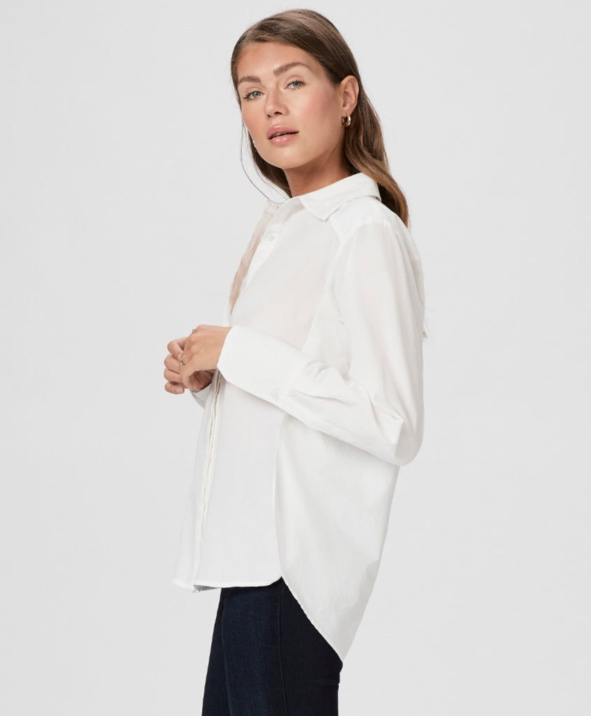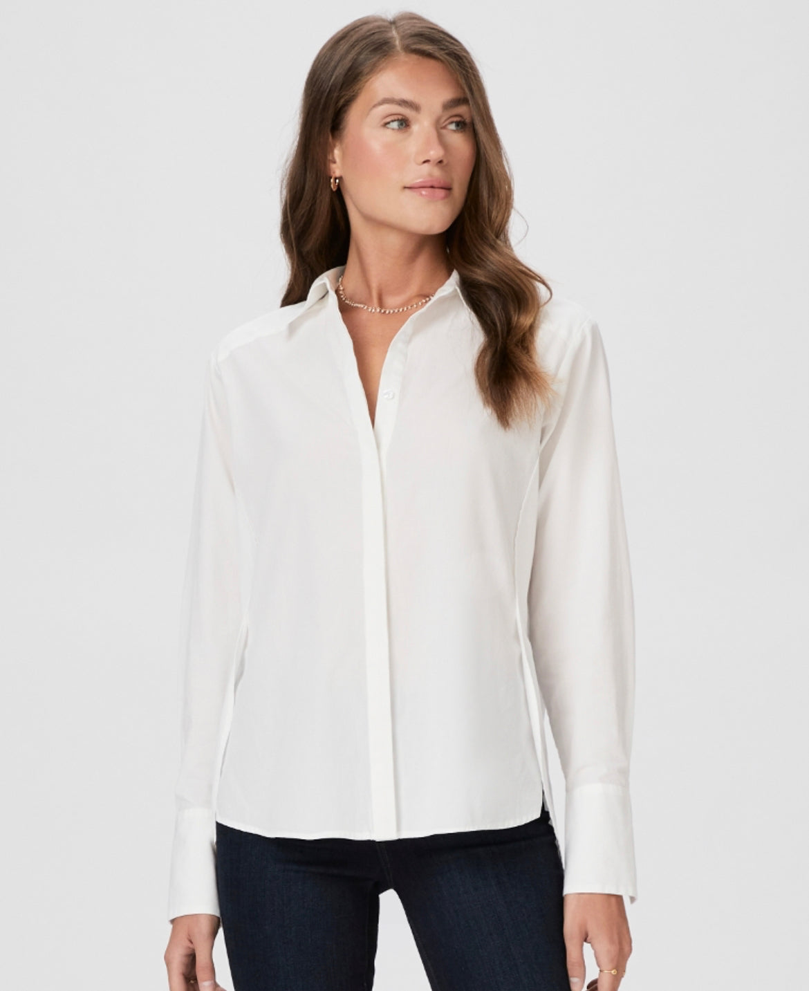 Made from supremely soft 100% cotton, this long sleeve white button-down shirt has a hidden placket with a side vent and a relaxed, oversized fit. Pair this staple piece with any shade of denim.