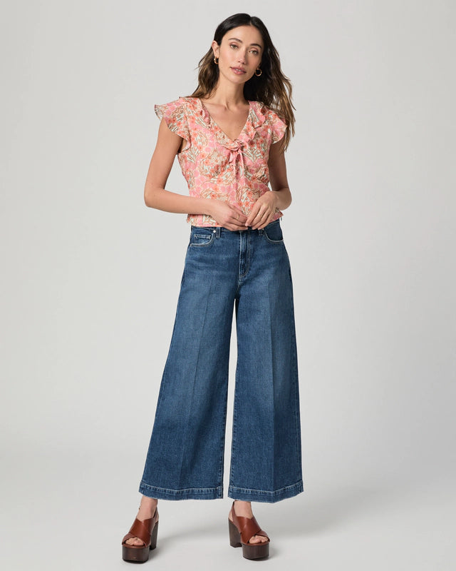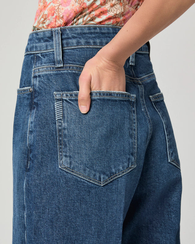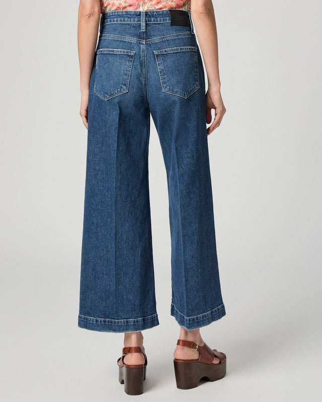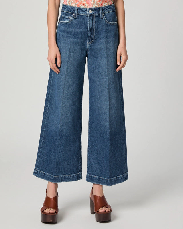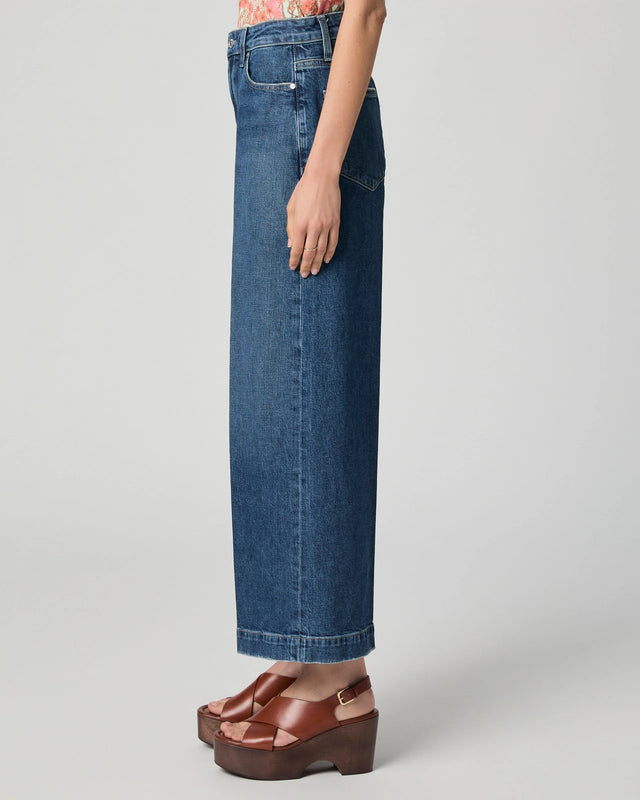This high rise, extra wide leg has a cropped, ankle length silhouette. This pair is crafted from PAIGE VINTAGE denim in a dark wash with soft vintage details. PAIGE VINTAGE takes all the work out of breaking in your favorite pair of vintage jeans. We've combined the comfort of stretch with everything you love about authentic vintage denim to create super soft jeans that feel perfectly lived-in from the very first wear.