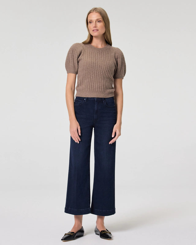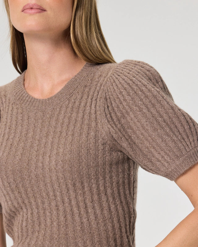 Crafted from 100% cashmere with a cable knit stitch throughout, this heather brown short sleeve sweater tee features a slim body and puff sleeves. We’ll be wearing the Lucerne Top with every shade of denim all season long.