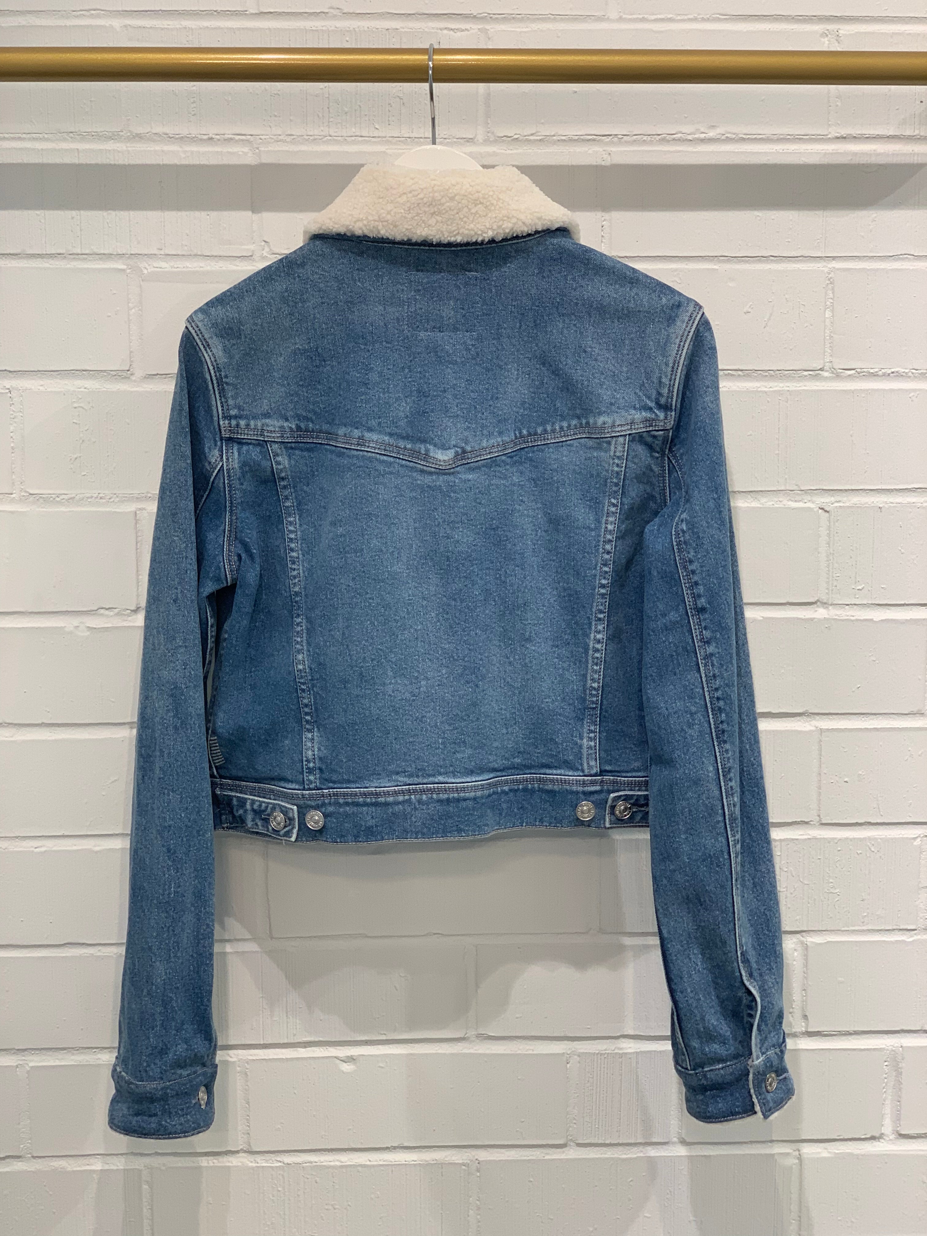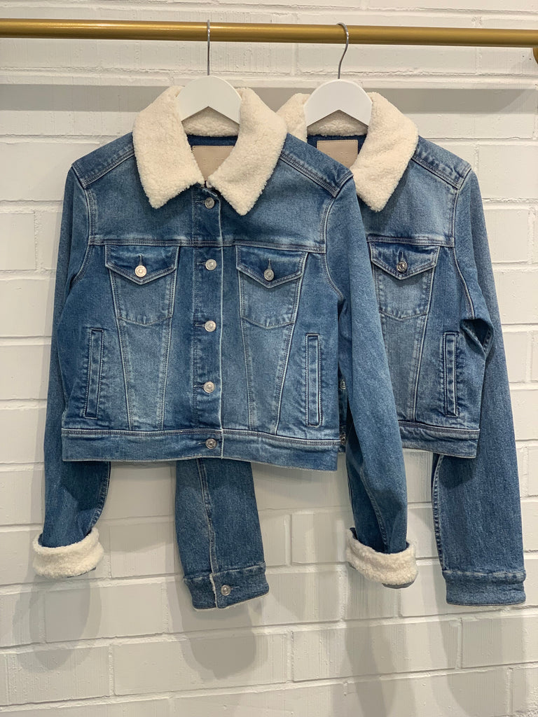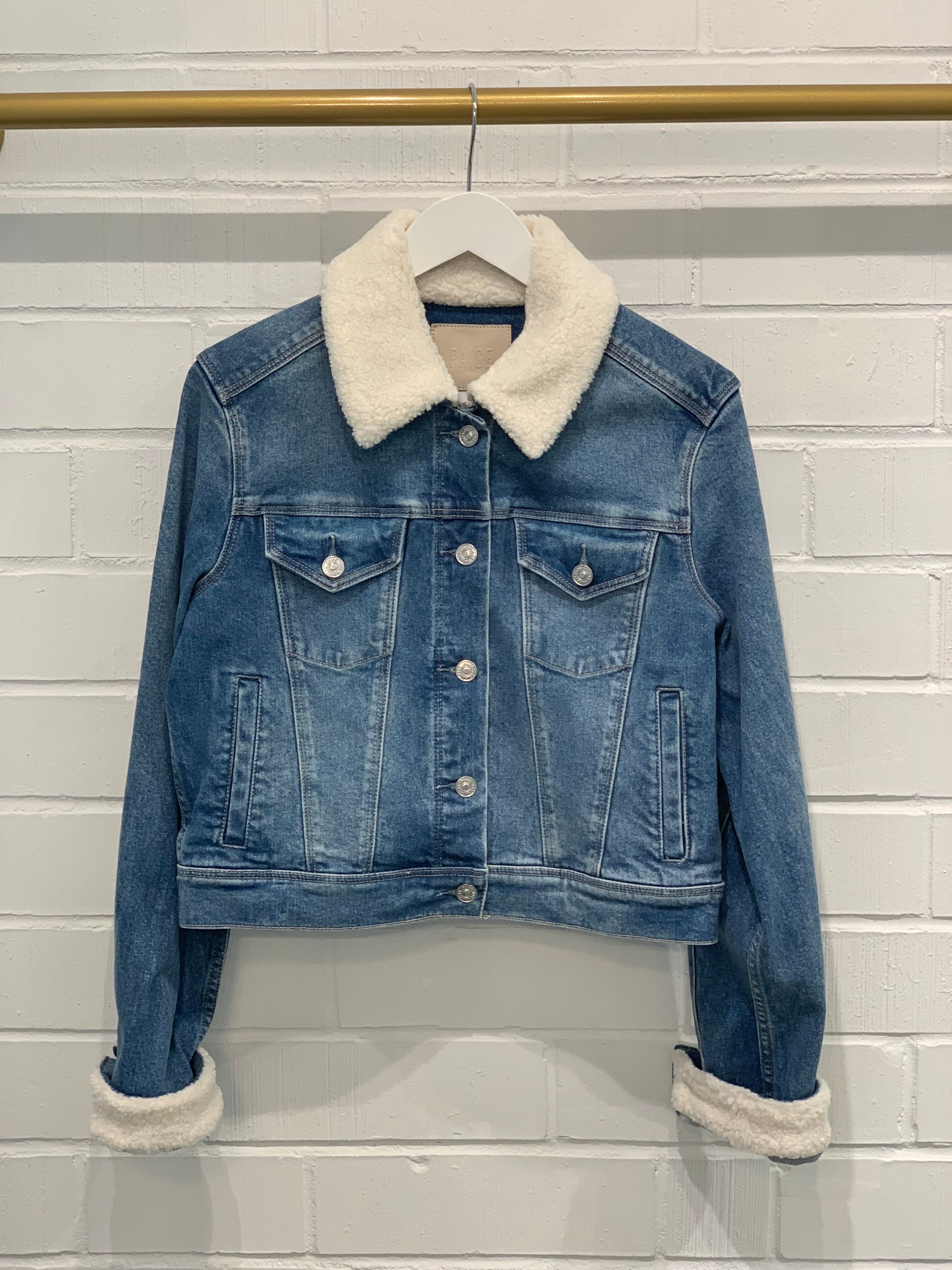 Distressed denim paired with shearling cuff and collar detail make the Vivienne your casual jacket of the season. Pair her with a fitted or flowy dress for an elevated look.