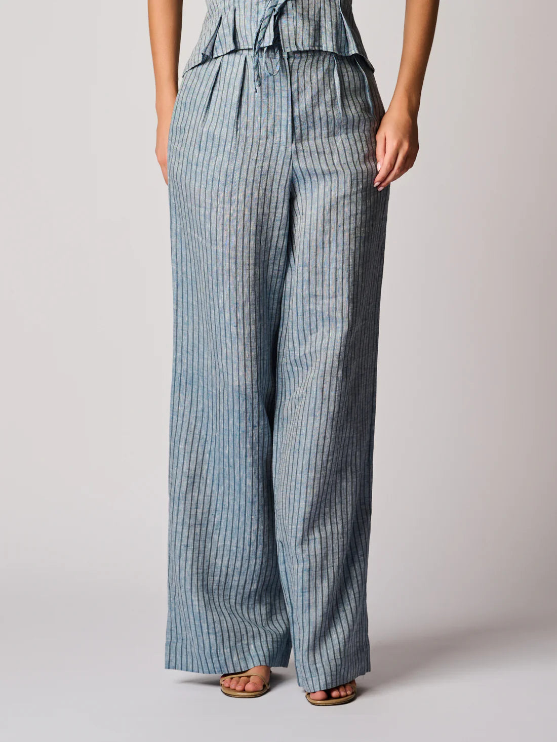Cut from our signature 100% linen stripe, the Alina pant features a fitted, high-rise waist, pleated front, and zip and button closure. A removable belt and wide-leg silhouette finalize the look.