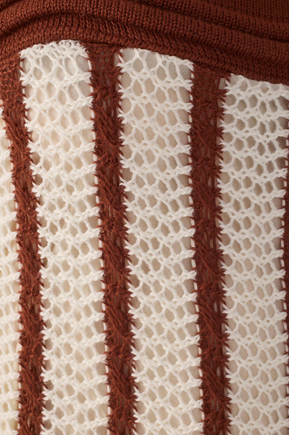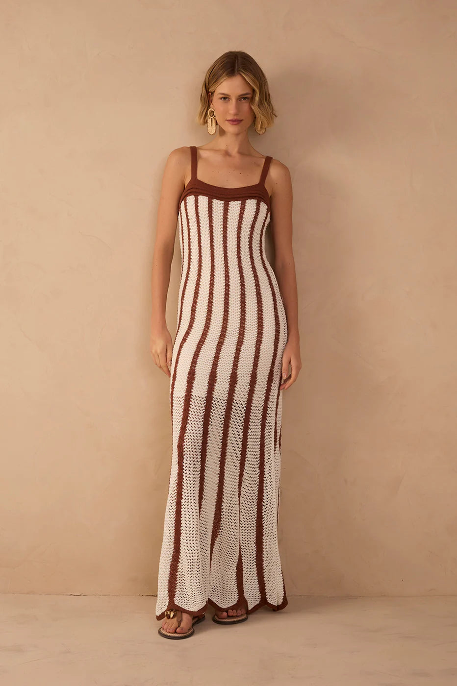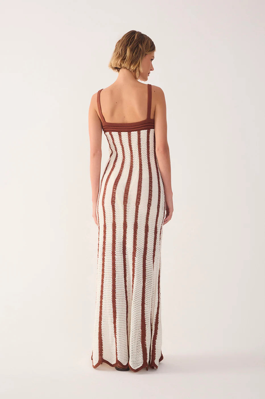 The Bicolor Knitted Dress combines an open weave with a long, fitted cut. With a straight neckline and wide straps in a contrasting color, the striped knit elongates the silhouette. Perfect for summer.
