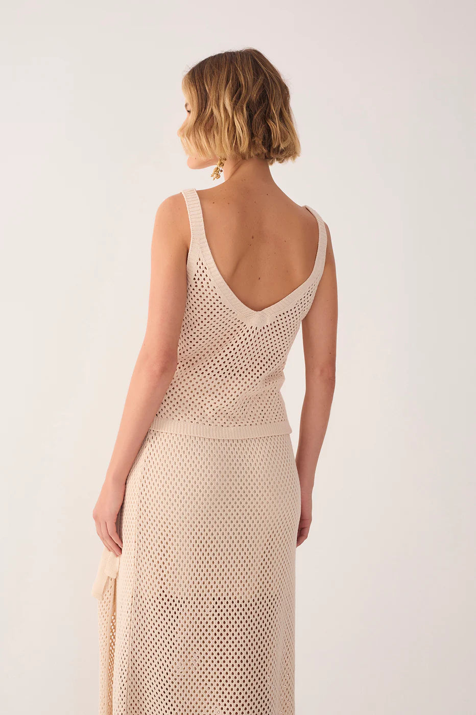 Our Tricot Oásis blouse brings the lightness of open-knit fabric. The V-neckline enhances the design and loose fit. Perfect for resort looks and warm days.