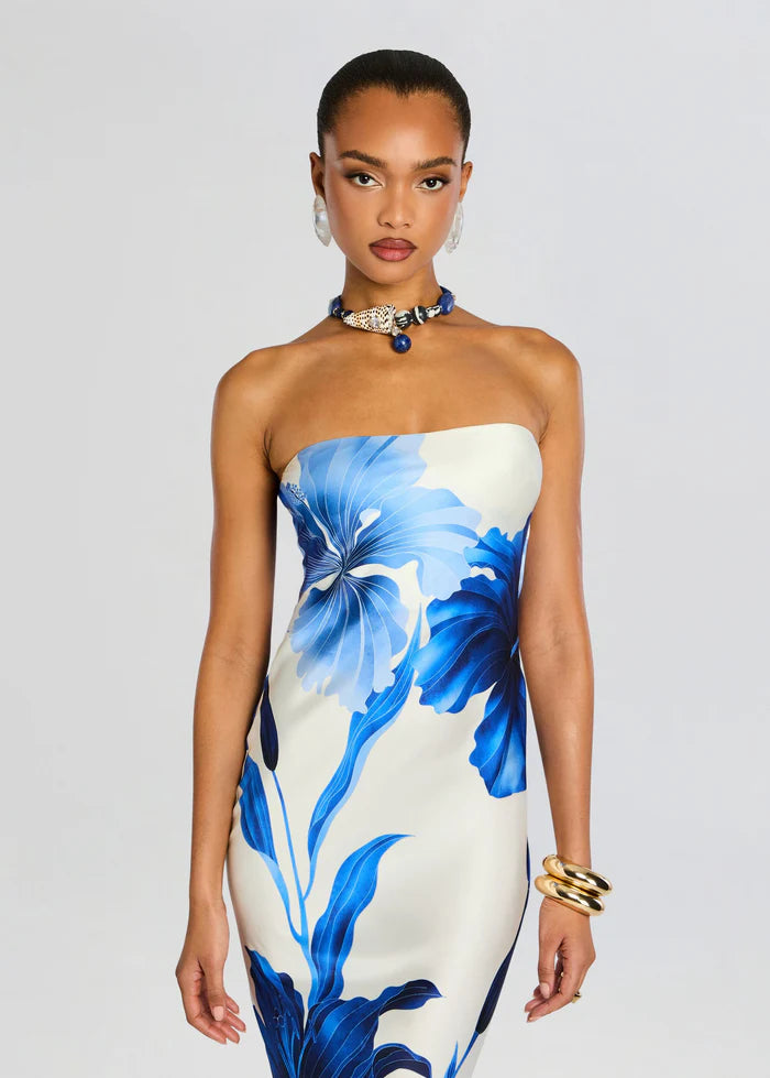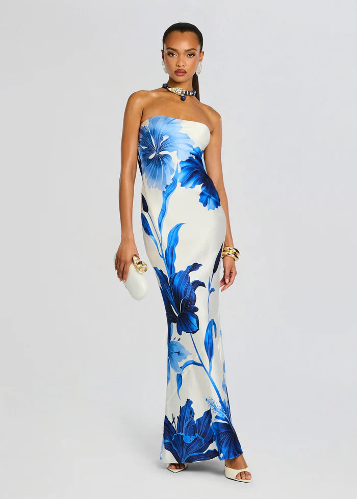 Indulge in elegance and allure with our Keaton Dress. Elevate your style with this exquisite gown boasting a flattering strapless neckline, an alluring open back, and crafted from a sumptuously silky fabric. Designed to captivate attention, this dress embraces sophistication and sensuality. The strapless silhouette offers a chic and elegant appeal while the open back adds a touch of allure, ensuring you radiate confidence and charm. Shown here in Azure Primavera.