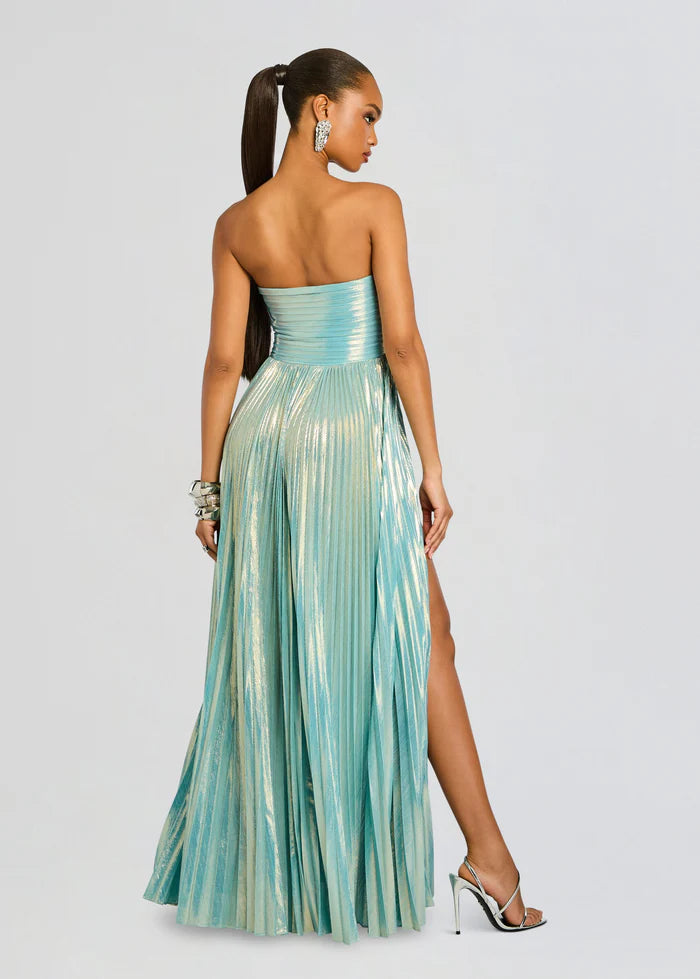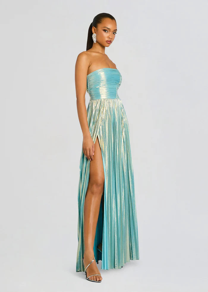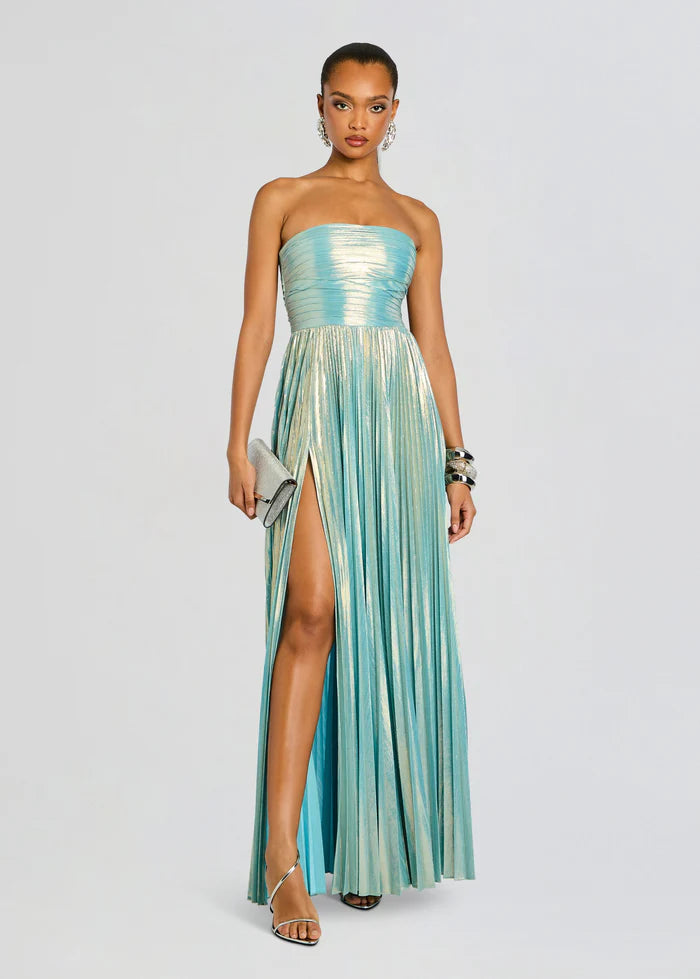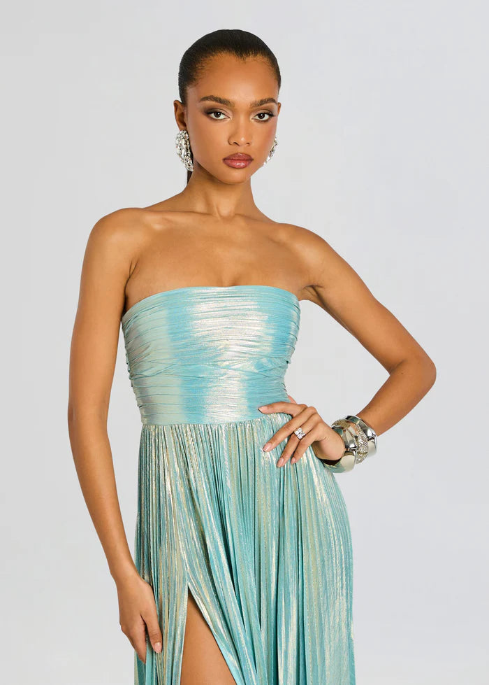 The Sevyn Dress exudes grace and style for any special occasion. The strapless gown is crafted with shimmering lame fabric, adding a touch of luxury to the design. With a tasteful slit, this dress will make a statement without saying a word. Elevate your style with Sevyn. Shown here in Seychelles.