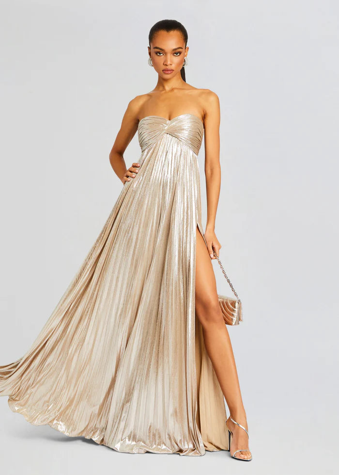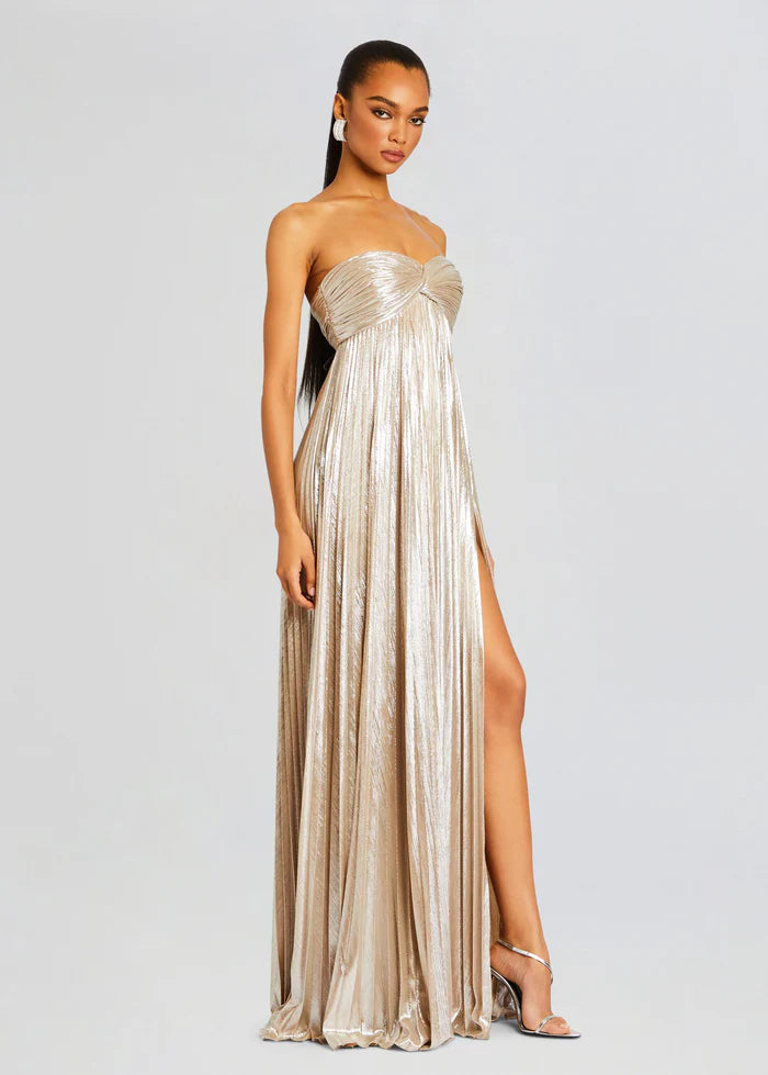 Embrace your inner goddess in our Zoa Dress. Crafted in lustrous lamé, this statuesque silhouette features ruched panels on the empire bodice with twist detail and a floor-length skirt. The strapless neckline and a thigh-high side slit create a seductively feminine feel. The style is finished with an invisible side zip closure. Shown here in Champagne.
