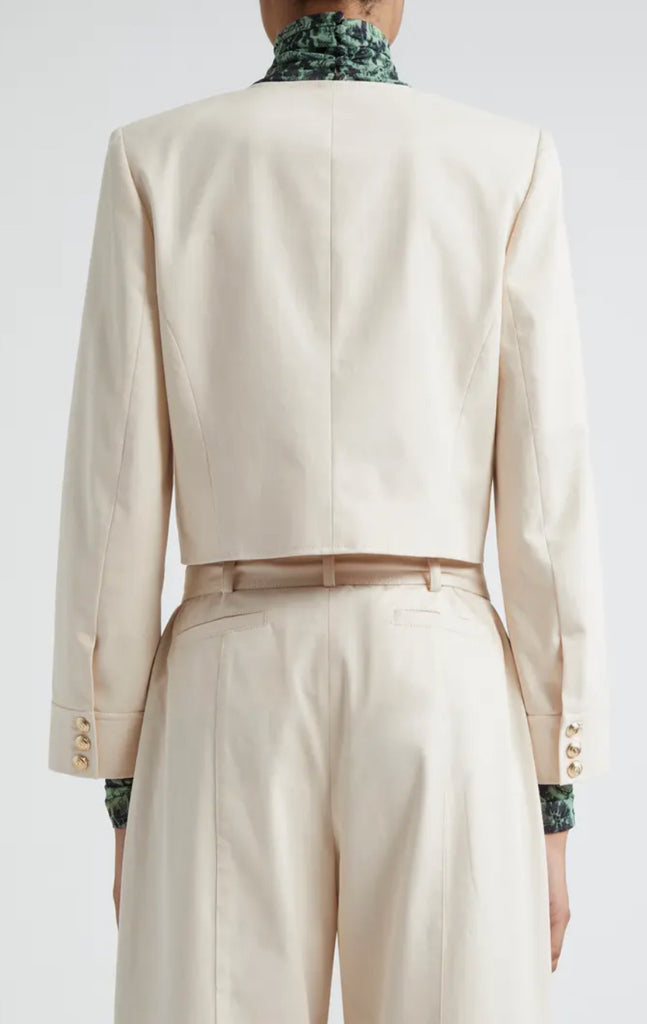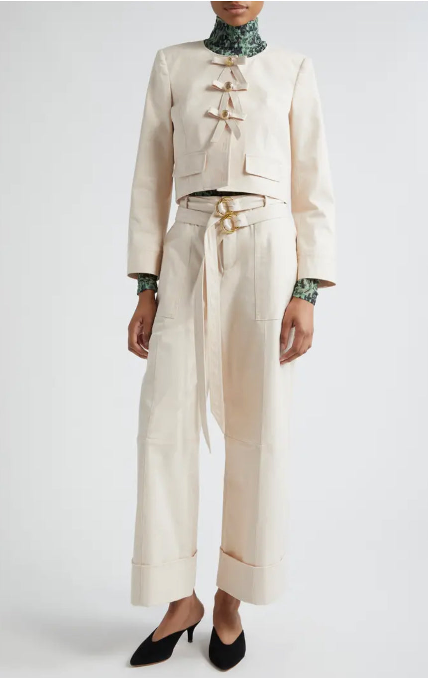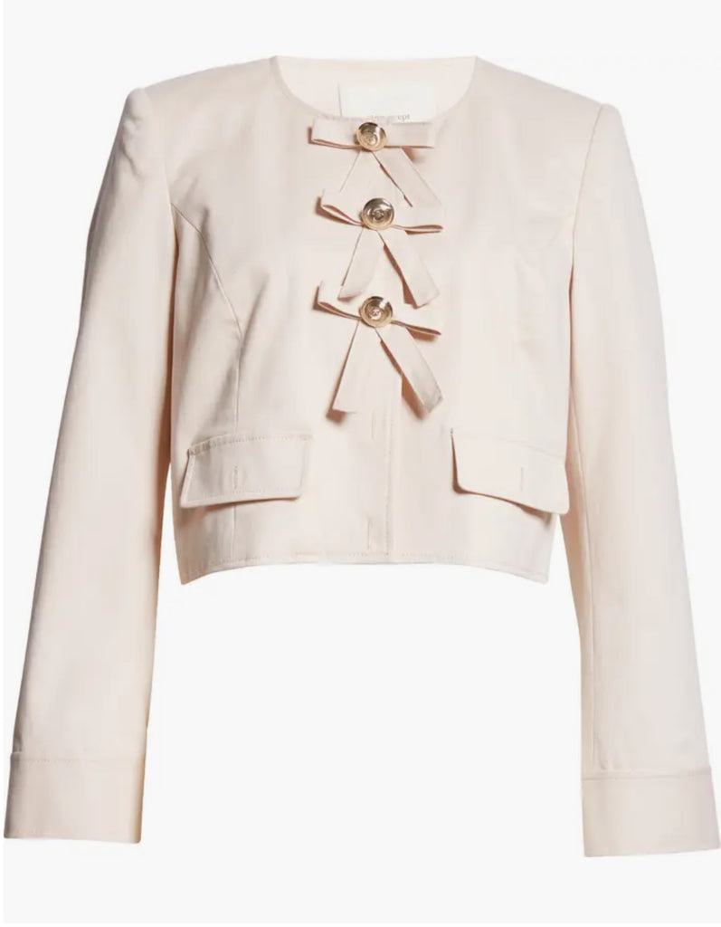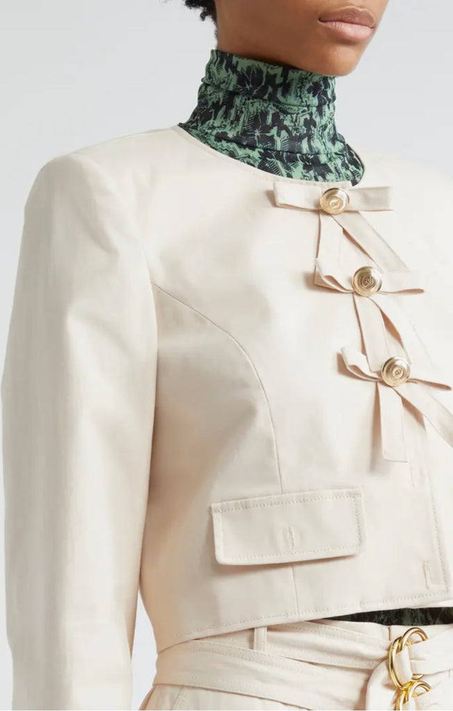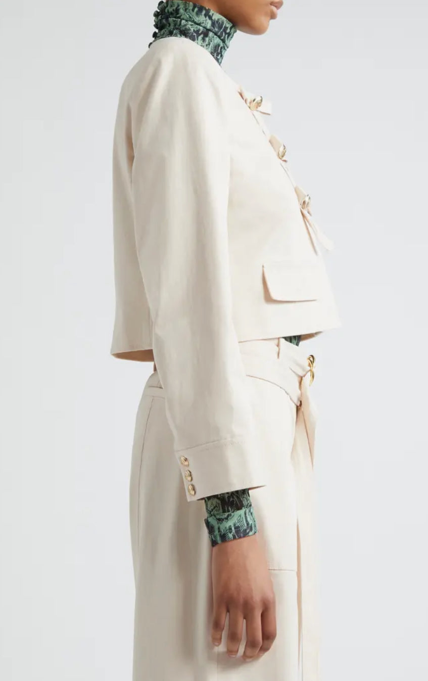 A trio of ties anchored with brassy buttons adds extra style points to a waist-skimming jacket cut from stretch-kissed cotton twill.