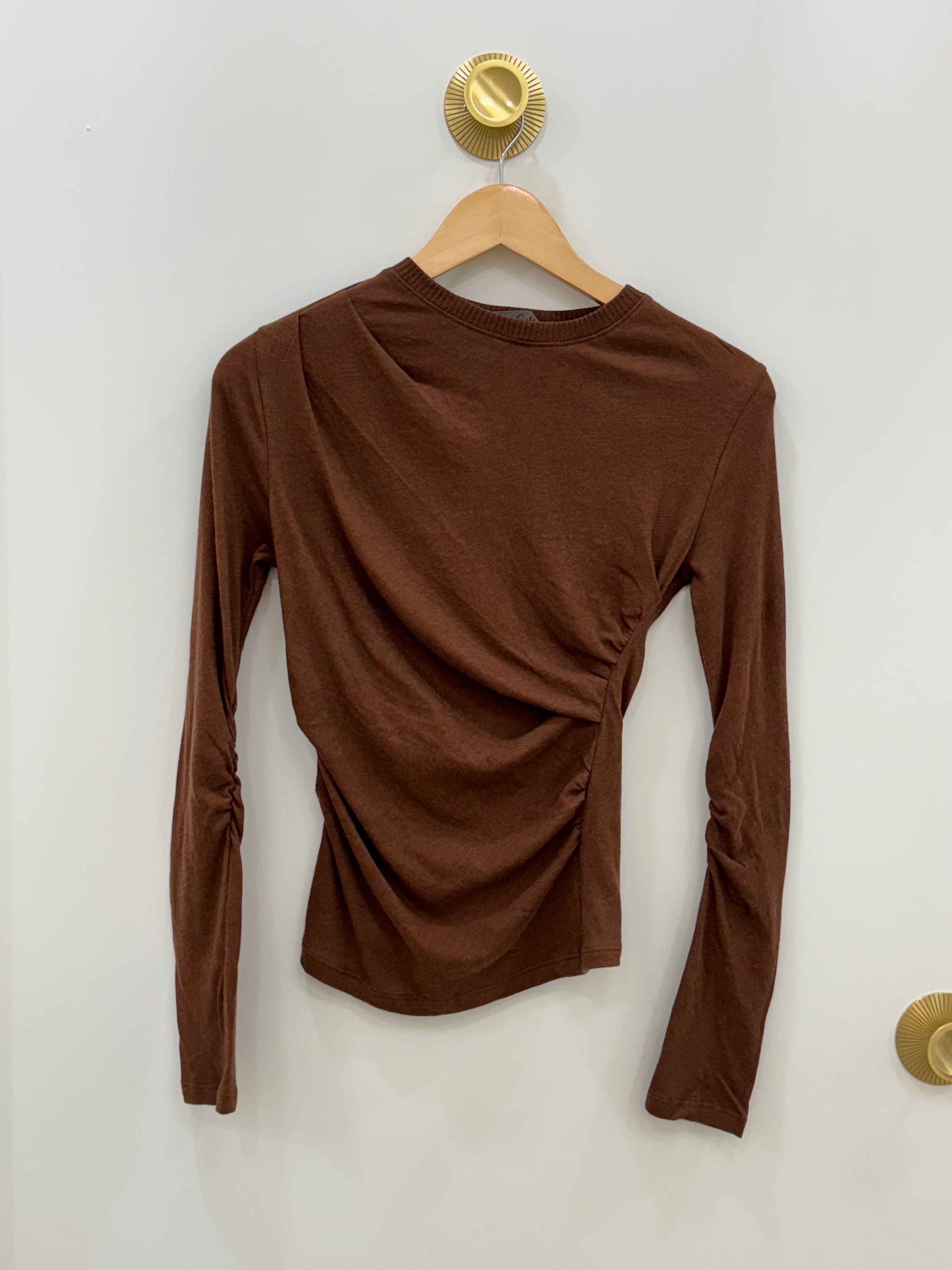 Crew neckline with asymmetric twist detail, long-sleeve top cut from the brand's soft cashmere jersey.