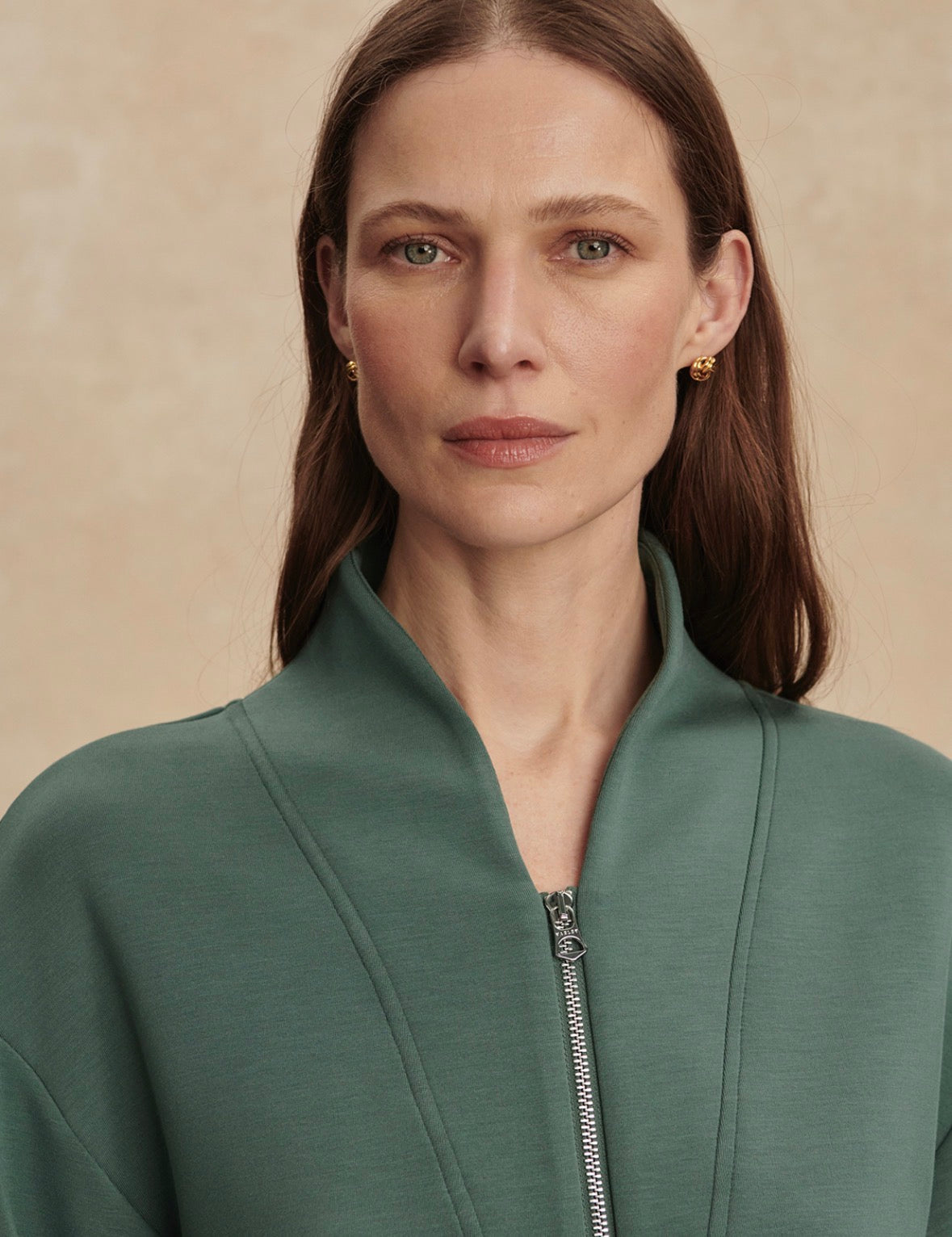 Studio model is 5'9.5", with a 34.5" bust, 25" waist, 35.5" hips and wears a size small.