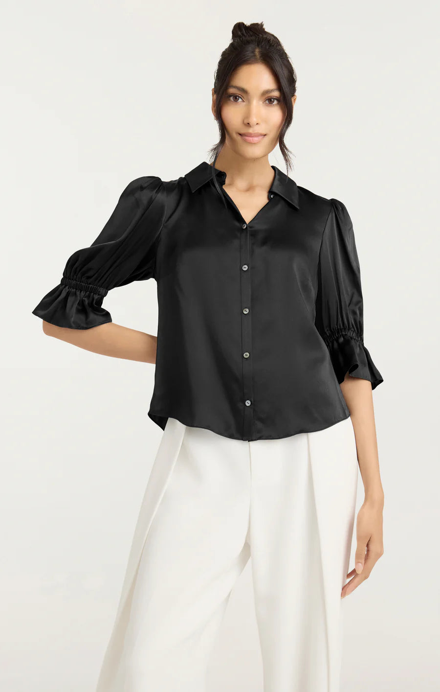 Experience luxury with the Fiona Top. Made from high-quality silk, this blouse features a collared neckline and a trumpet sleeve design for a touch of elegance. The convenient button front closure and sophisticated black color add a touch of elegance to this top. Dress up any outfit with this versatile and chic top.