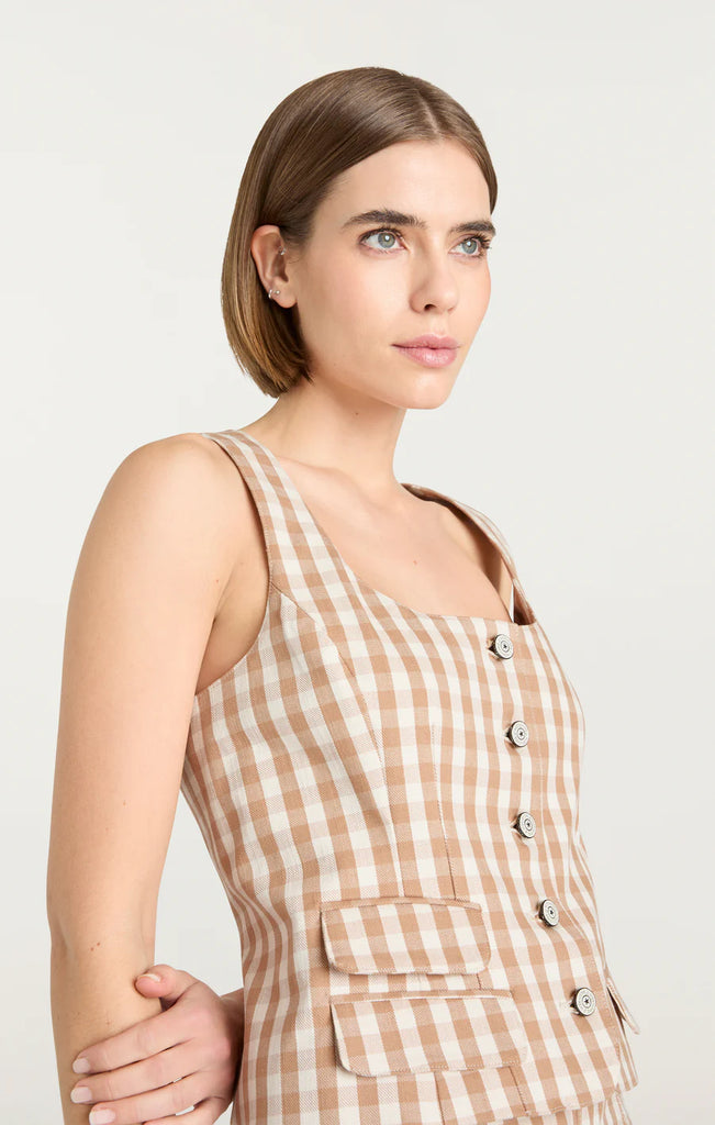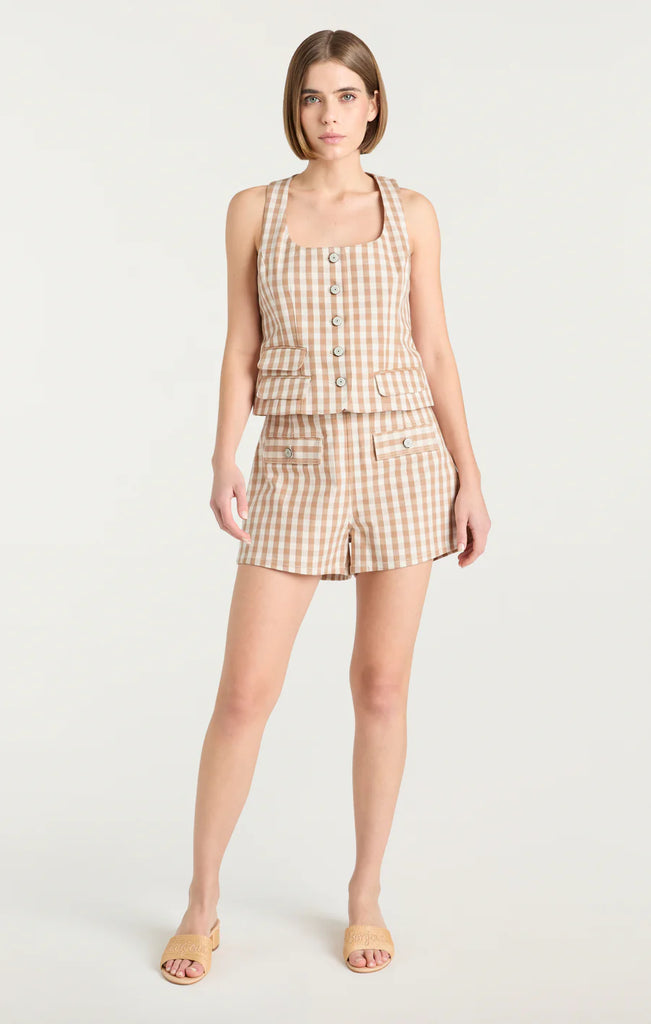 The Gingham Denim Lovina Top is a sleek tank top with a flattering scoop neckline, adorned with crystal button details for a touch of sparkle. Faux front pockets add subtle texture, making it the perfect complement to the Gingham Denim Allie Short Skirt for a coordinated, stylish set.