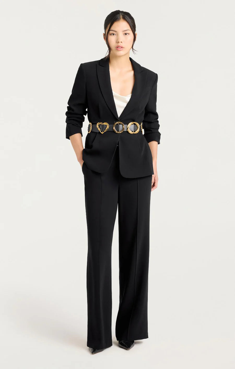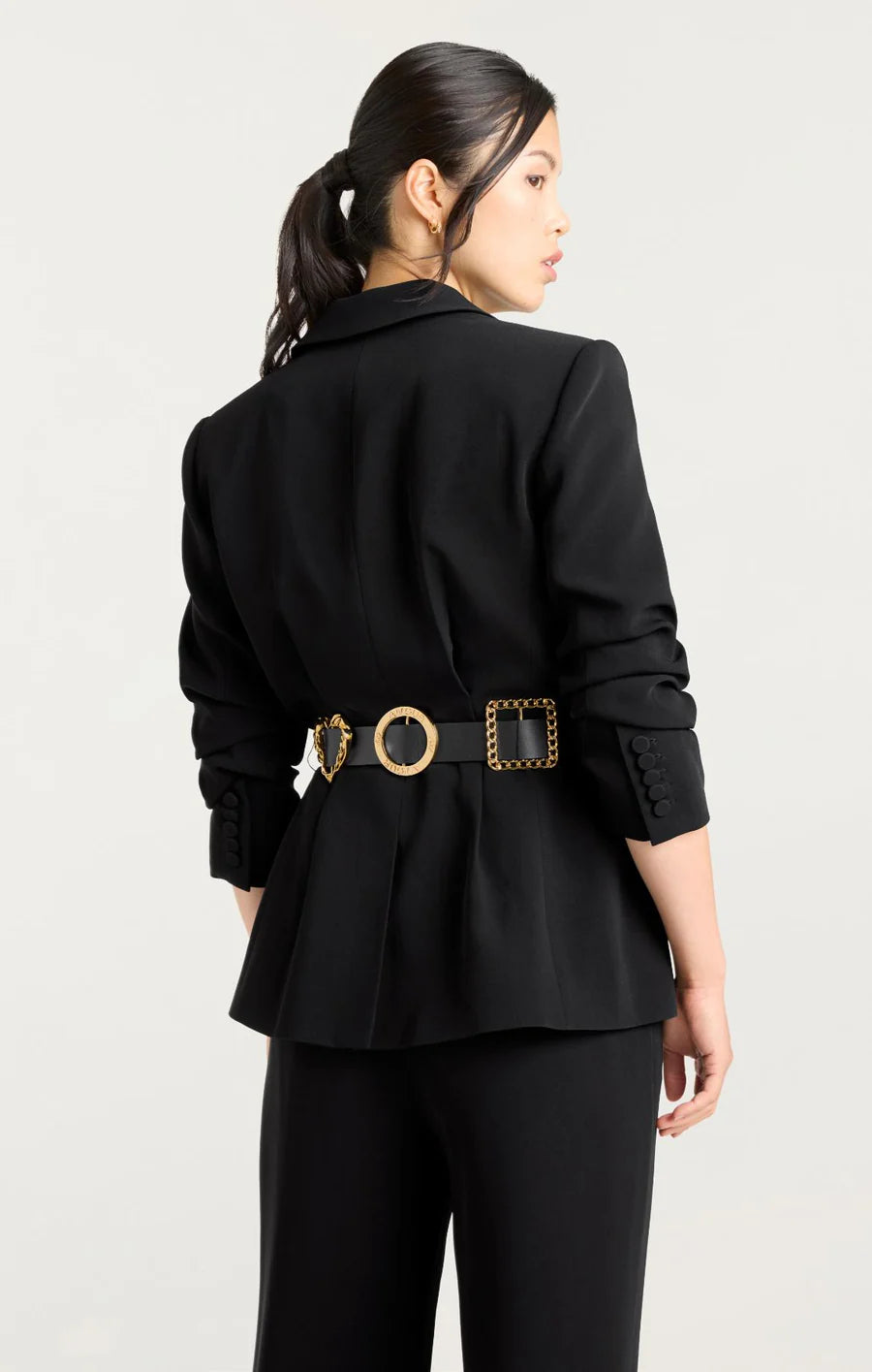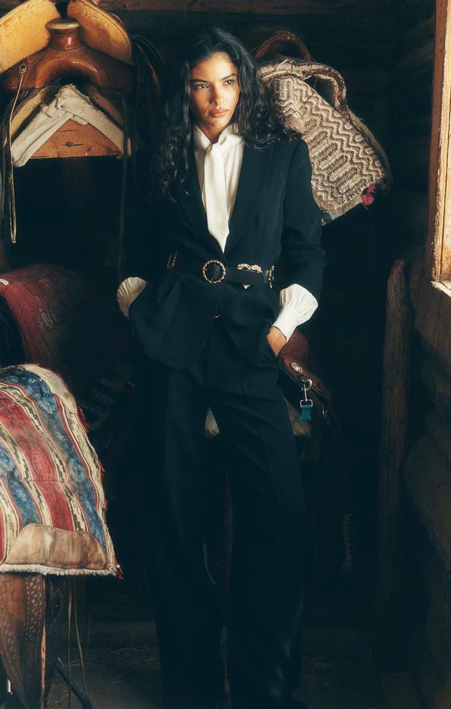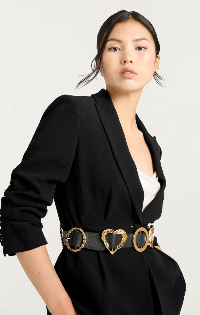 Make a bold statement with the Gold Belt Scrunched Cheyenne Blazer. This classic black blazer is taken to another level with a striking gold belt embellished with intricate details that highlight the waist for a confident, luxurious look. Perfect for those who aren't afraid to stand out, it combines timeless elegance with grand accents.