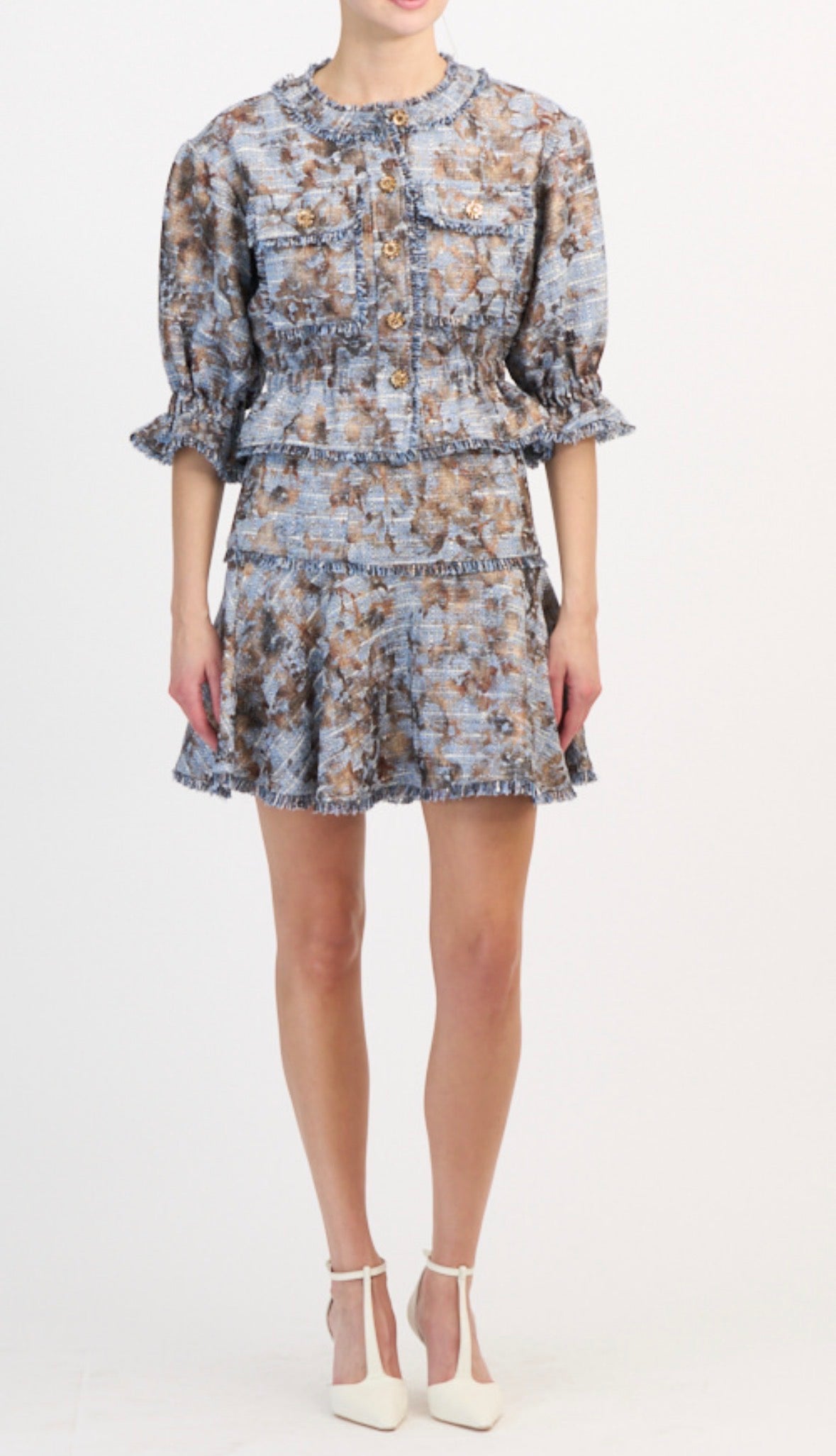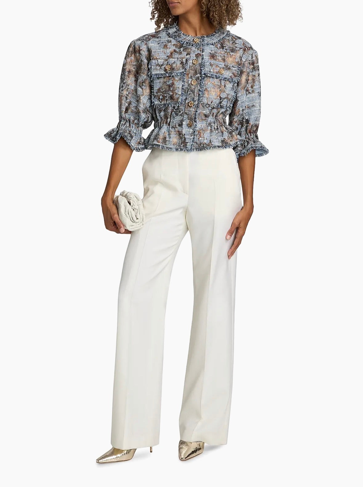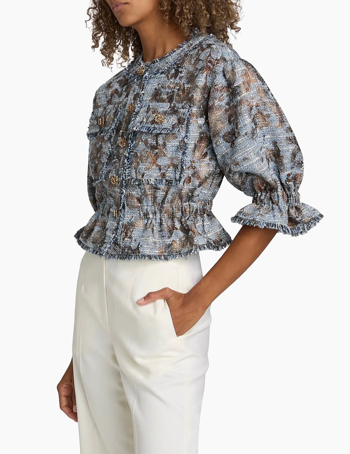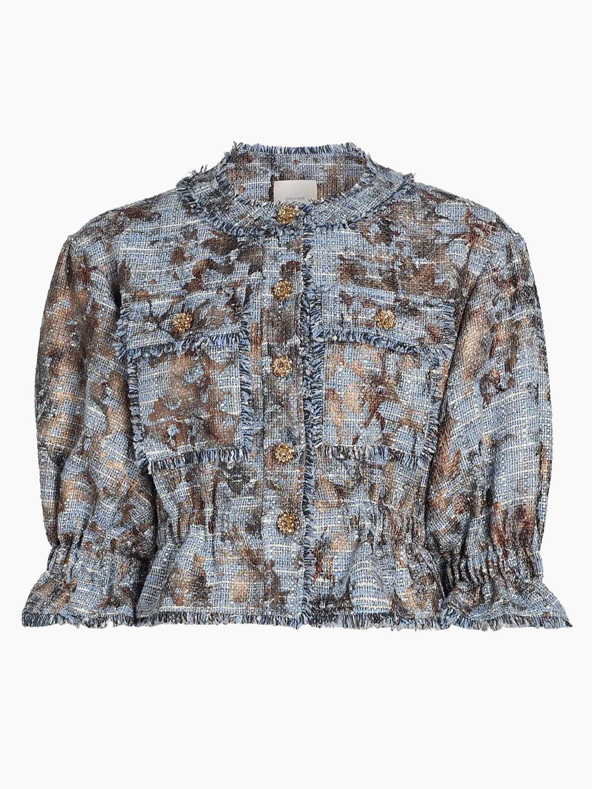 Cinq à Sept's Jaxie cropped jacket is crafted from a foiled printed tweed, finished with fringe trimmings and engraved goldtone buttons. This piece features a banded crewneck, elbow-length sleeves, and flared cuffs.