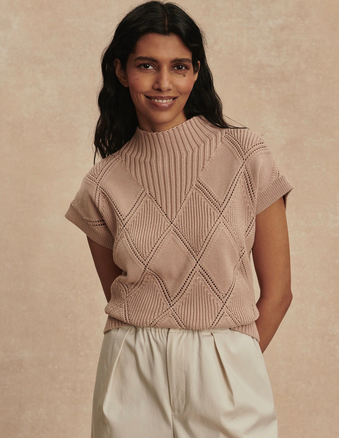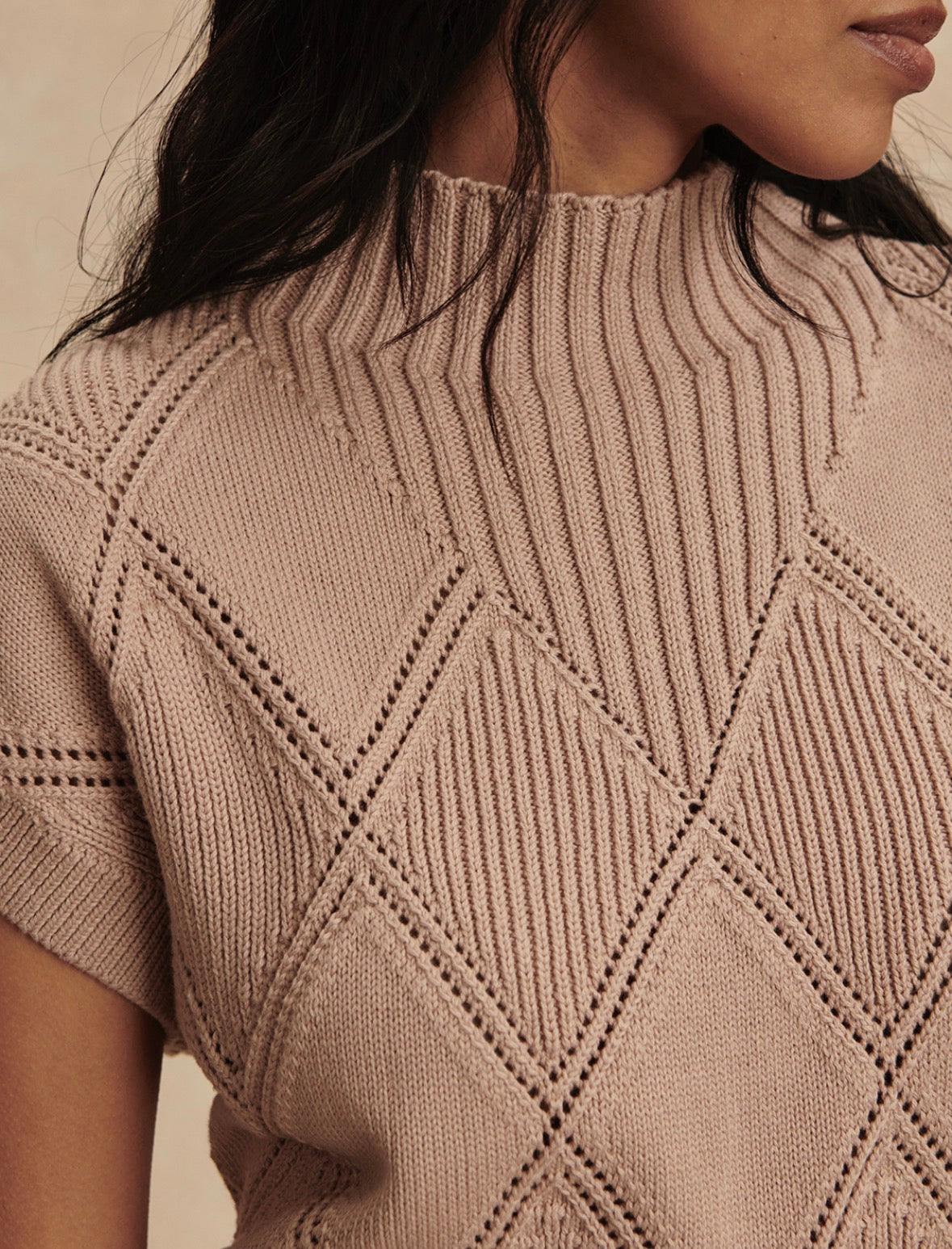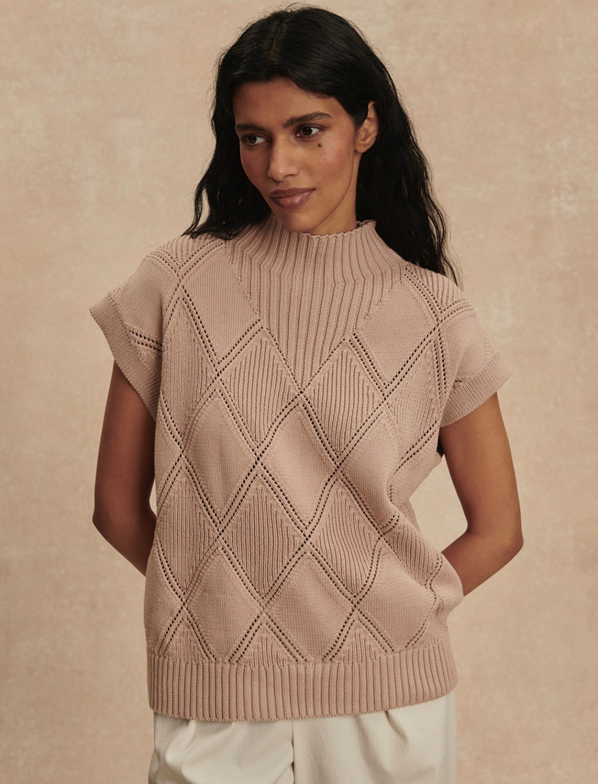 A relaxed top perfect for easy layering or wearing solo, the Keffin is crafted from 100% cotton in a mid-gauge knit. An all-over diamond pointelle stitch and rib detailing add texture, while the high neck and dropped sleeves create a contemporary shape.