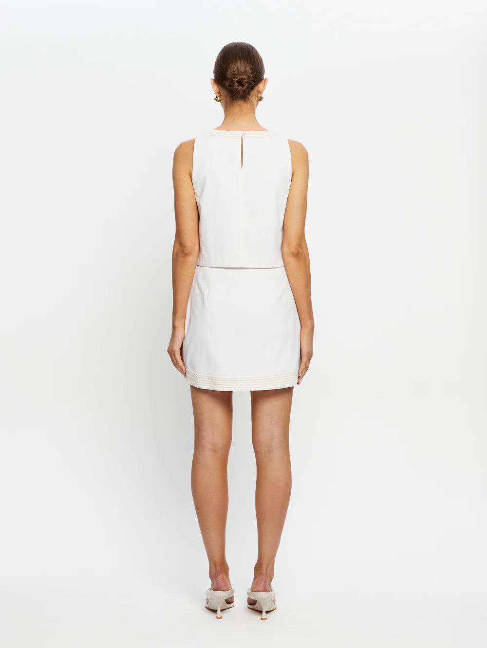 The Moni Top features a high neckline with a keyhole and button closure at the back, complete with intricate cream floral embroidery along the neckline. Effortless from day to night, pair back with the Moni Mini Skirt and a sandal to complete the look.