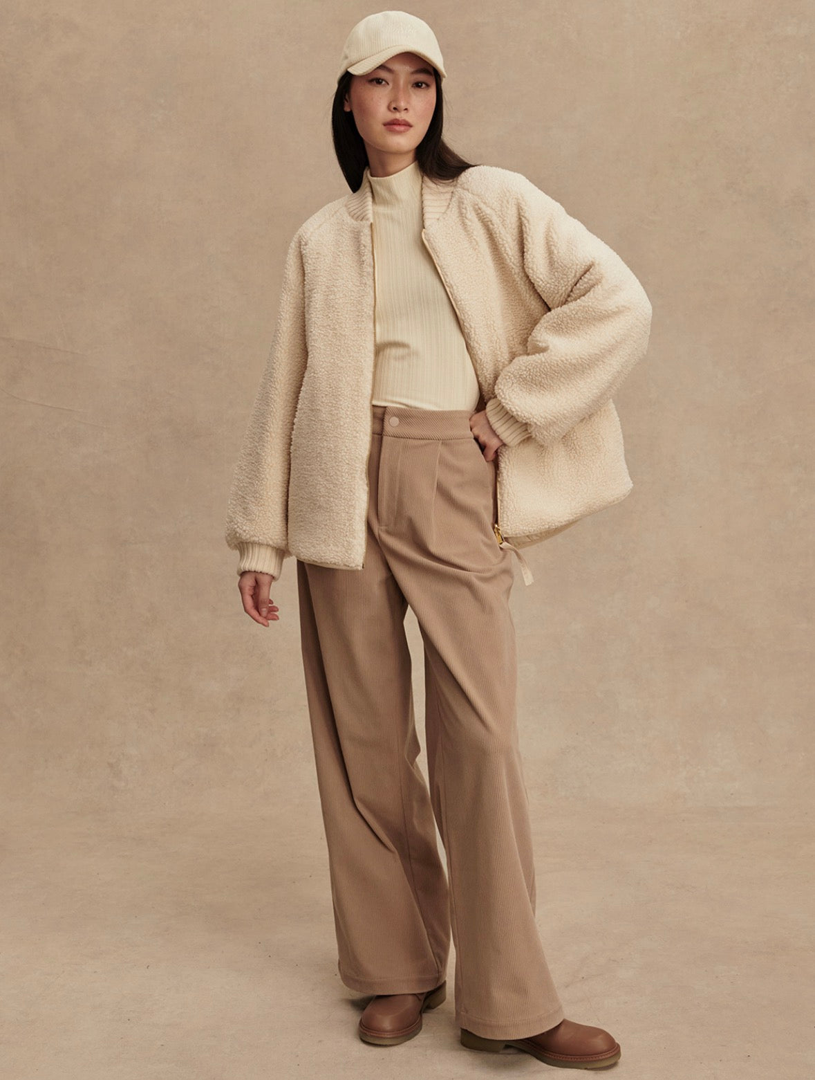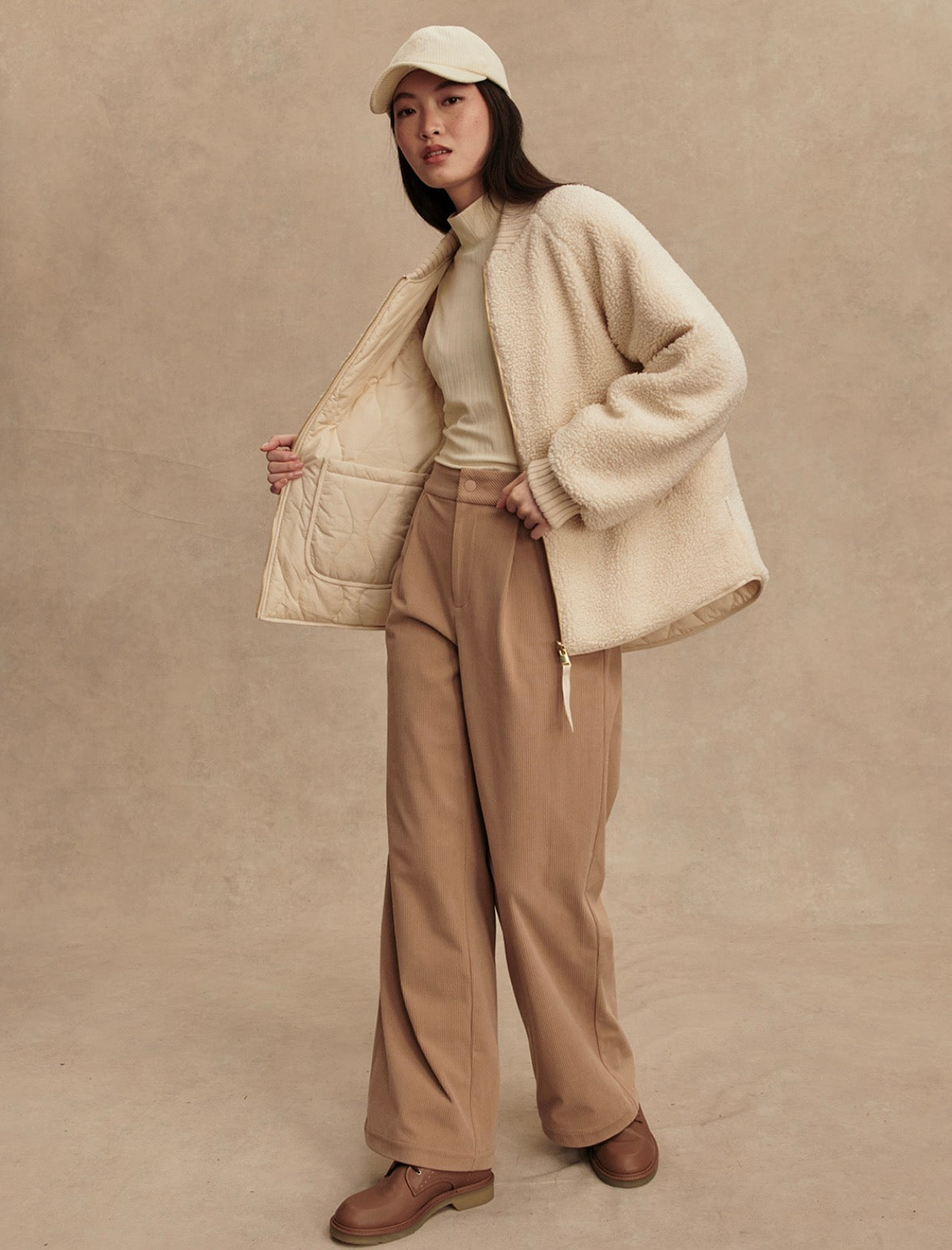 Customize your style with the reversible Serina. Soft, lightweight, and super versatile, it's perfect for effortless transitional and cold-weather layering. Made from a tight, curly Bouclé Sherpa on one side and our Crinkle Shell fabric in quilted design on the other, it's cut to a boxy bomber shape with a flattering curved hem. Complete with pockets and chunky knitted cuffs and collar.