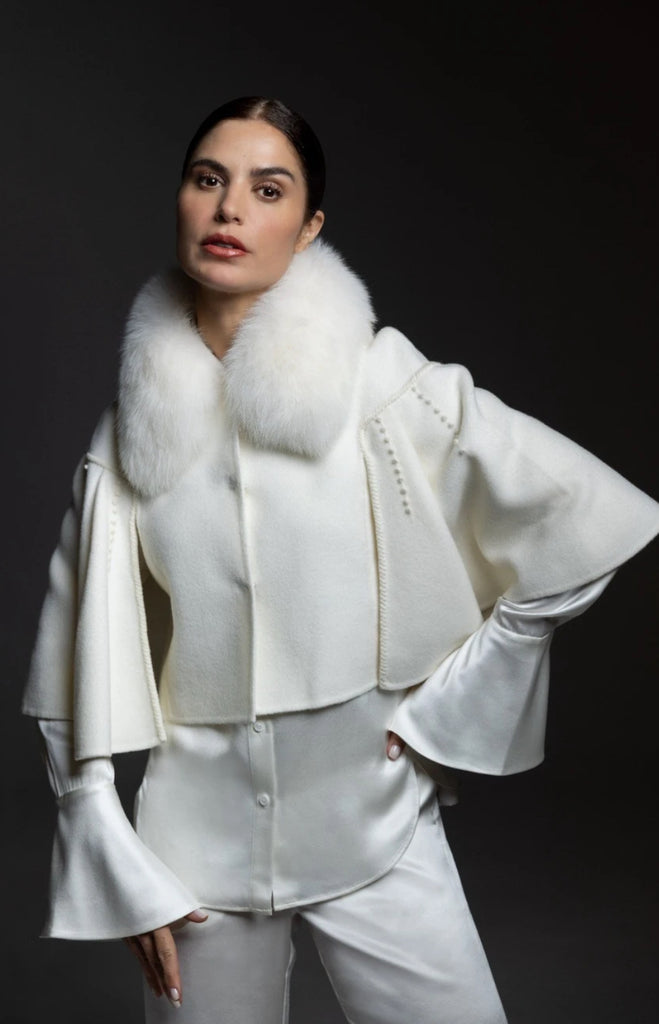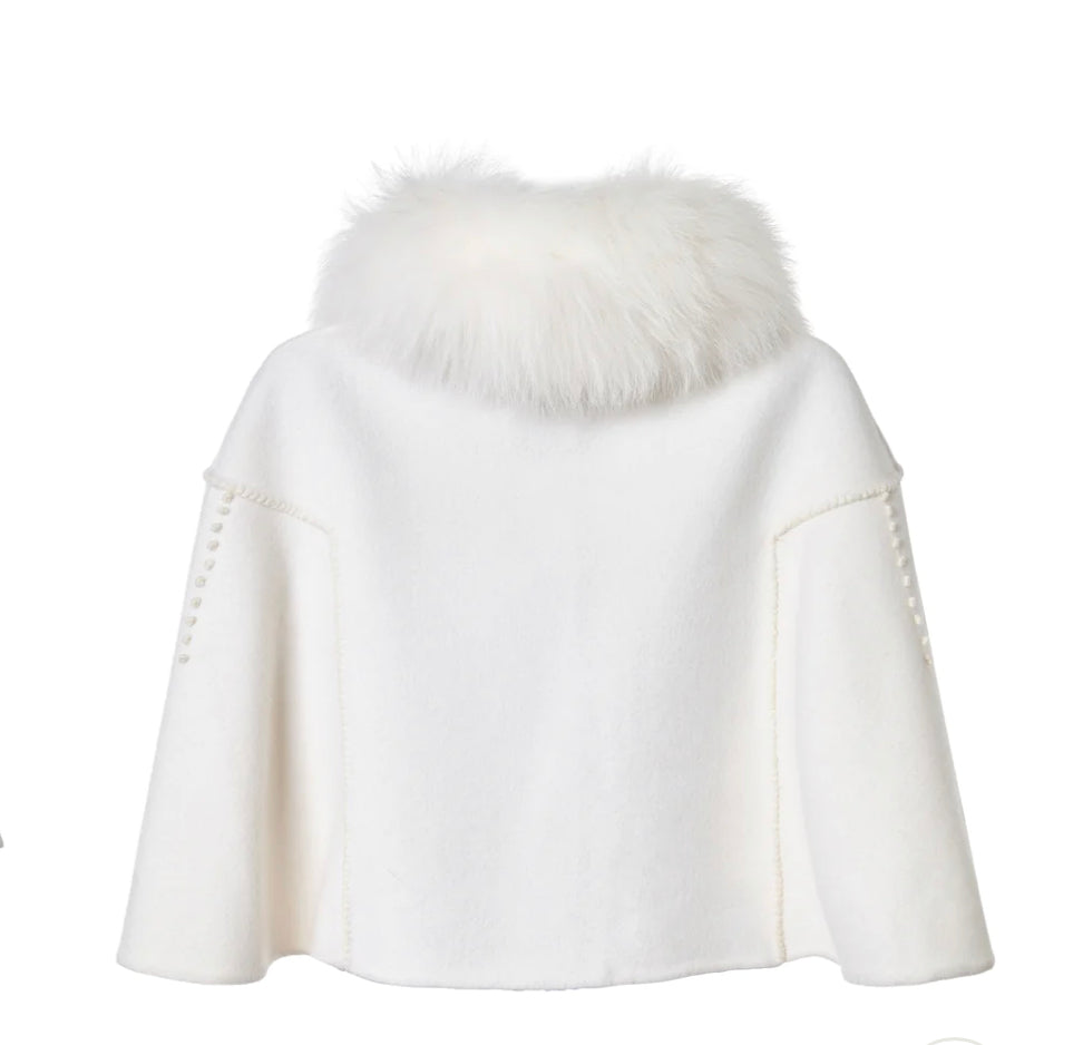 Elevate your formal wardrobe with this Short Embroidery Capelet. This short caplet has a detachable fur collar and embroidery on the sleeves. Its intricate embroidery adds a touch of distinction, making it an exquisite addition to any wardrobe. It's an undeniably timeless piece you can count on to make a statement.