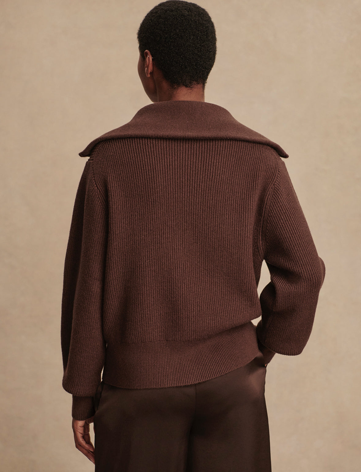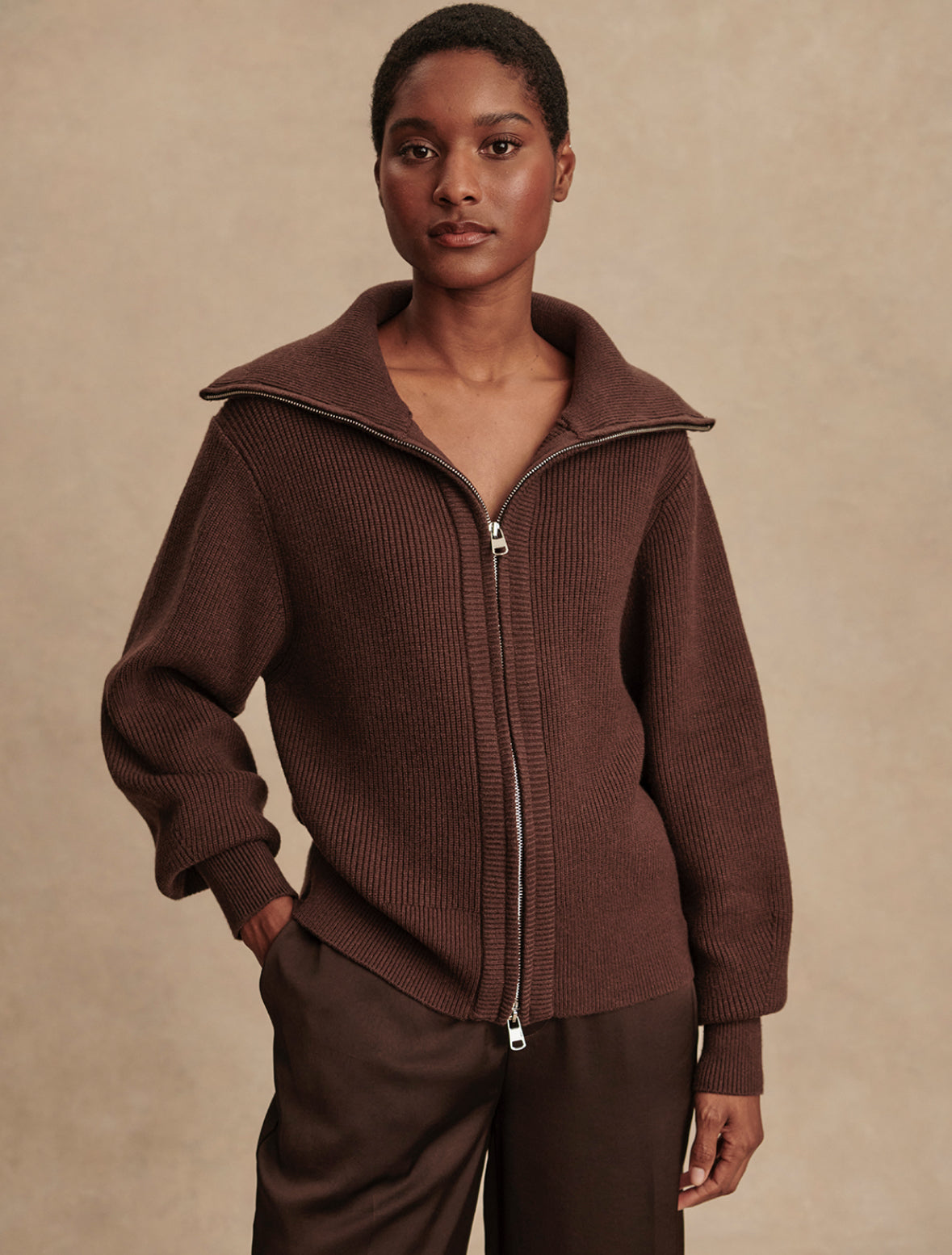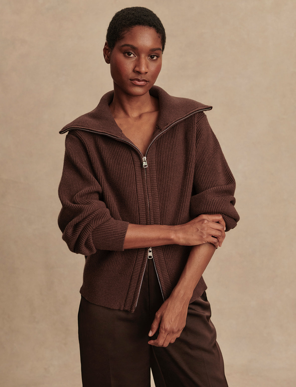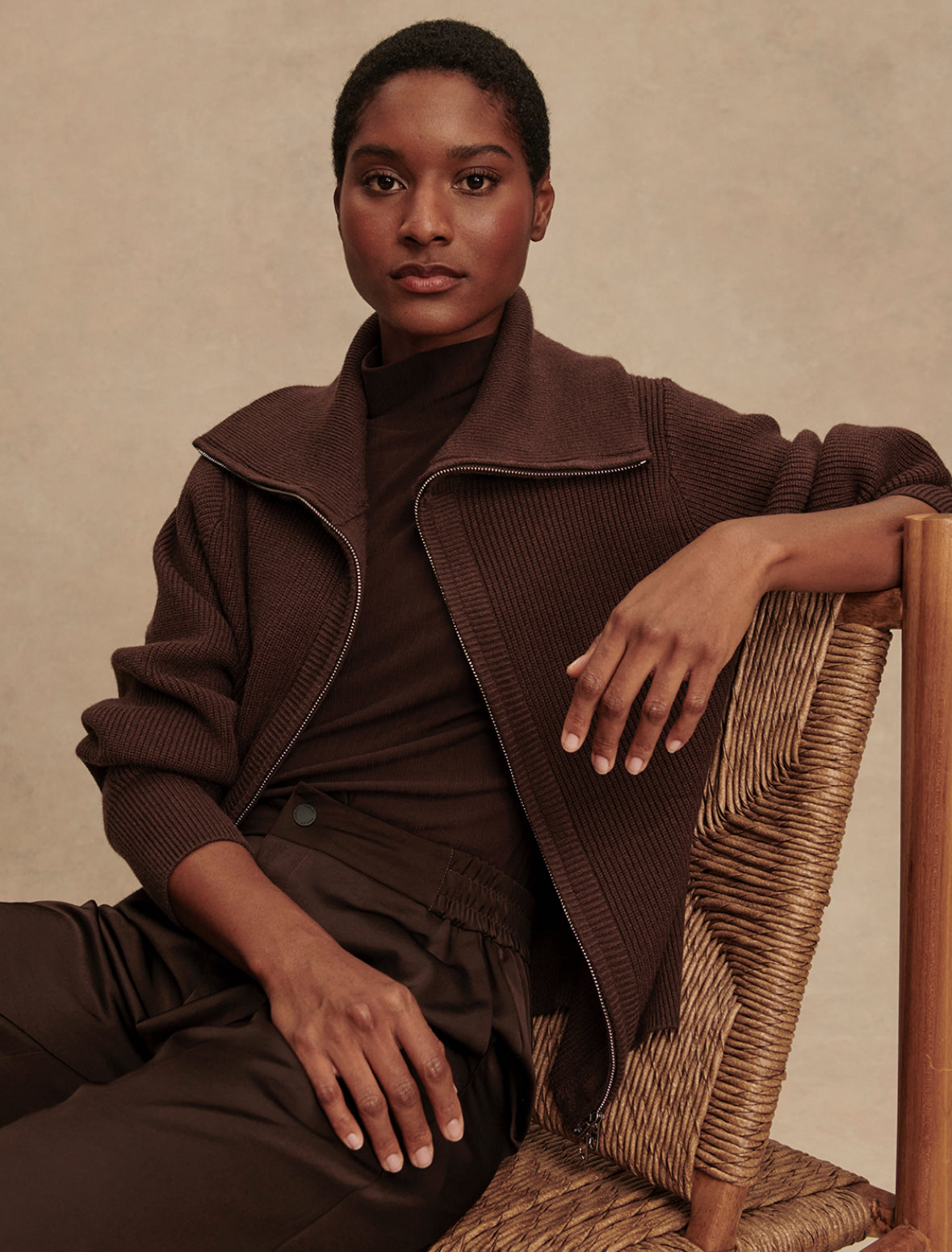 Layer up in the Enrico, a soft knit jacket that blends versatility with comfort. Crafted from our Soft Viscose yarn in a mid-gauge, all-over rib stitch, it has a more substantial feel, perfect for cool weather layering. Complete with a double-ended zip, a fold-back collar, and fashioned armhole trims.
