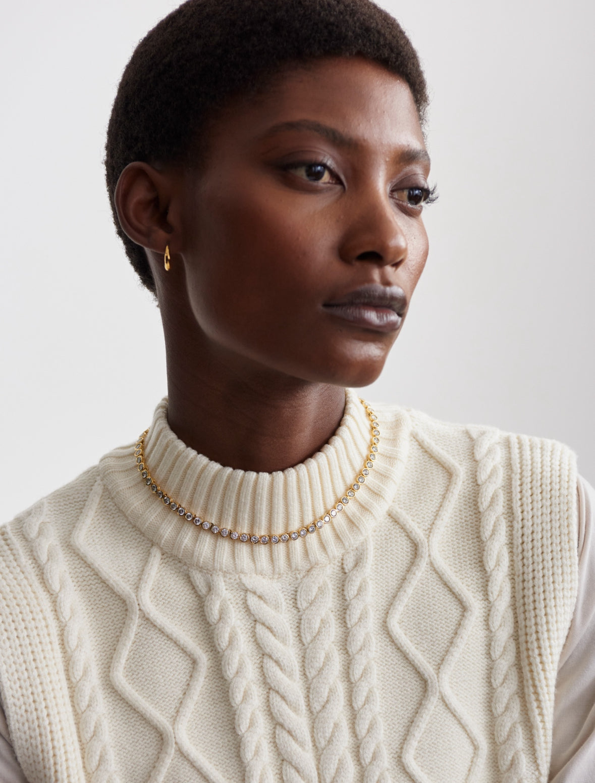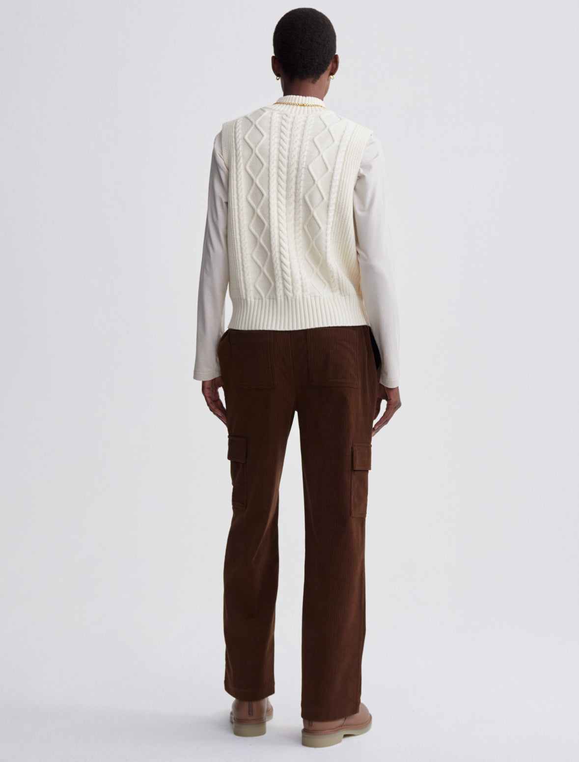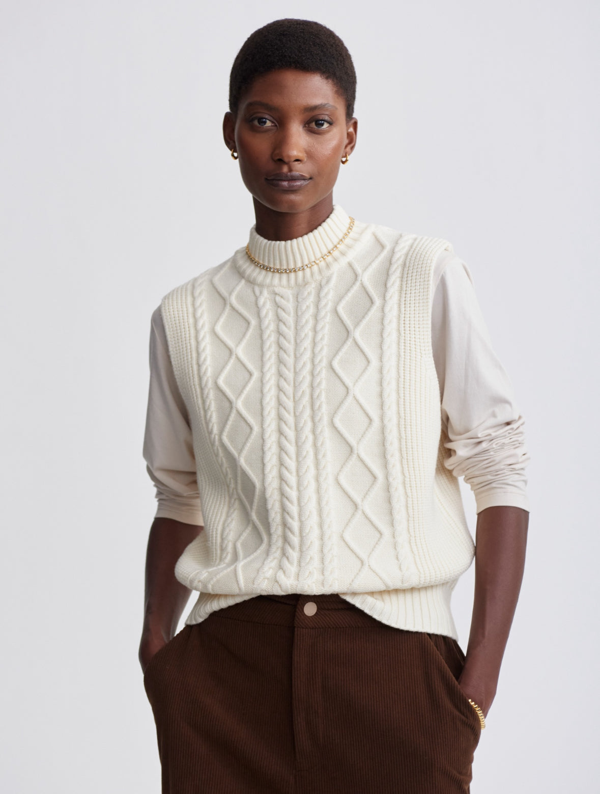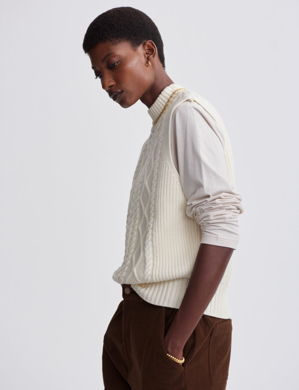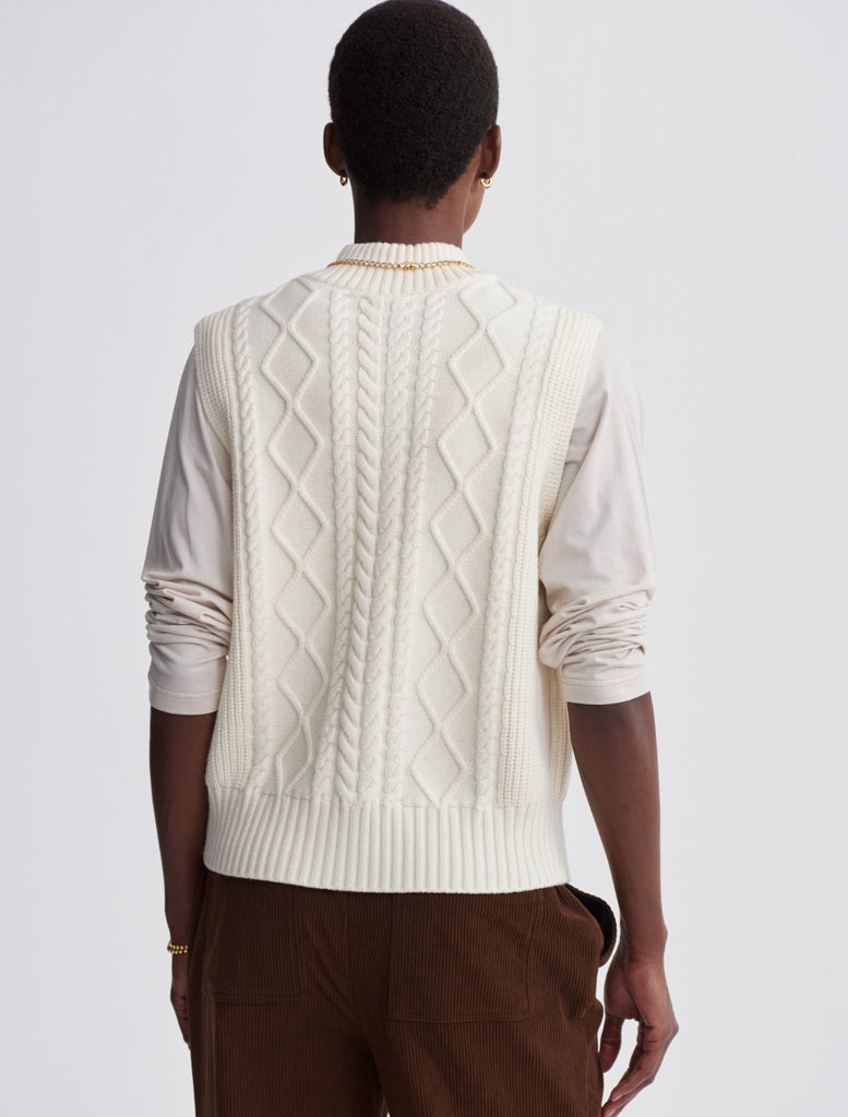 An elegant cable knit design, ideal for layering over tees and long sleeve tops. With its relaxed fit, placement cable design, and dropped armholes, this sleeveless piece is a must-have for any transitional wardrobe.