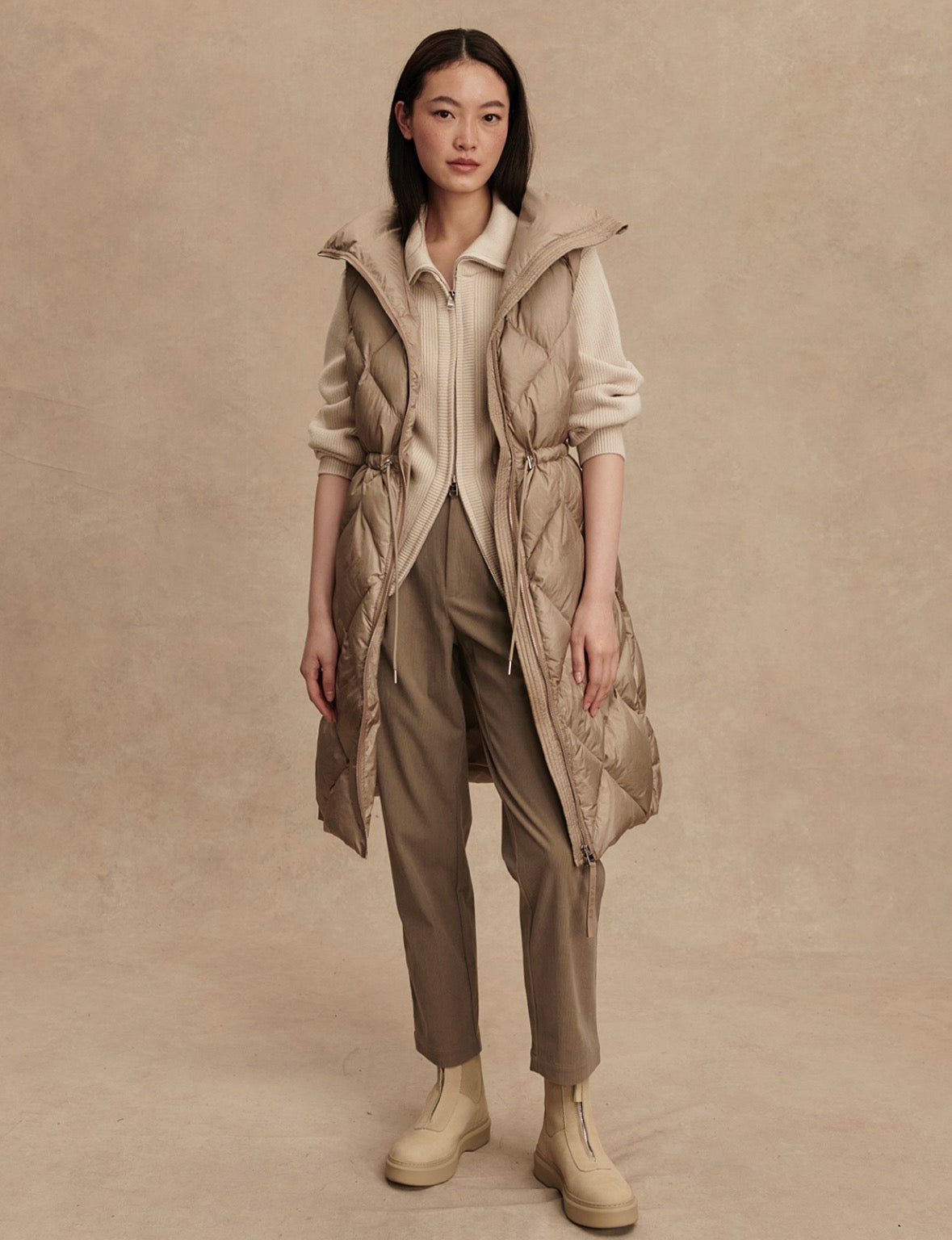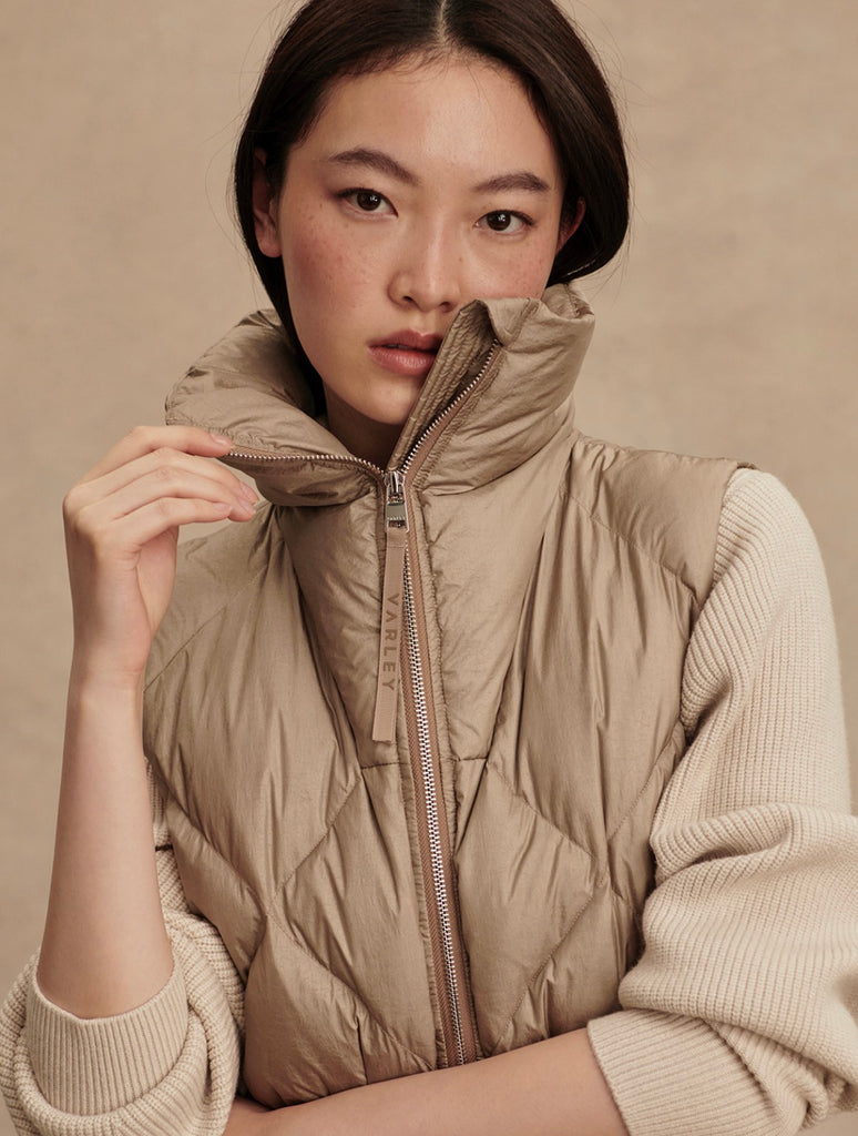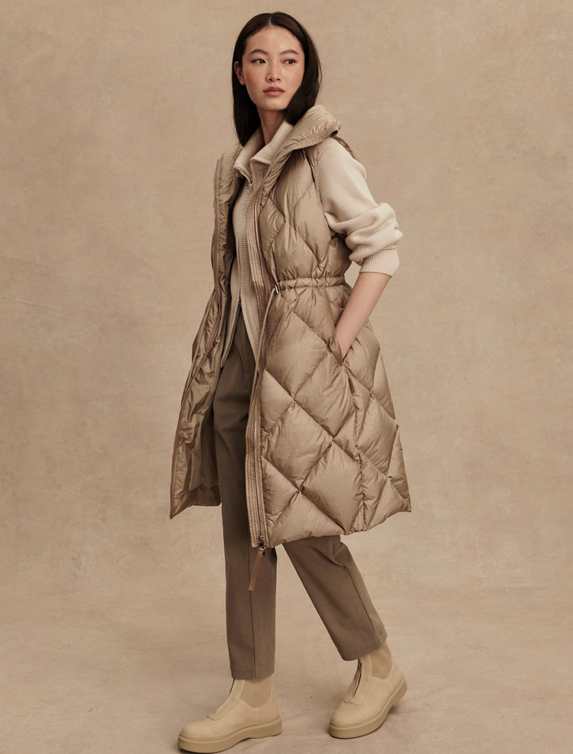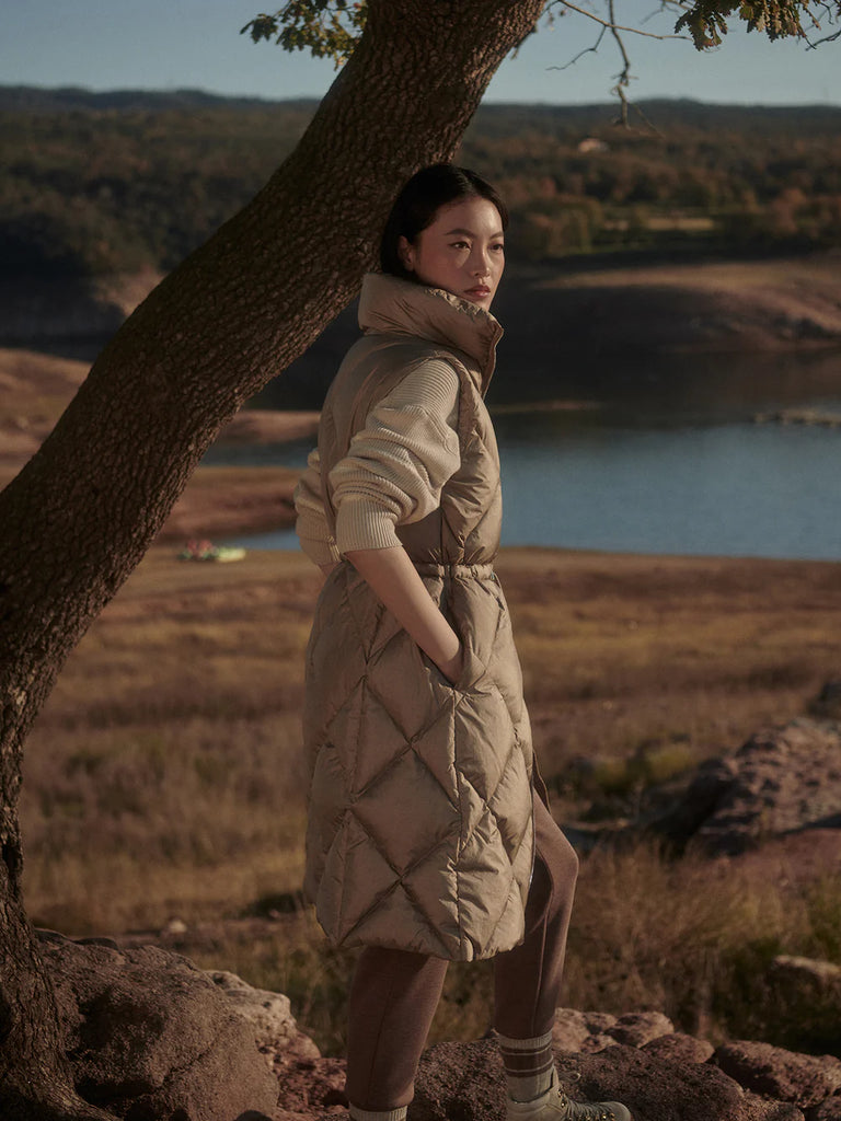 Cut to a contemporary longline shape, this gilet is the perfect piece to layer over knits when transitioning into colder months. The Navine is crafted from our Pearlized Crinkle Nylon fabric in a diamond quilt design, complete with fleece-lined pockets and a premium down fill that's both warm and lightweight. The chic design is accentuated with an exposed waist cinch, dye-to-match drawcords, and an oversized zip-through collar.