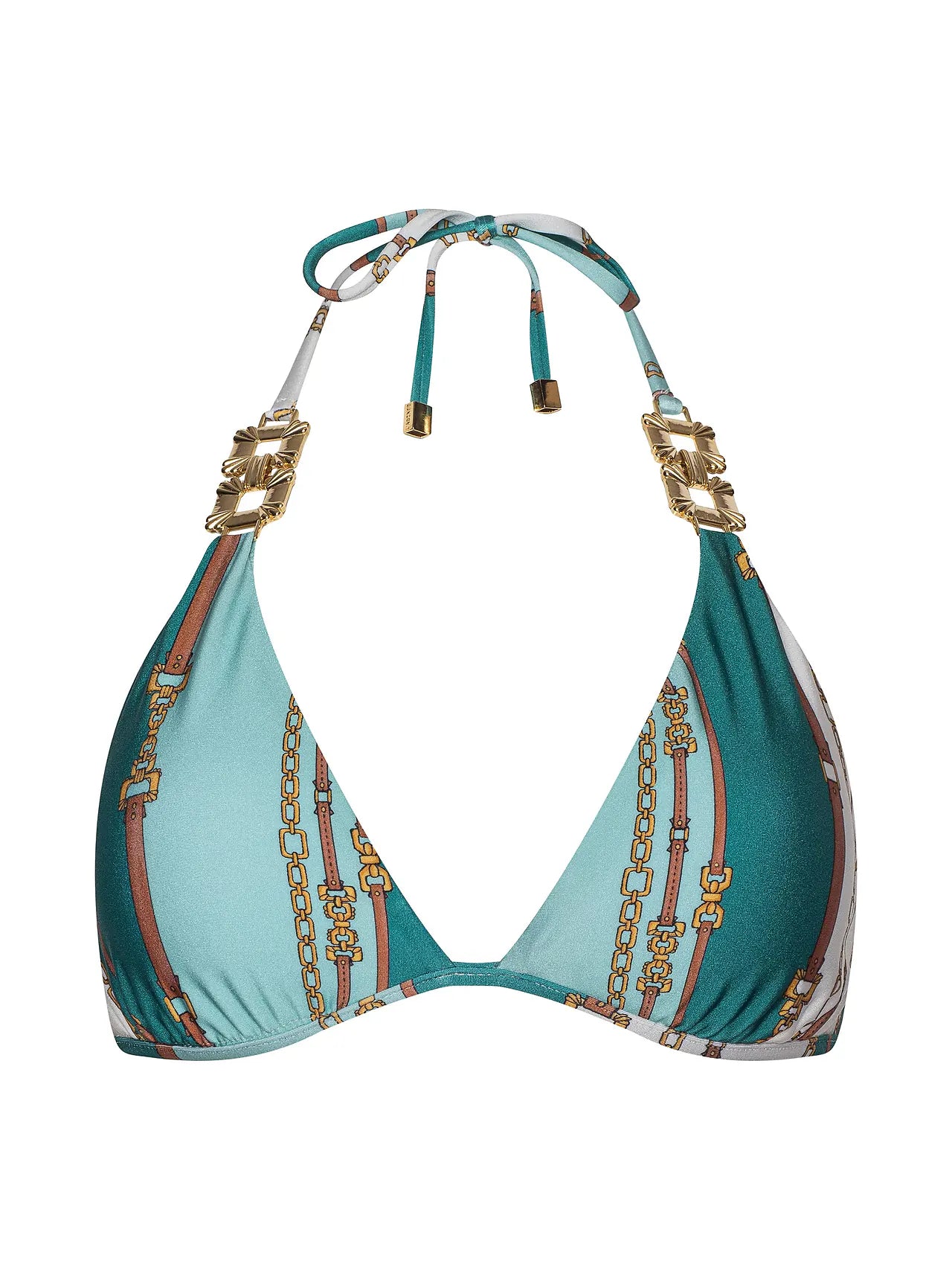 The Annabelle exudes understated glamour with its soothing sage hue, chic belt-stripe print, and gold deco accents at its straps. Its triangle silhouette and adjustable fit keep it timeless and flattering, while the luxe hardware adds just the right amount of edge.