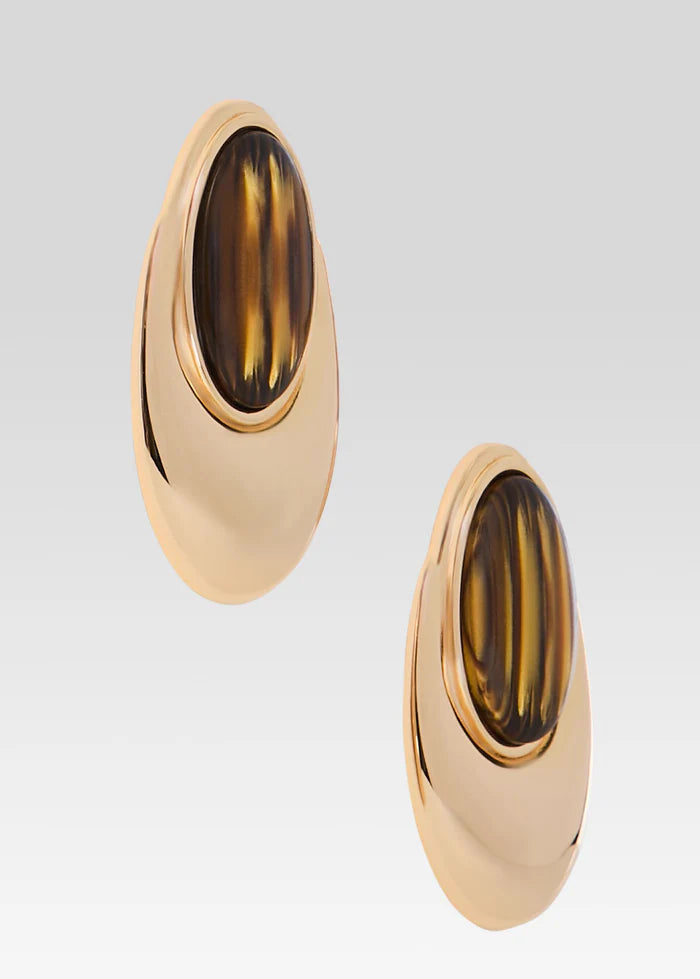 The Blare Earring is a statement piece featuring a luminous oval stone set on a delicate gold plated base. A distinctive overhang design creates a unique silhouette that reflects the light, adding subtle dimension. Shown here in Tigers Eye/Gold.