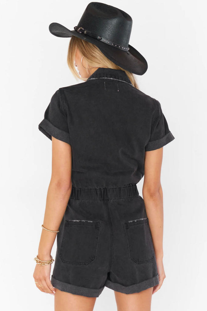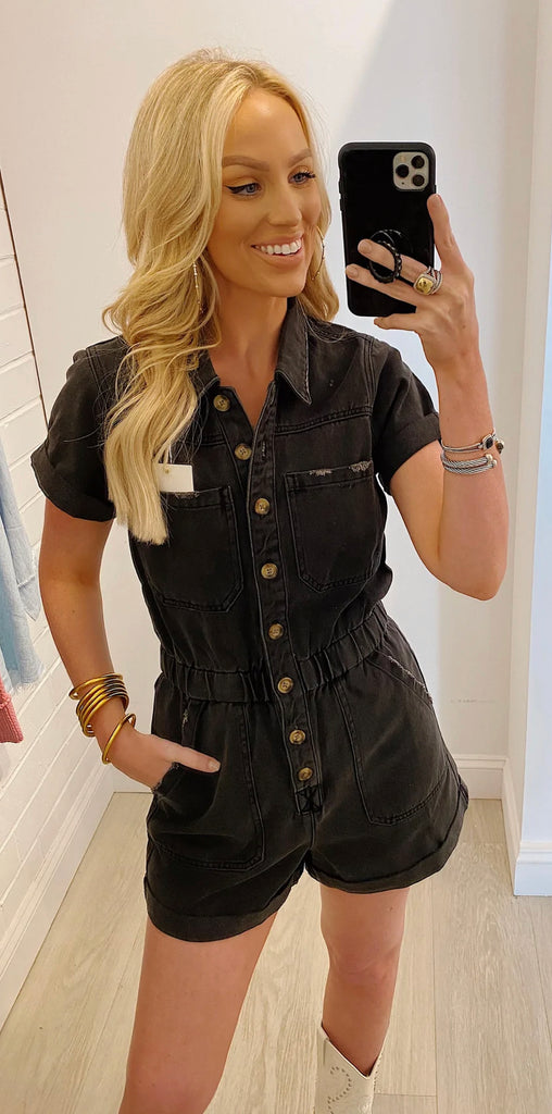 The Cannon is a washed black denim romper that is effortlessly chic and easy to throw on! Her button up front lets you control how much skin you show and her flattering elastic waist keeps her a little more fitted while still being comfortable.