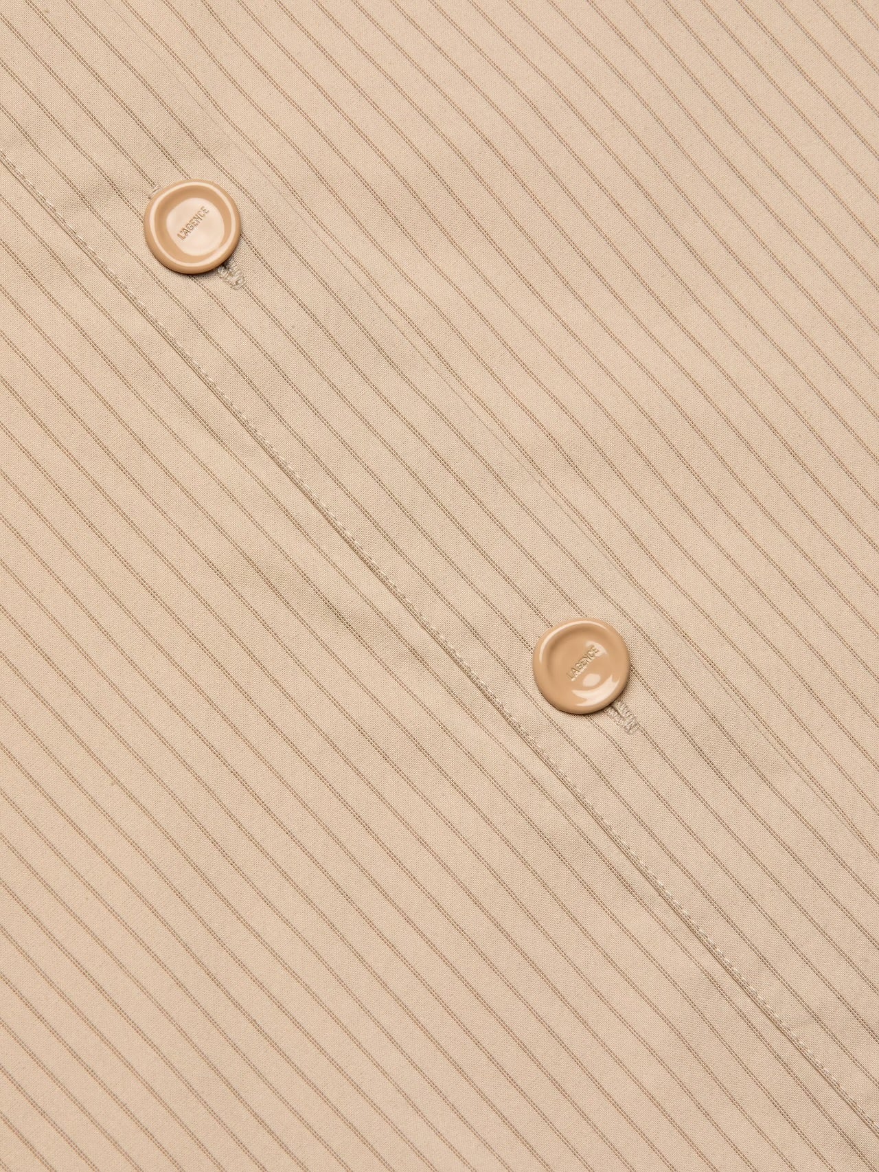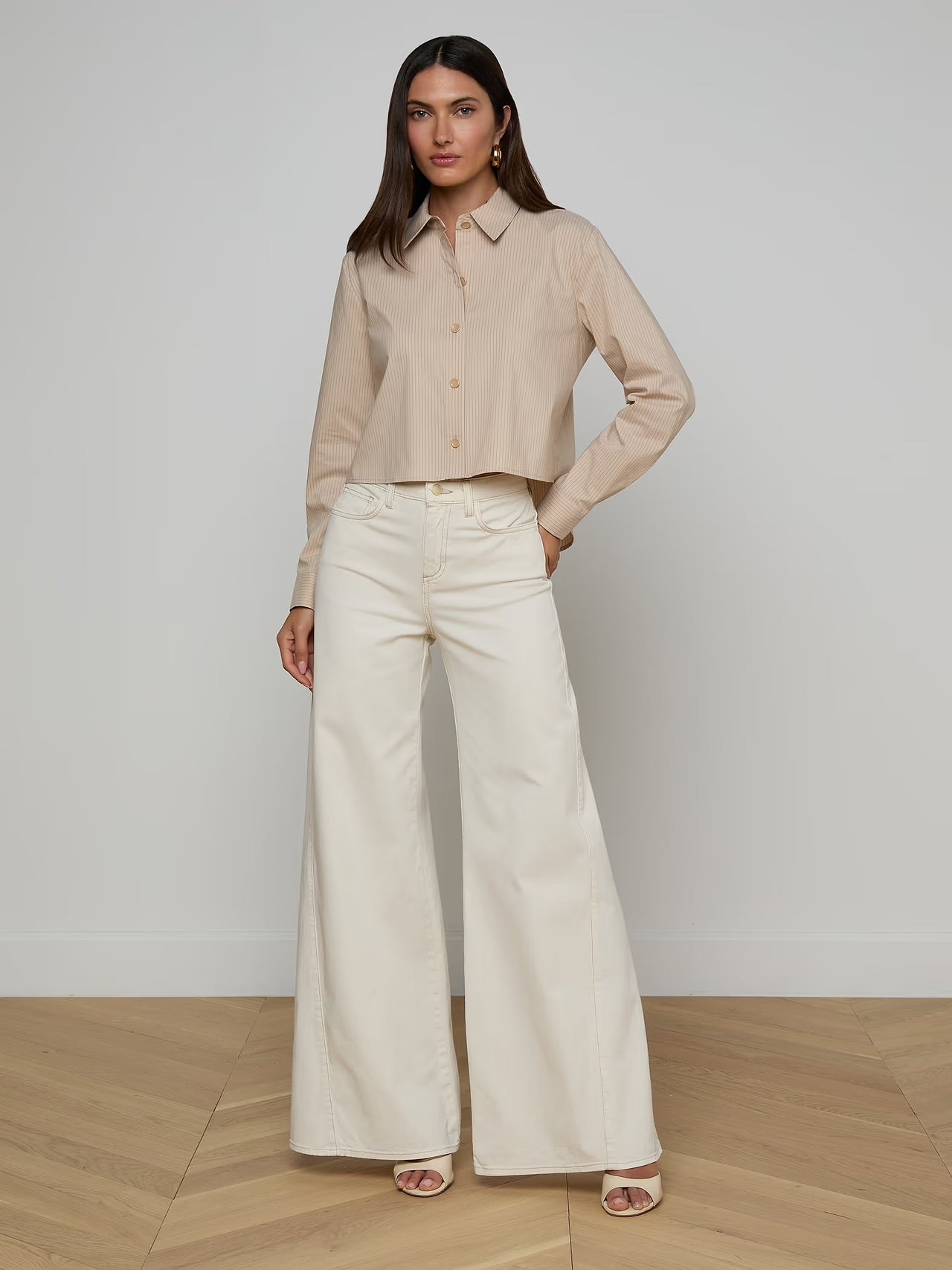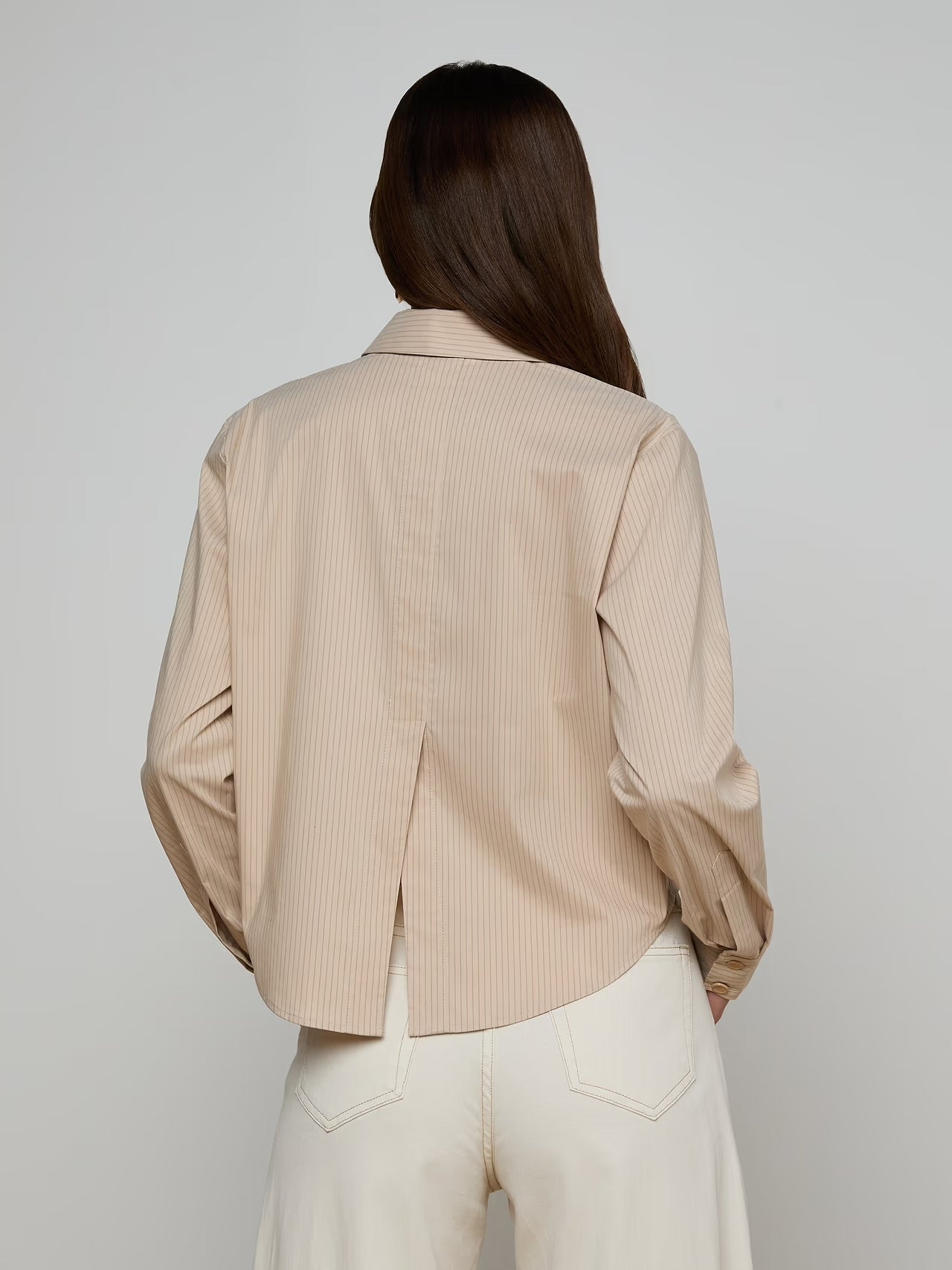 A classic tailored shirt with a cool, borrowed-from-the-boys fit and cropped high-low hem. Now back in neutral tan with a subtle pinstripe.