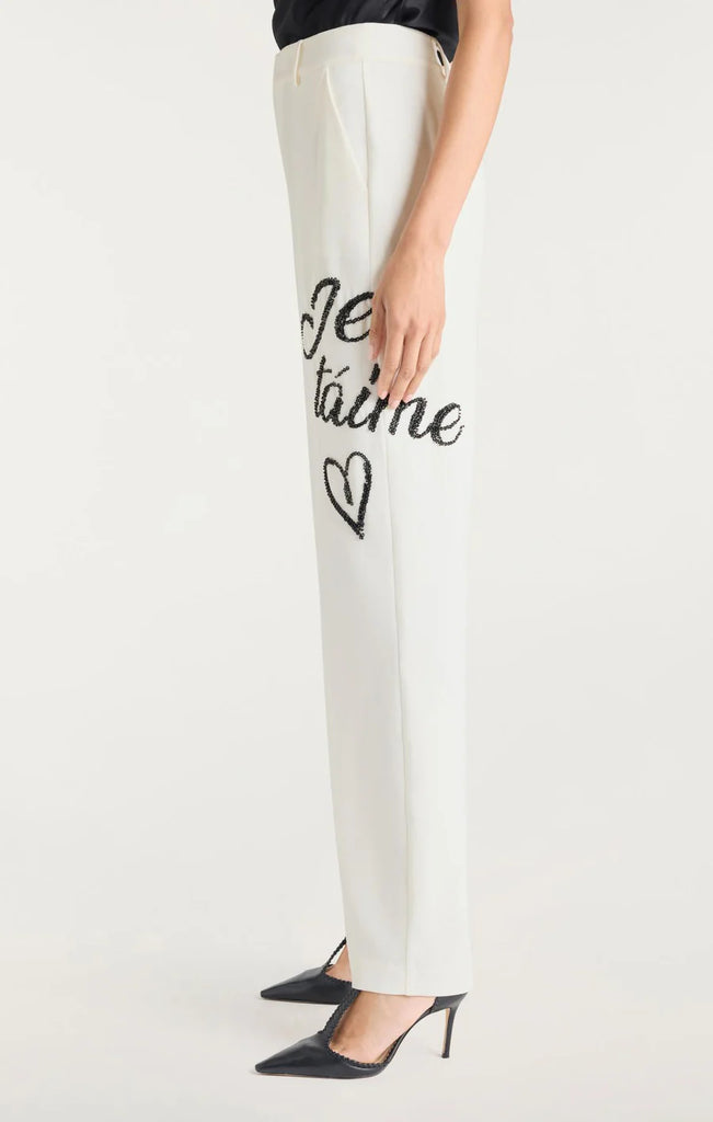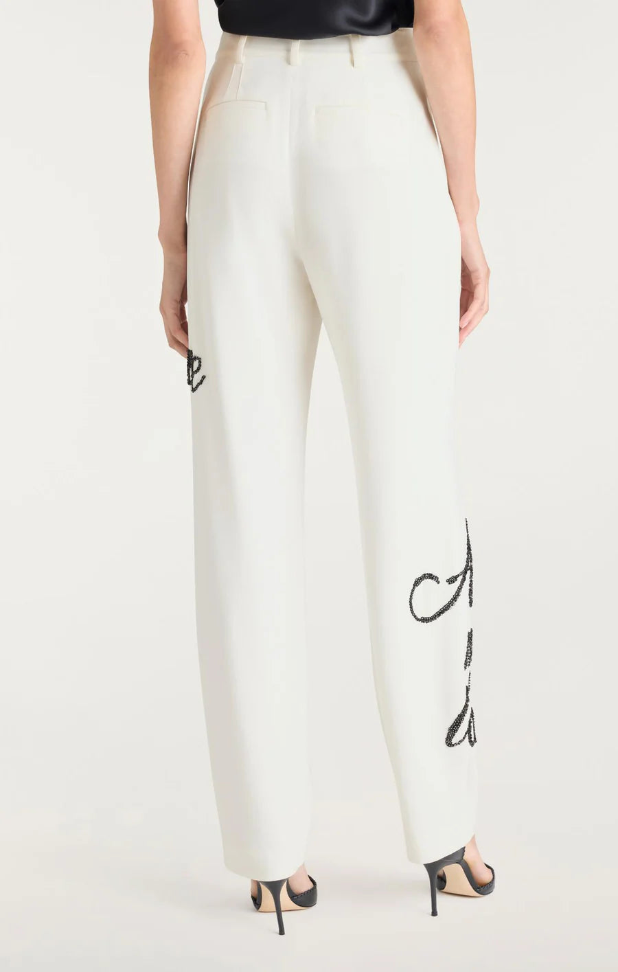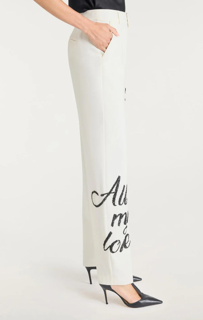 The Crushed Sequin Loveletter Collins Pant features elegant crushed sequin detailing that forms French cursive writing across the fabric. This stylish design adds a refined sparkle and a unique touch, making these pants a standout piece for any fashionable wardrobe.