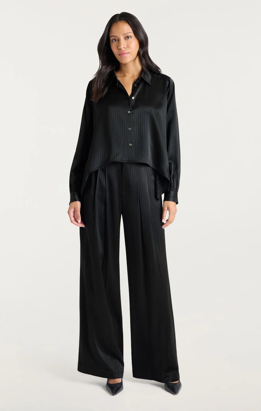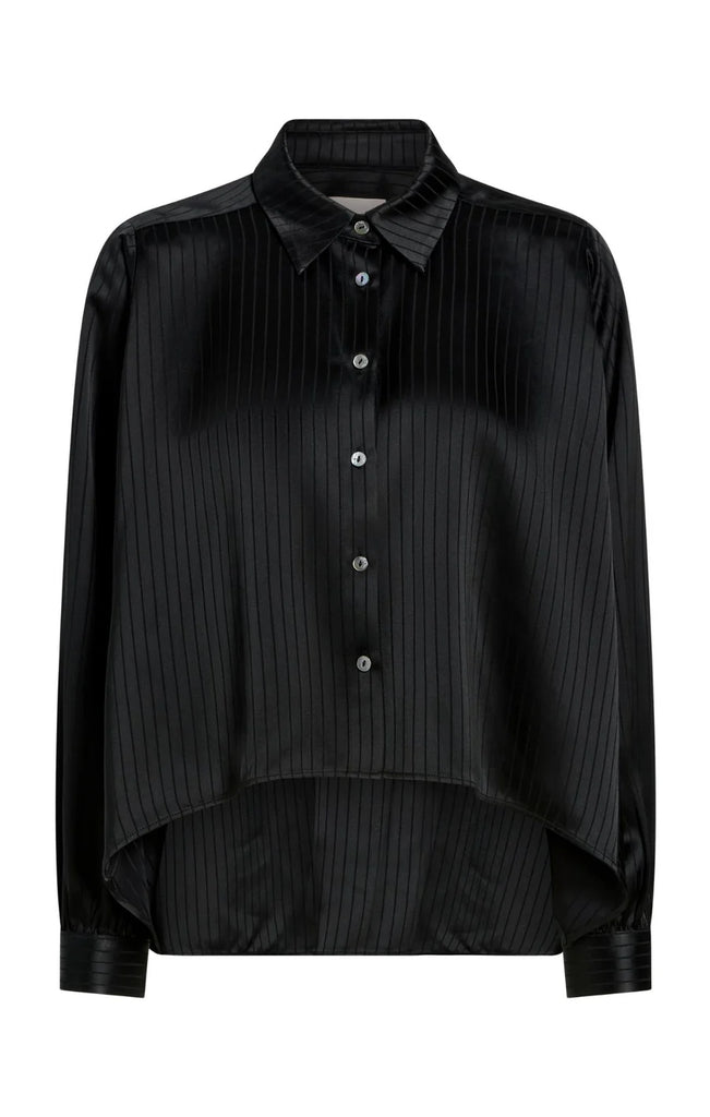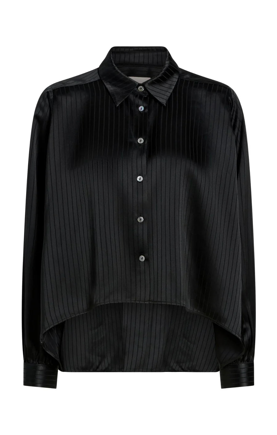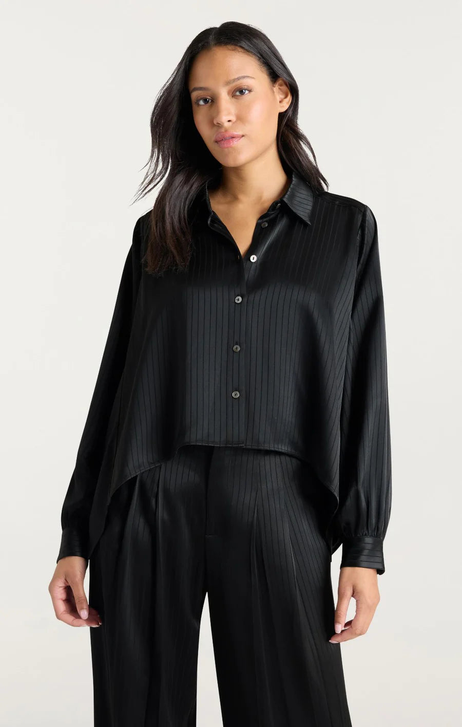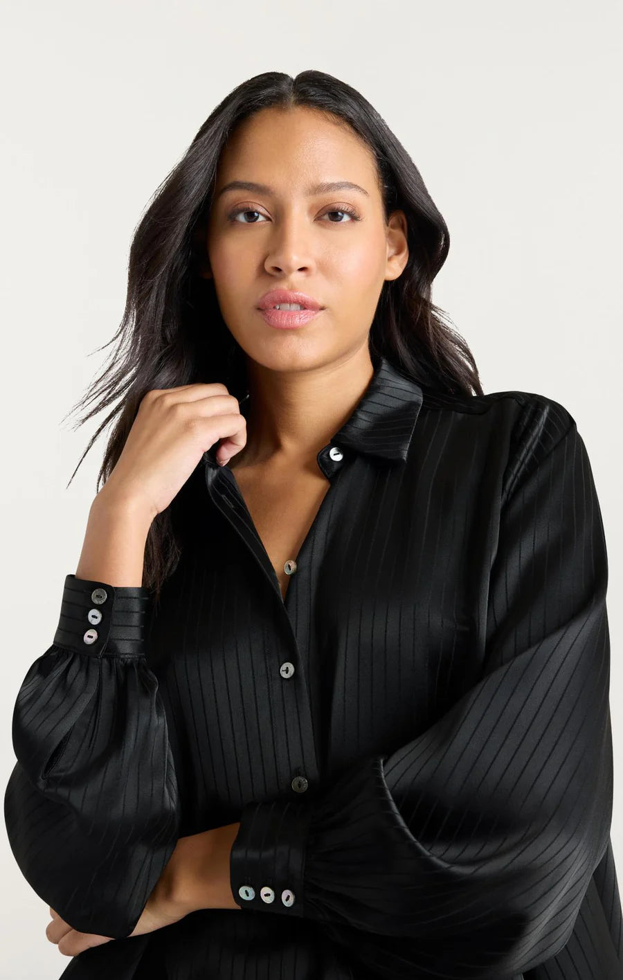 The Georgia Satin Stripe Gasira Top features a subtly striped design with a button-up front and classic collar. Its long sleeves and smooth satin texture make it perfect for both work settings and everyday wear, offering a stylish yet comfortable option that complements any wardrobe.
