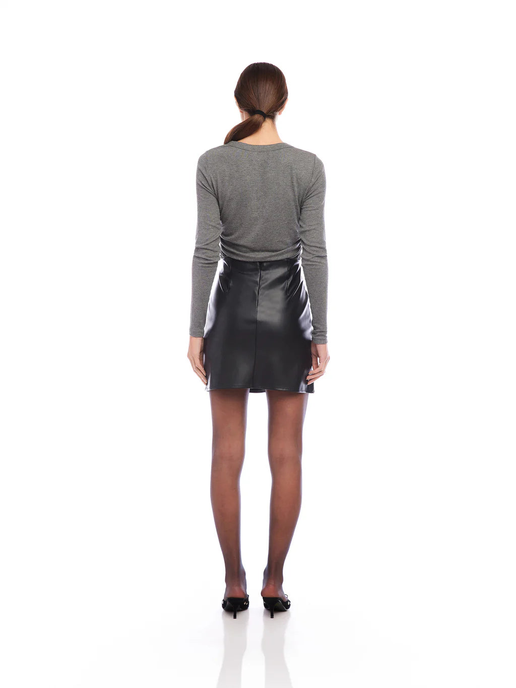 The Macy Mini skirt is expertly crafted with soft faux leather material for a trendy and comfortable fit. With an elasticized waist and zipper closure, this skirt offers easy wear and a secure fit. The front slit detail adds a touch of style to this versatile piece.