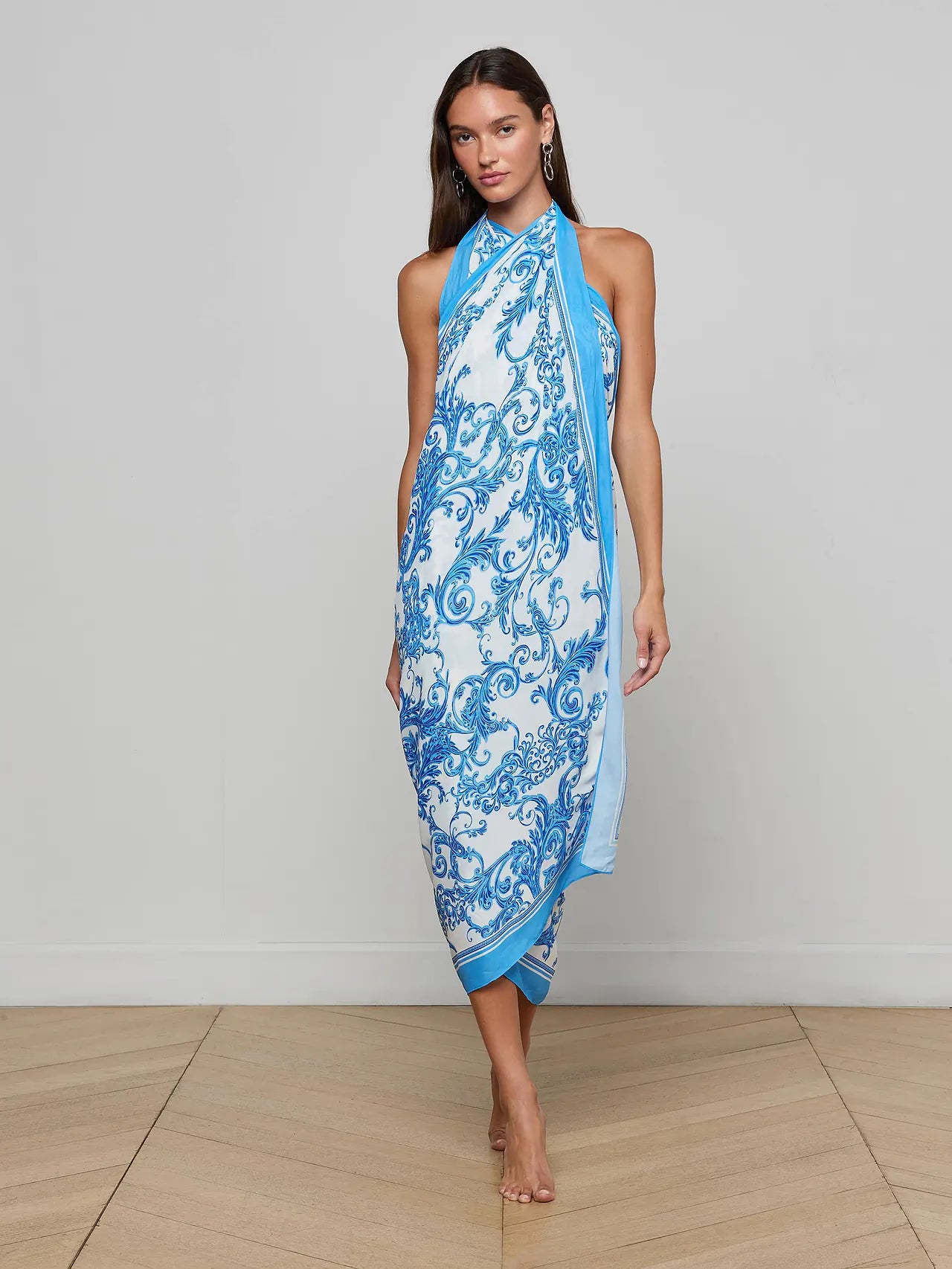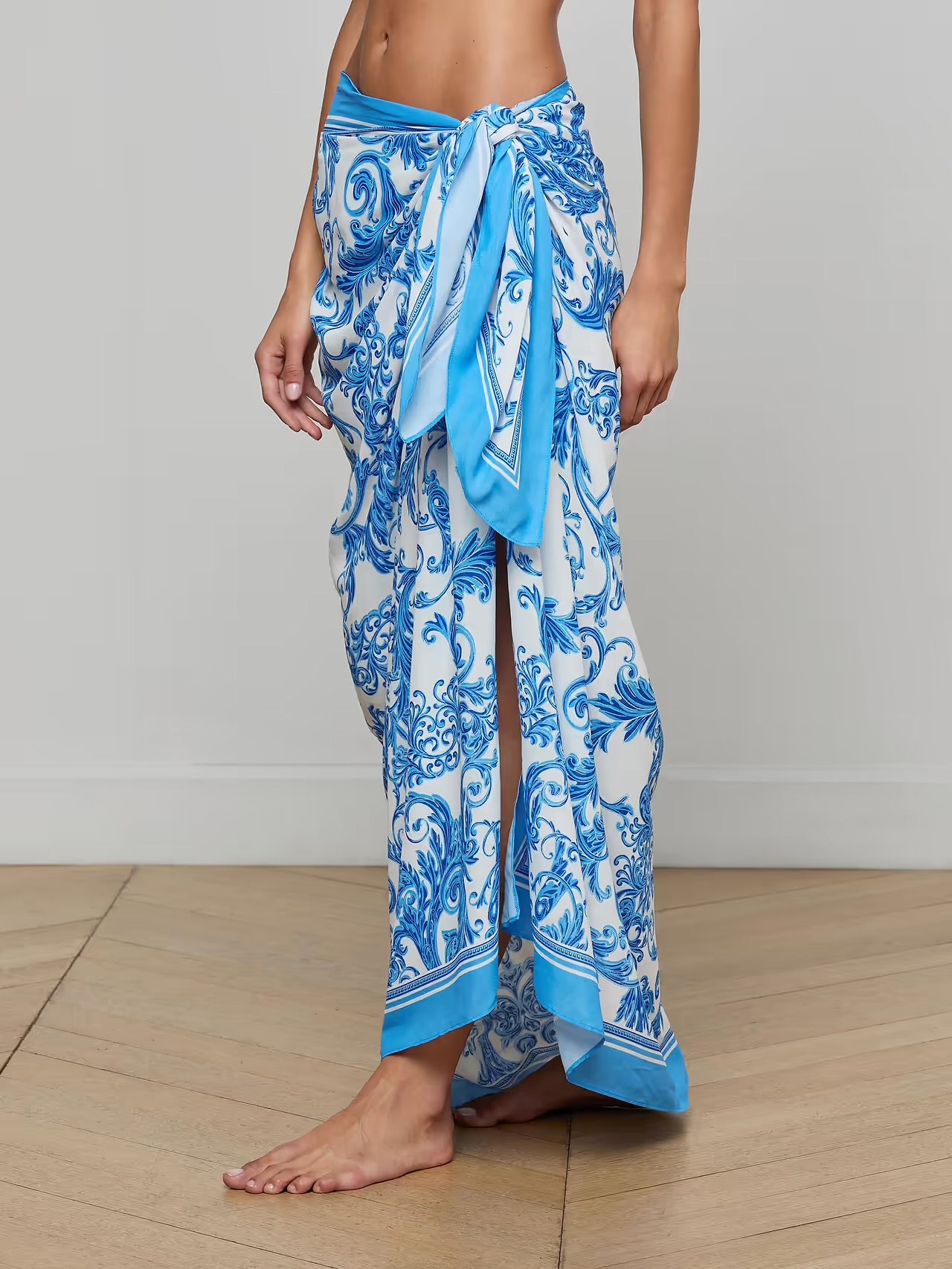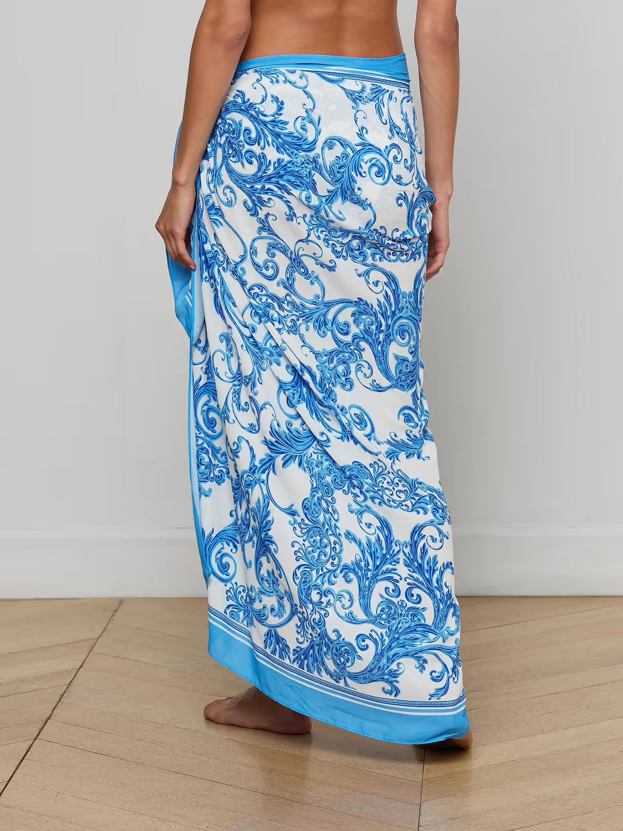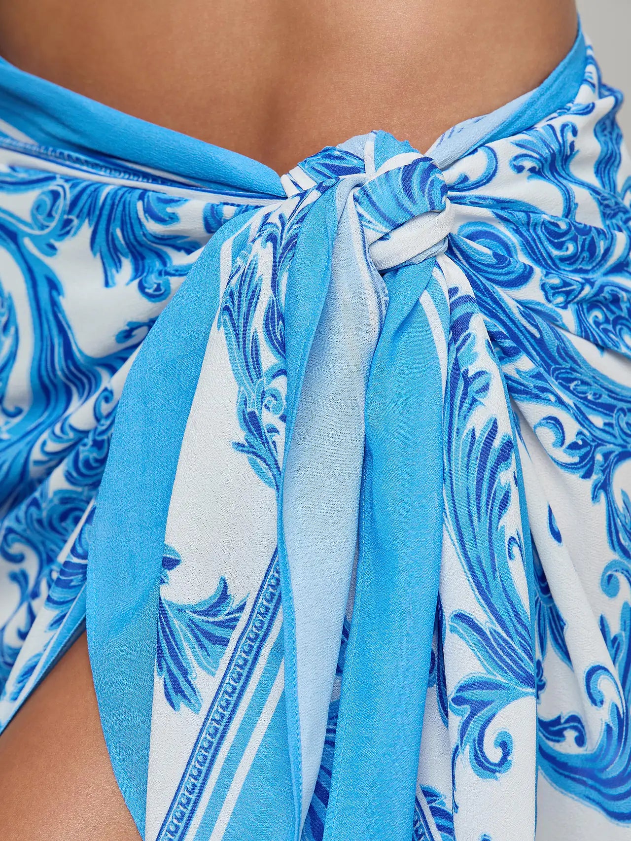 The Maribel pareo, now in a striking blue baroque print, offers endless versatility. Wear it tied at the side as a skirt or transform it into a halter or sweetheart dress. Whichever way you wear it, the Maribel captures effortless sophistication with a touch of vintage glamour.
