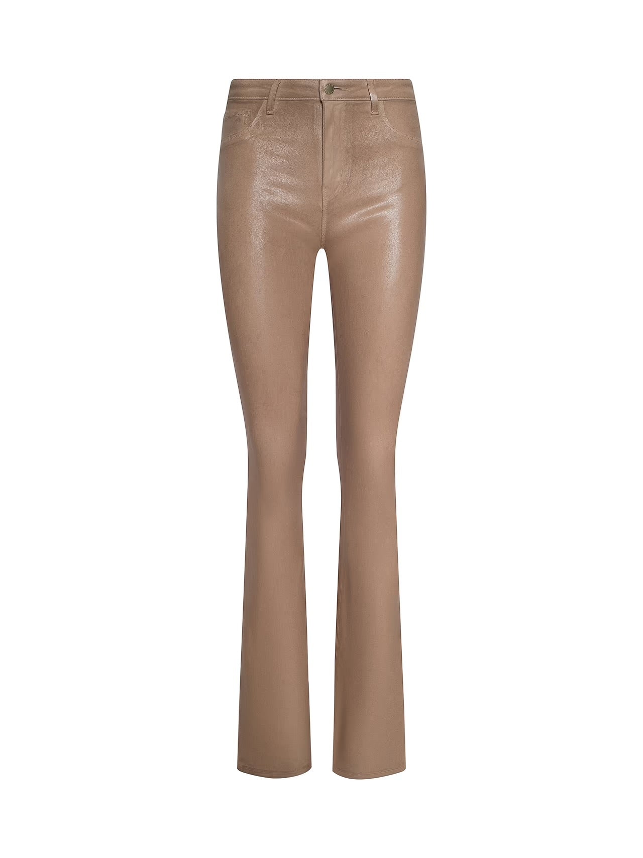 A perfectly proportioned fit in a modern fabrication. The Marty flare jean is now back in a neutral tan shade of our leather alternative coated denim.