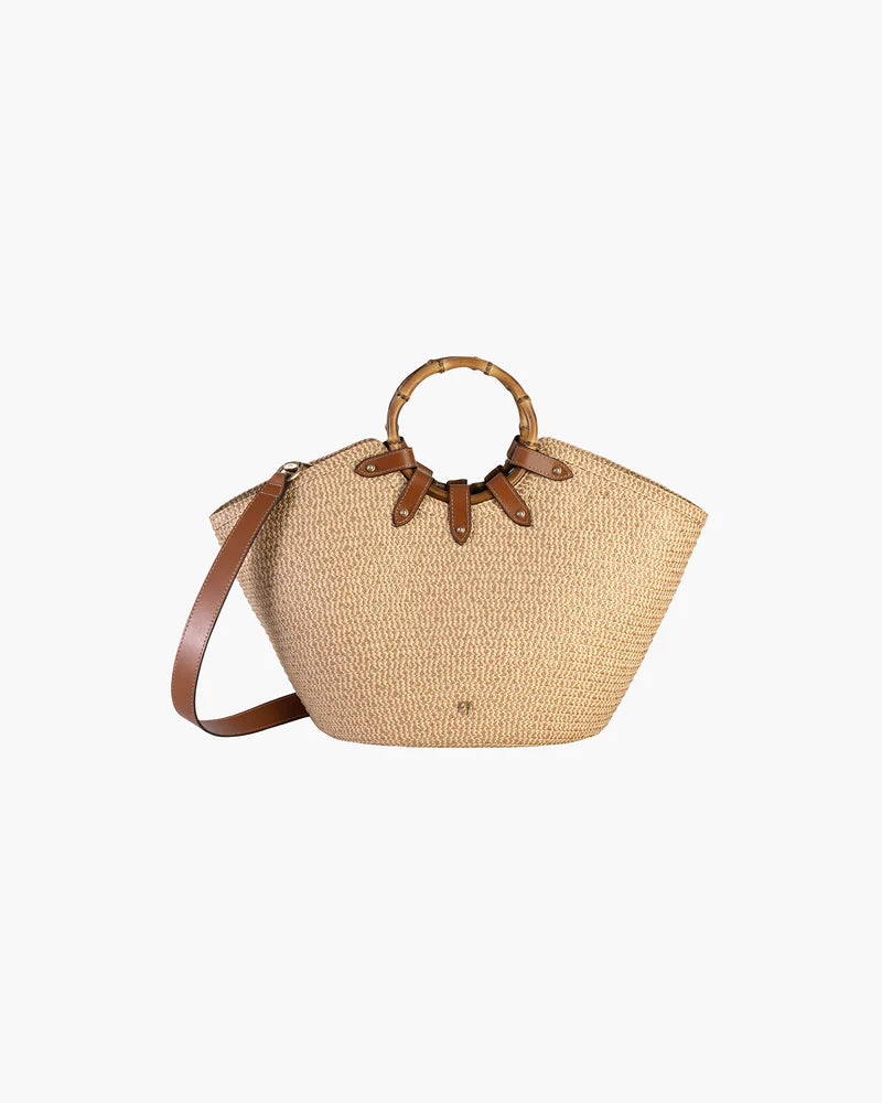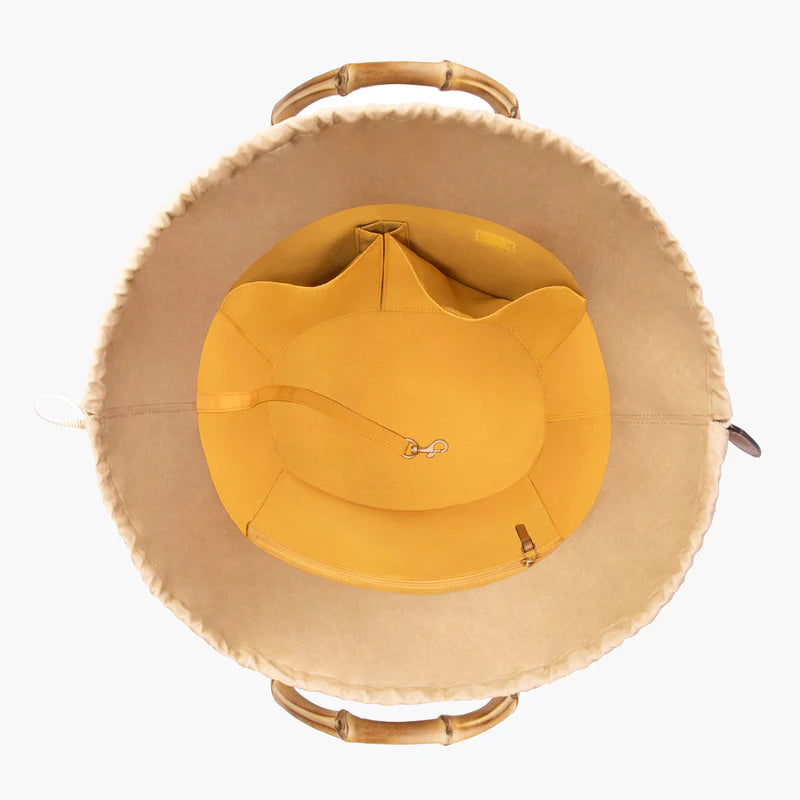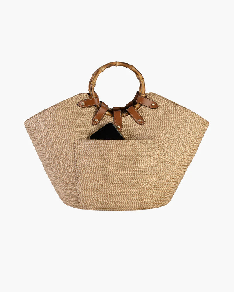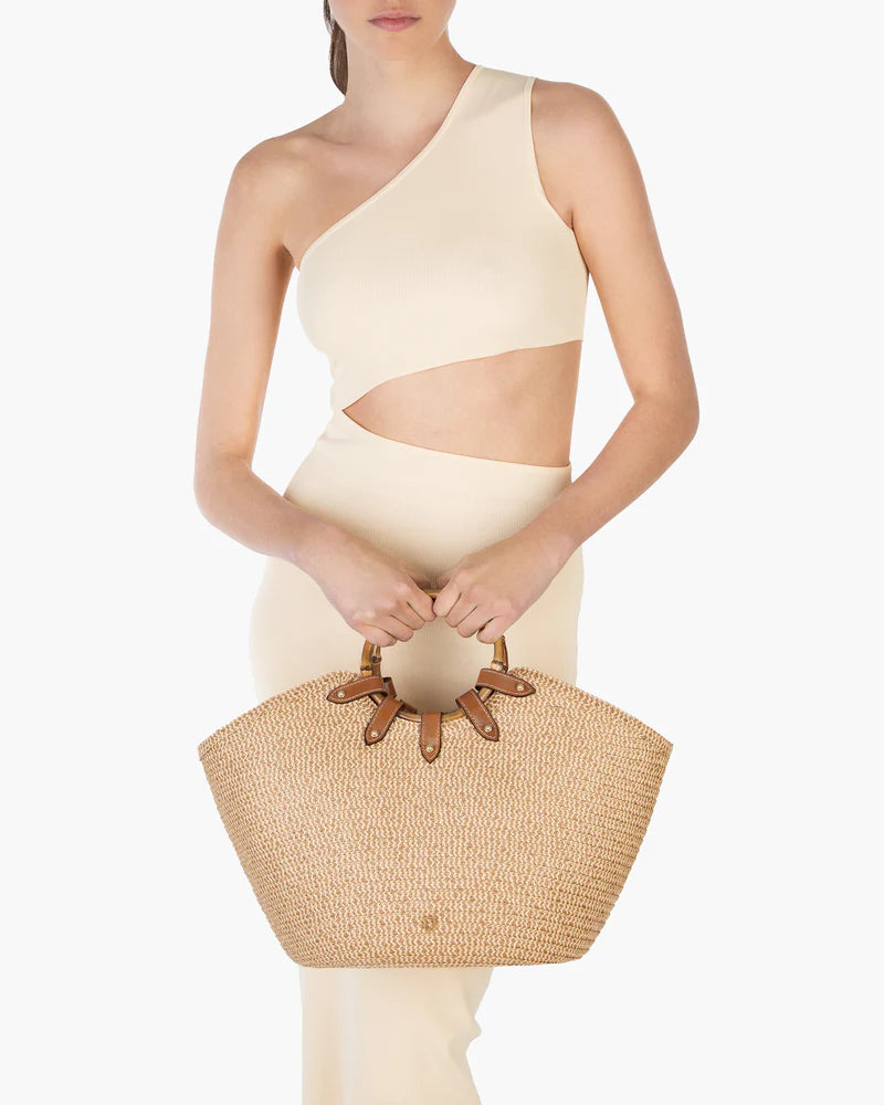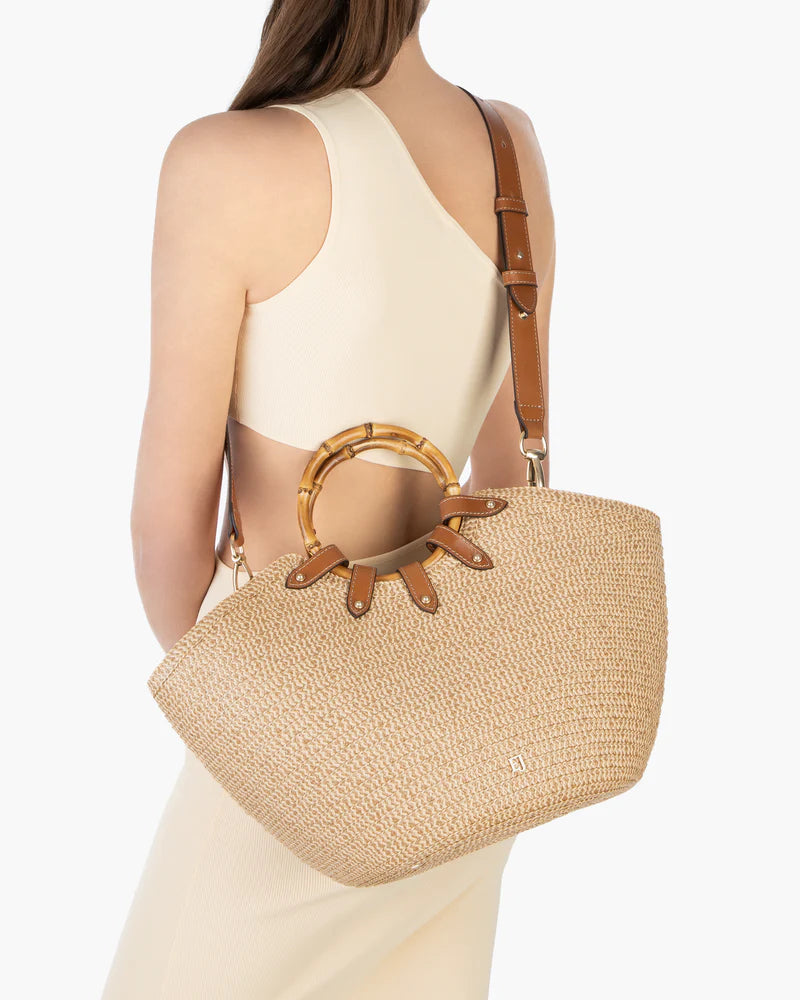 This large, (but still elegant) boat-shaped designer tote for sale, made of leather-trimmed Squishee®, features dual bamboo ring short handles, a draw-string pouch top closure, and a detachable leather strap that easily adjusts from shoulder to cross-body length. Other features include protective bottom feet, and a convenient outer patch pocket for easy access to phone, sunglasses, and passport.