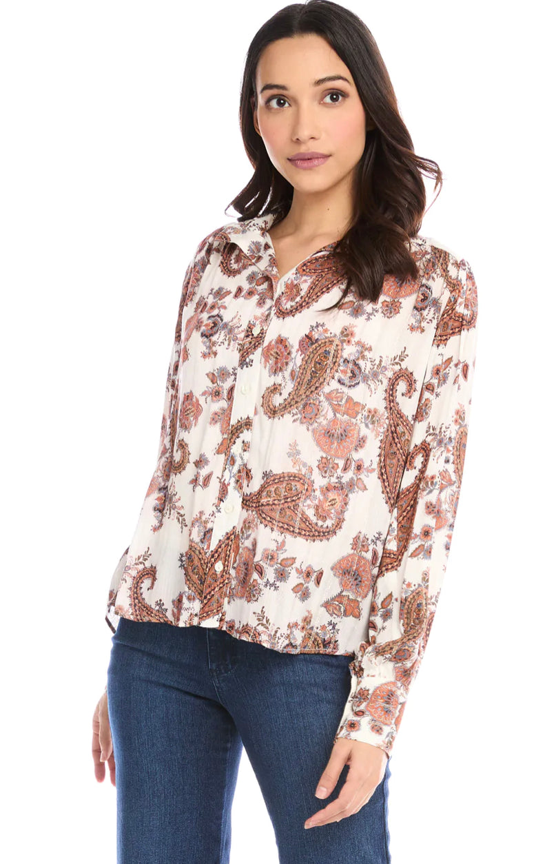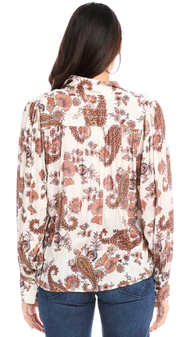 This elevated blouse with shirring is polished yet fun with a bold paisley print.