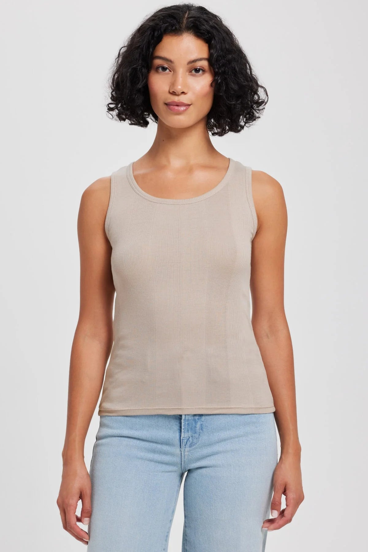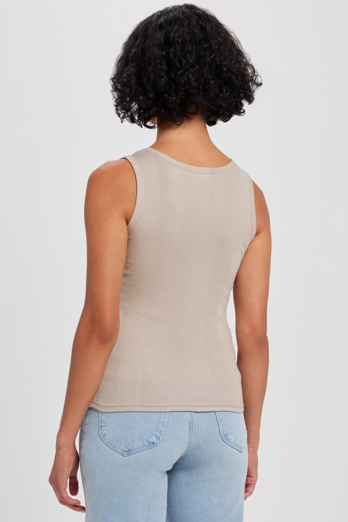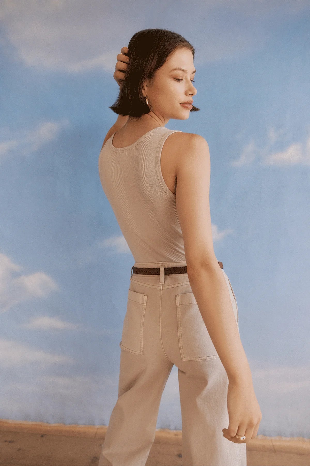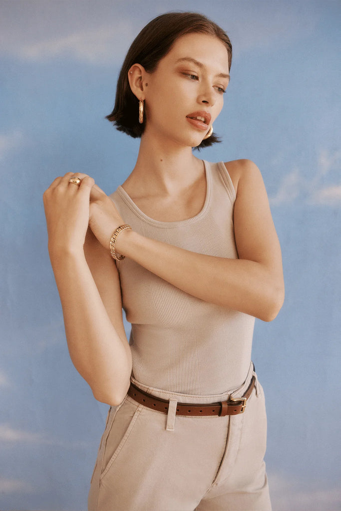 Cool like that: a perfect crew-neck tank you’ll reach for repeatedly. She has a variegated-rib knit that feels both nostalgic and modern.