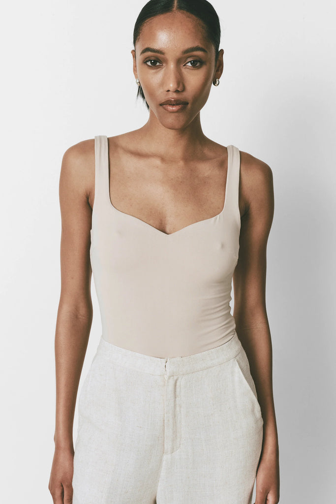 Bodysuit with soft sweetheart neckline / Wide strips / Silky, cool fabric feel